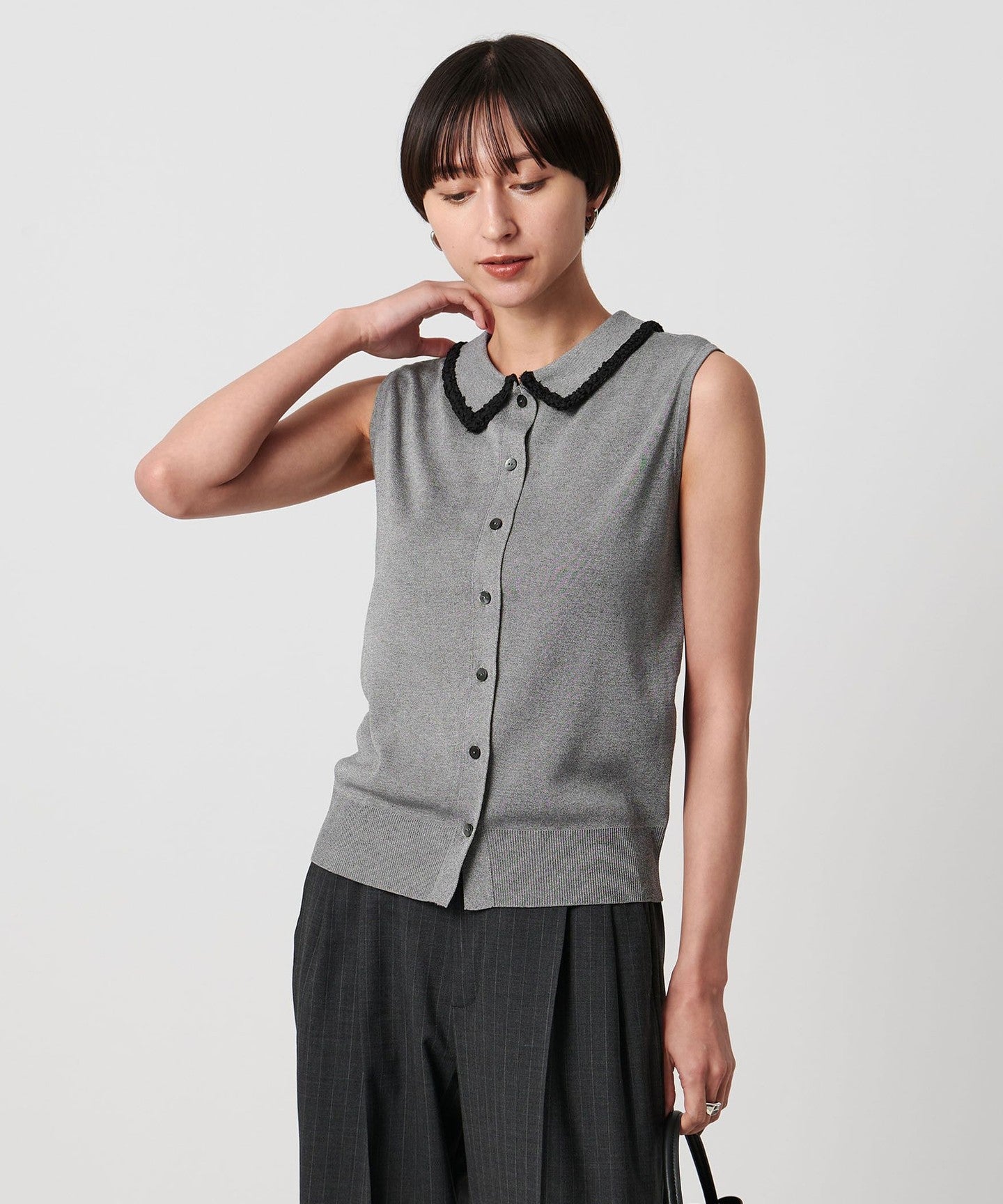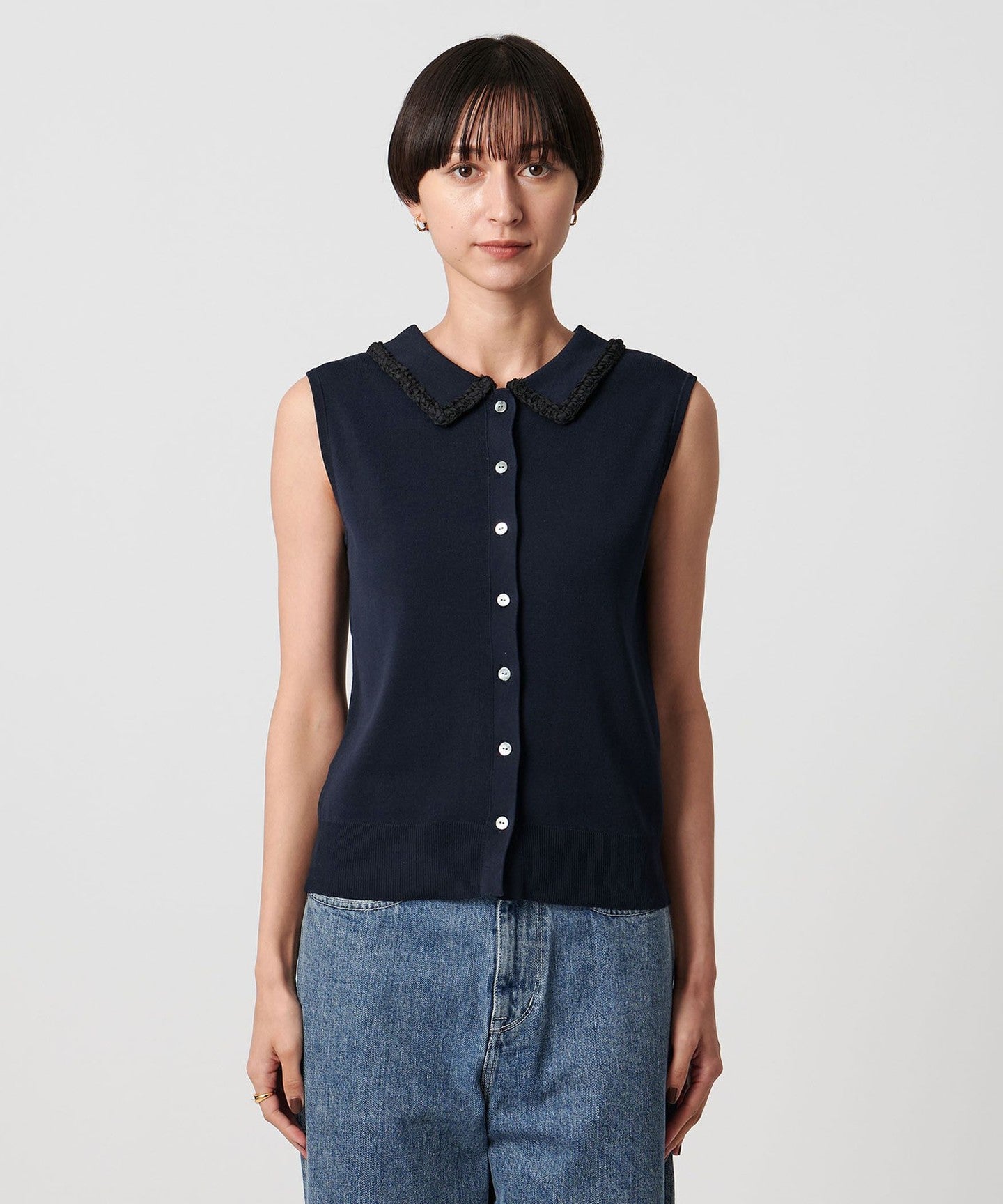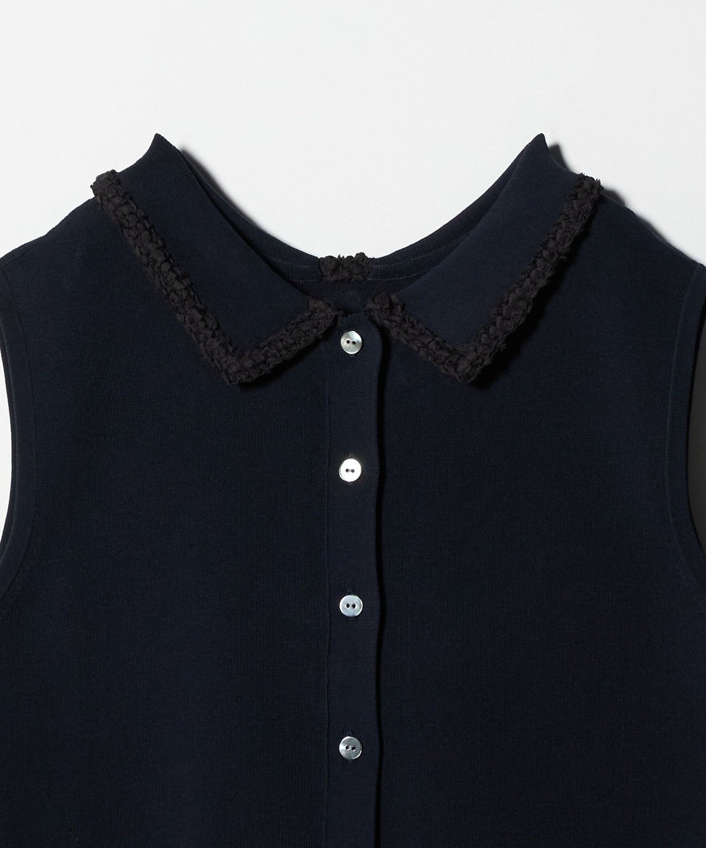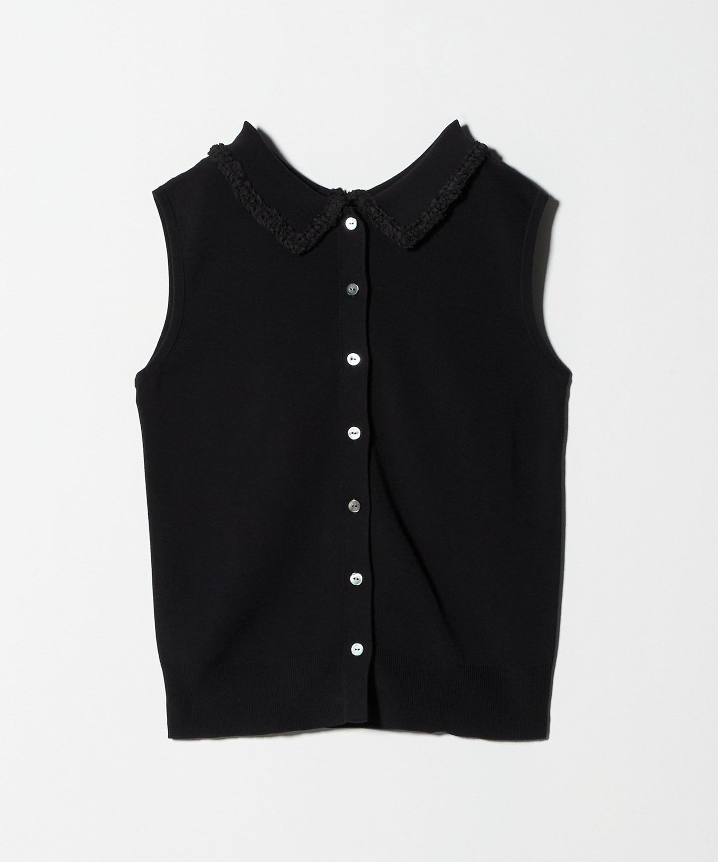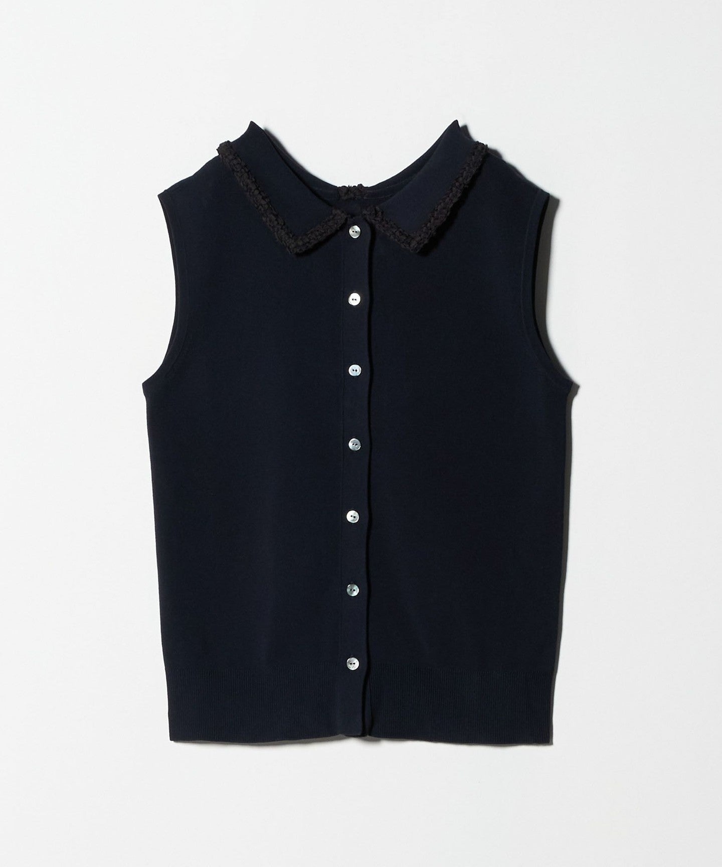 A sleeveless knit with crocheted tape around the collar as an accent design.