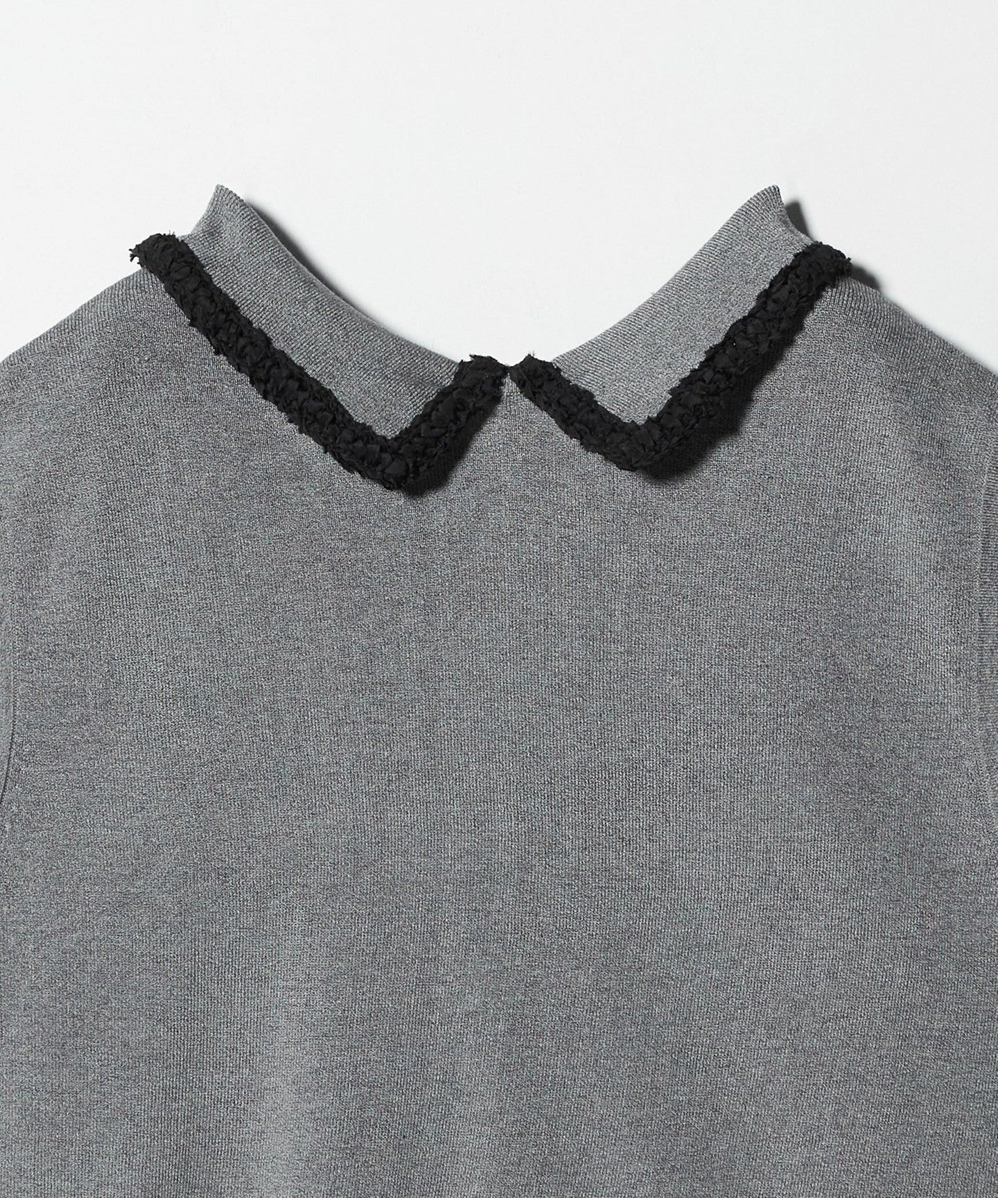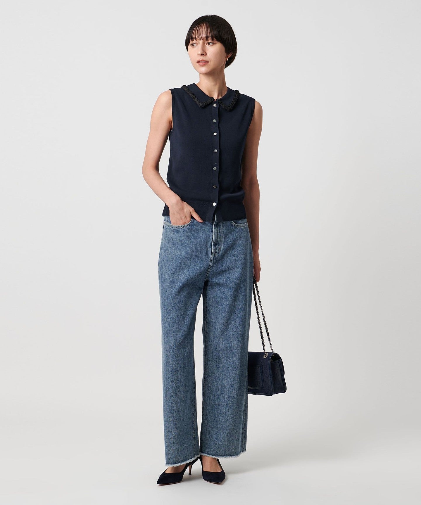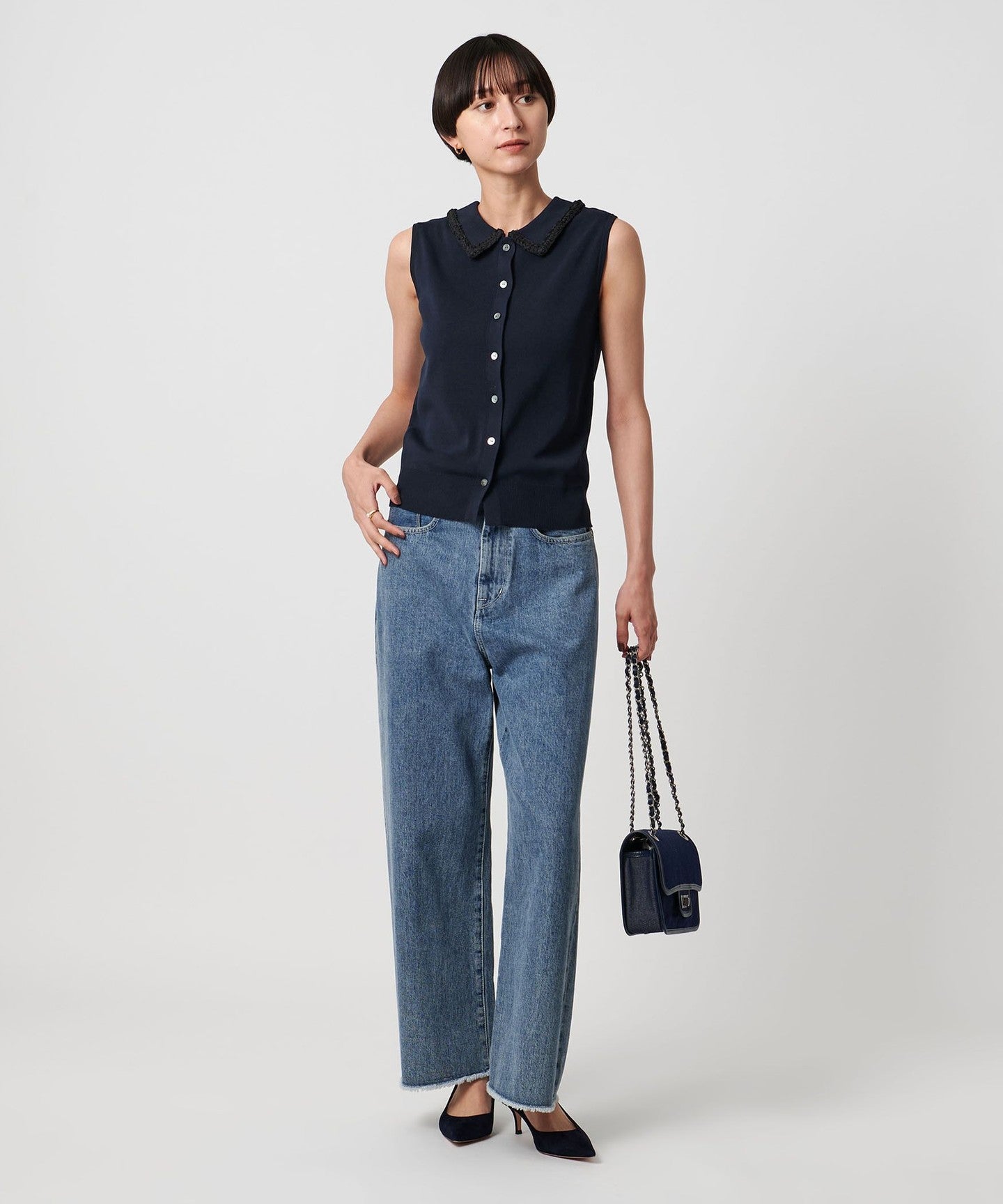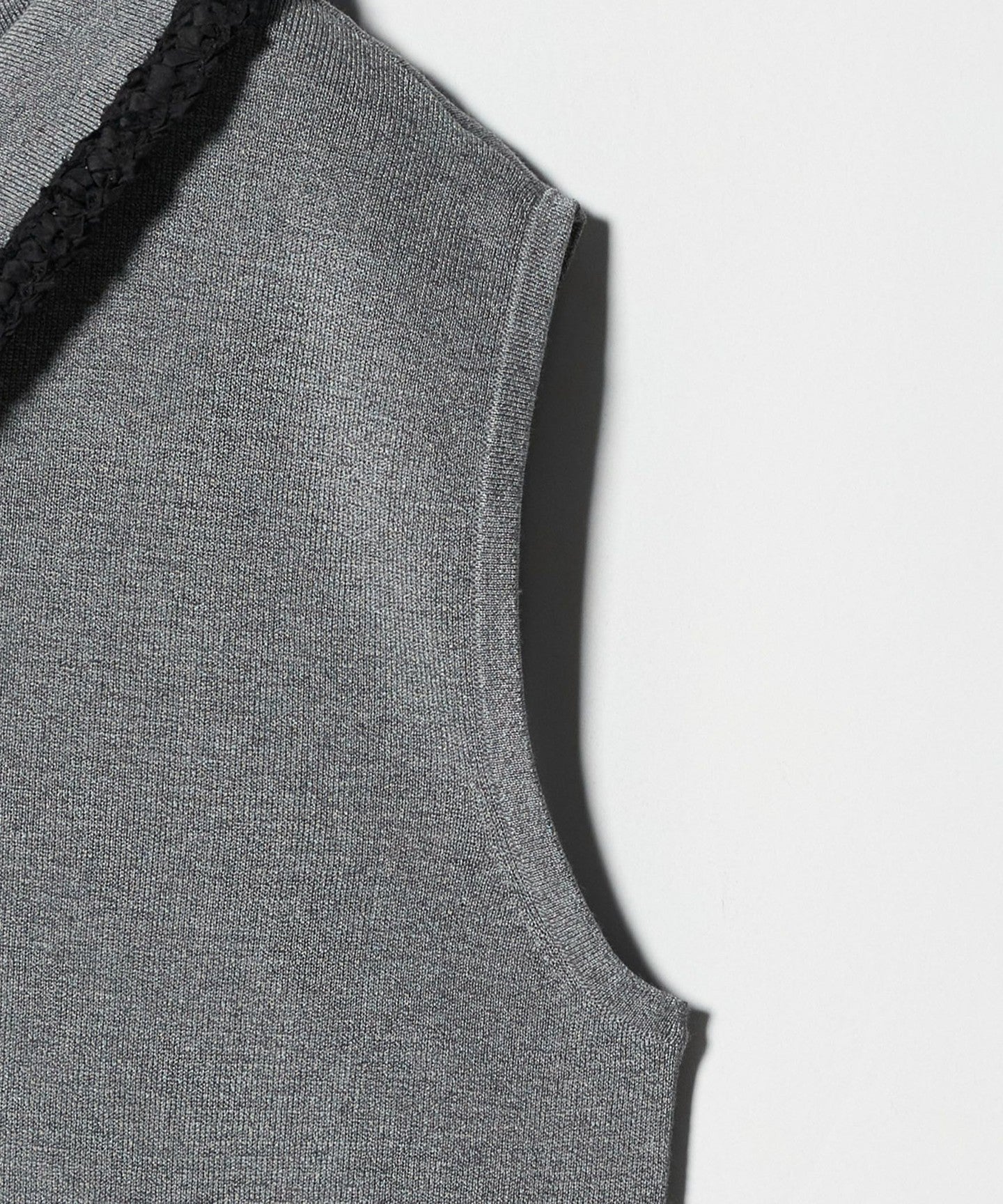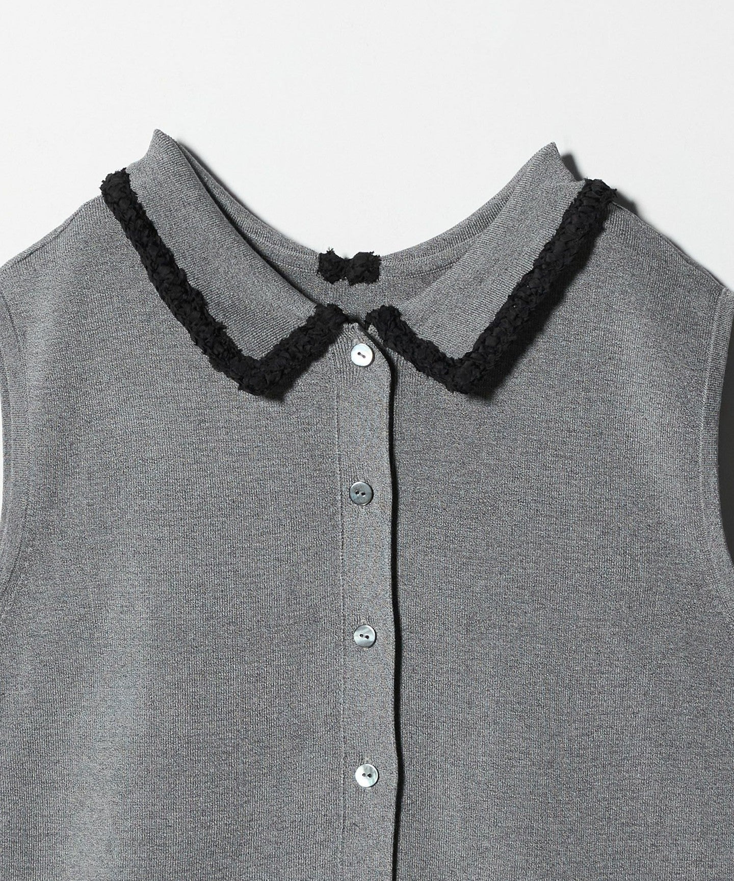 A sleeveless knit with crocheted tape around the collar as an accent design.