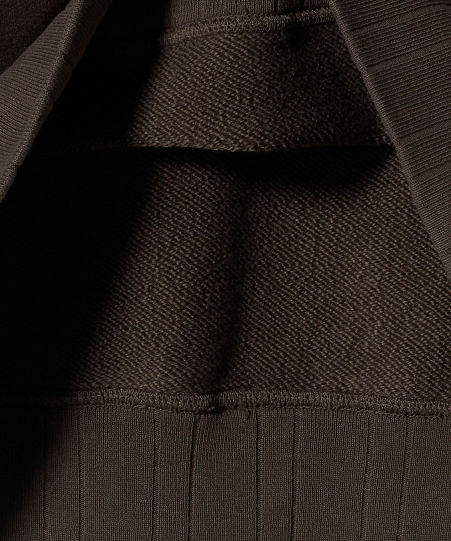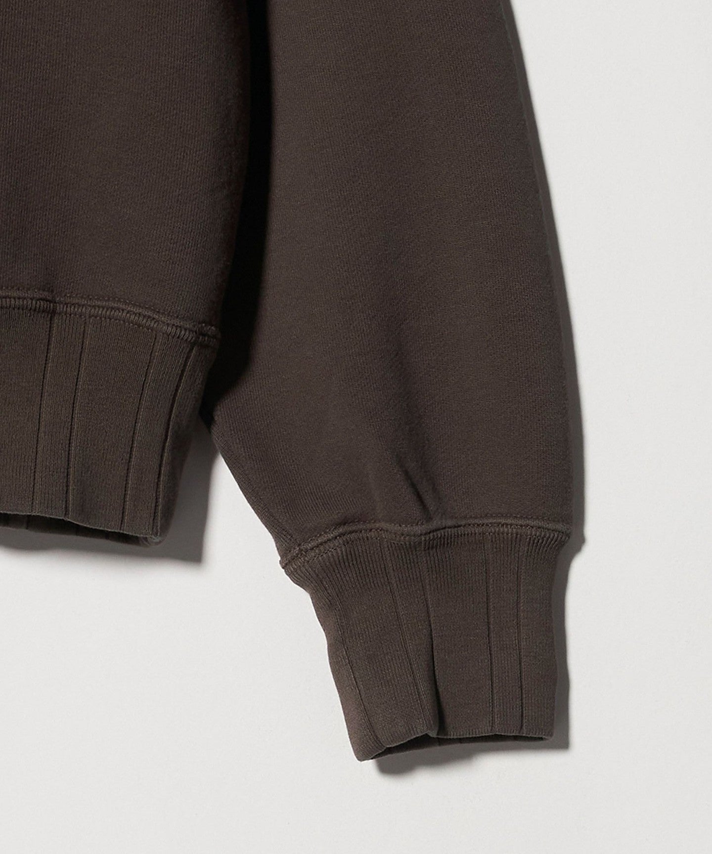 The garment dyed and washed to create a crease, and the random pitch ribbing on the cuffs and hem give it a vintage look.