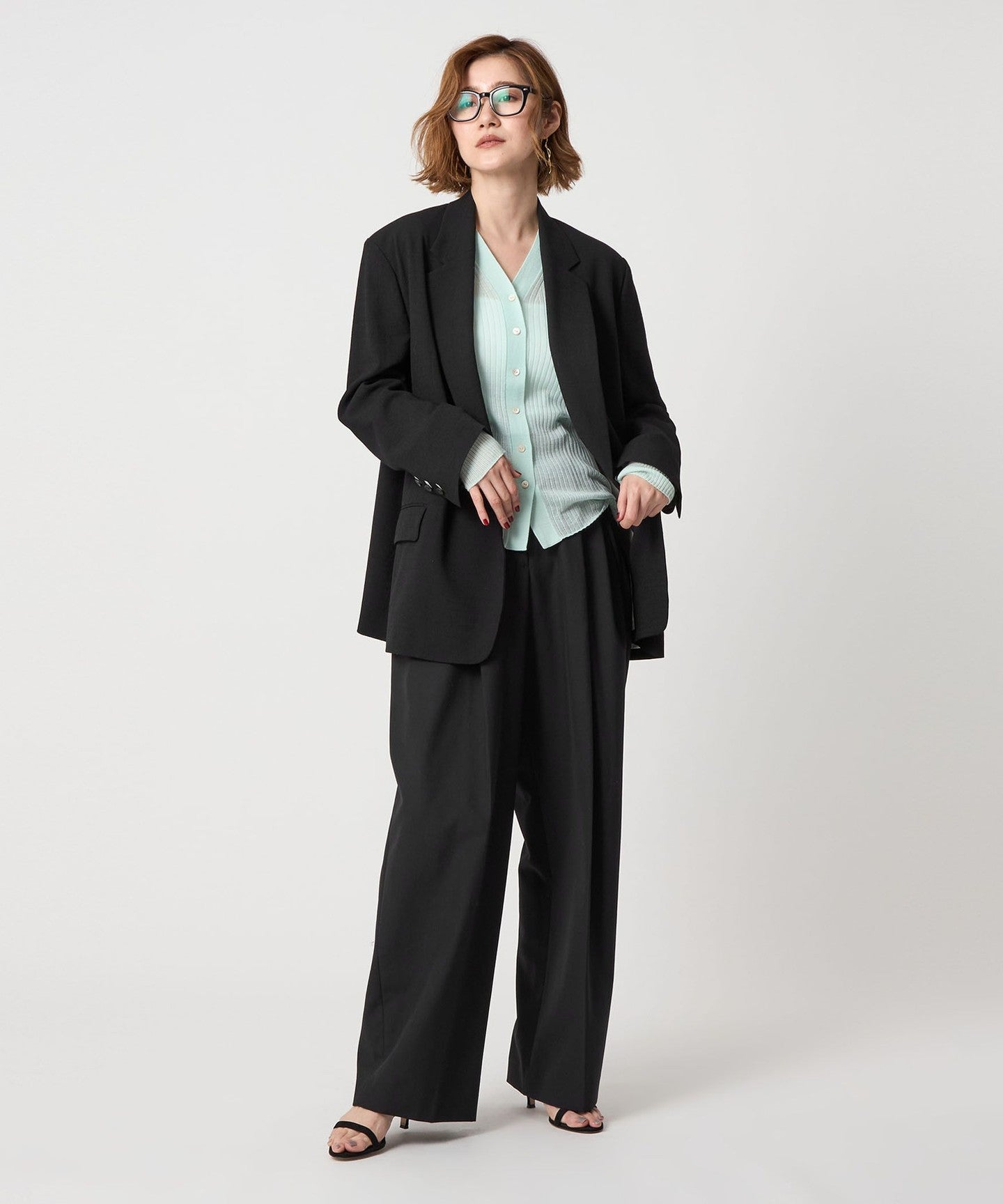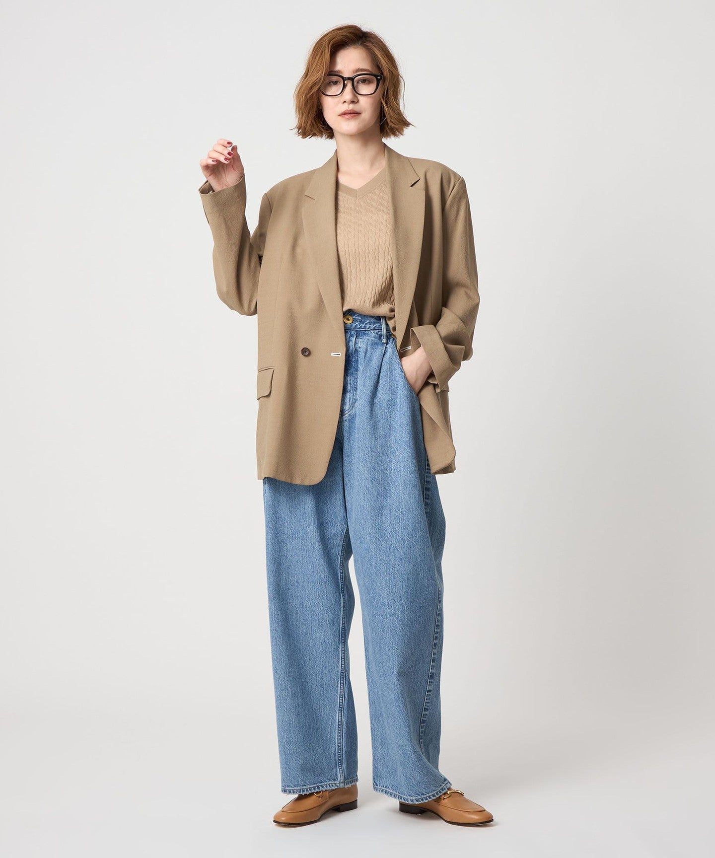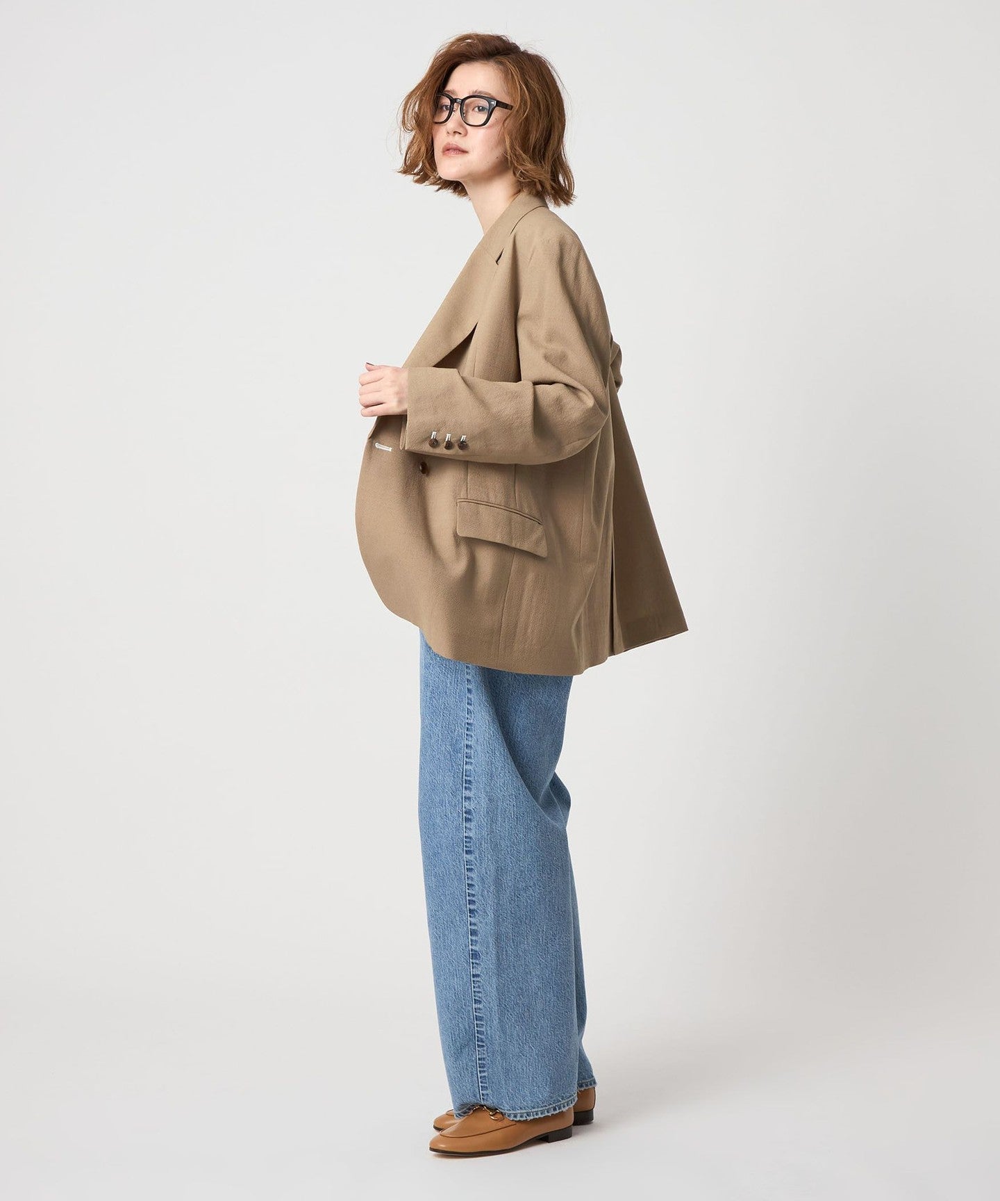 ダブルのジャケットですが軽やかな生地感で前を開けて肩掛けで羽織るのもおすすめです。