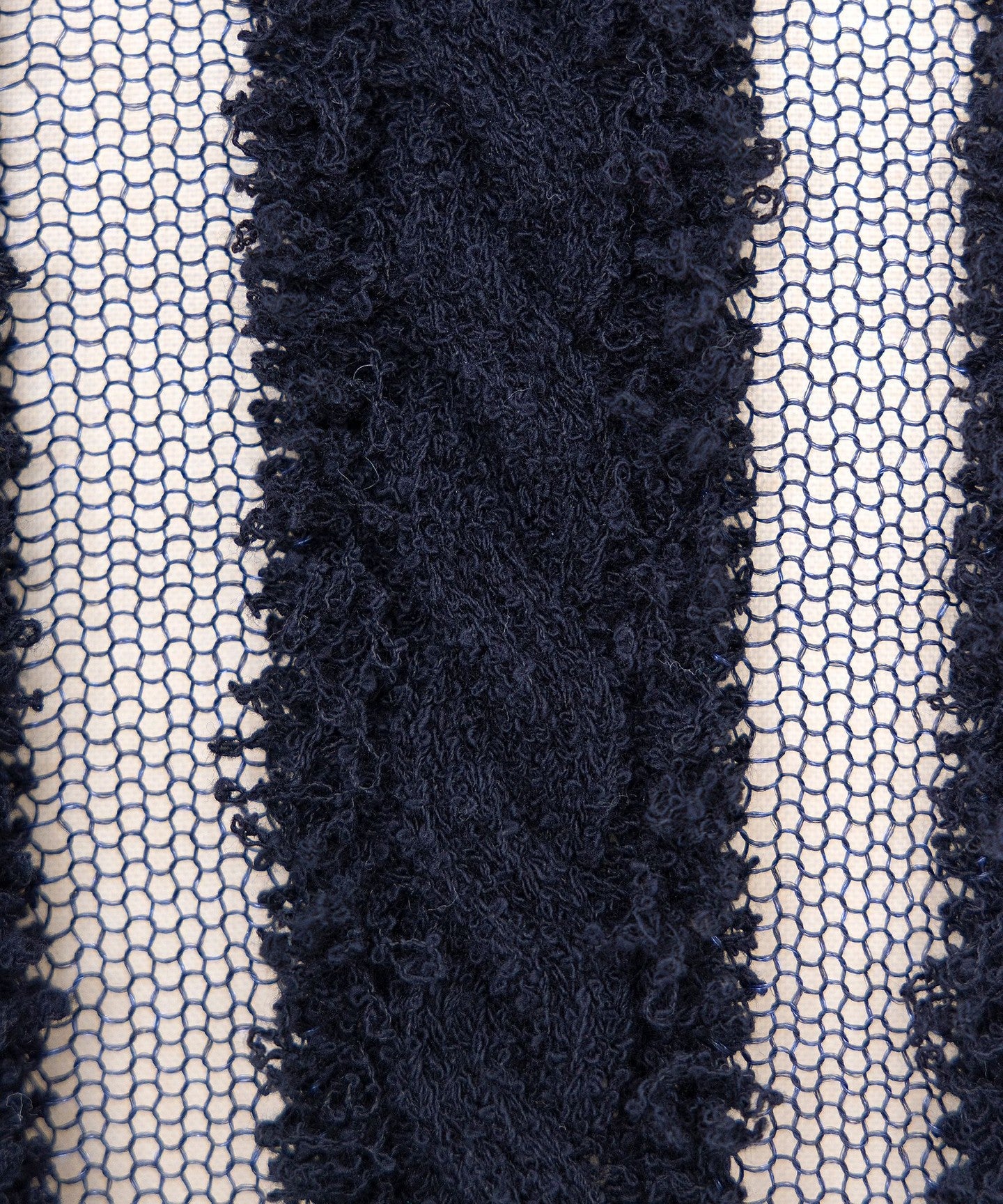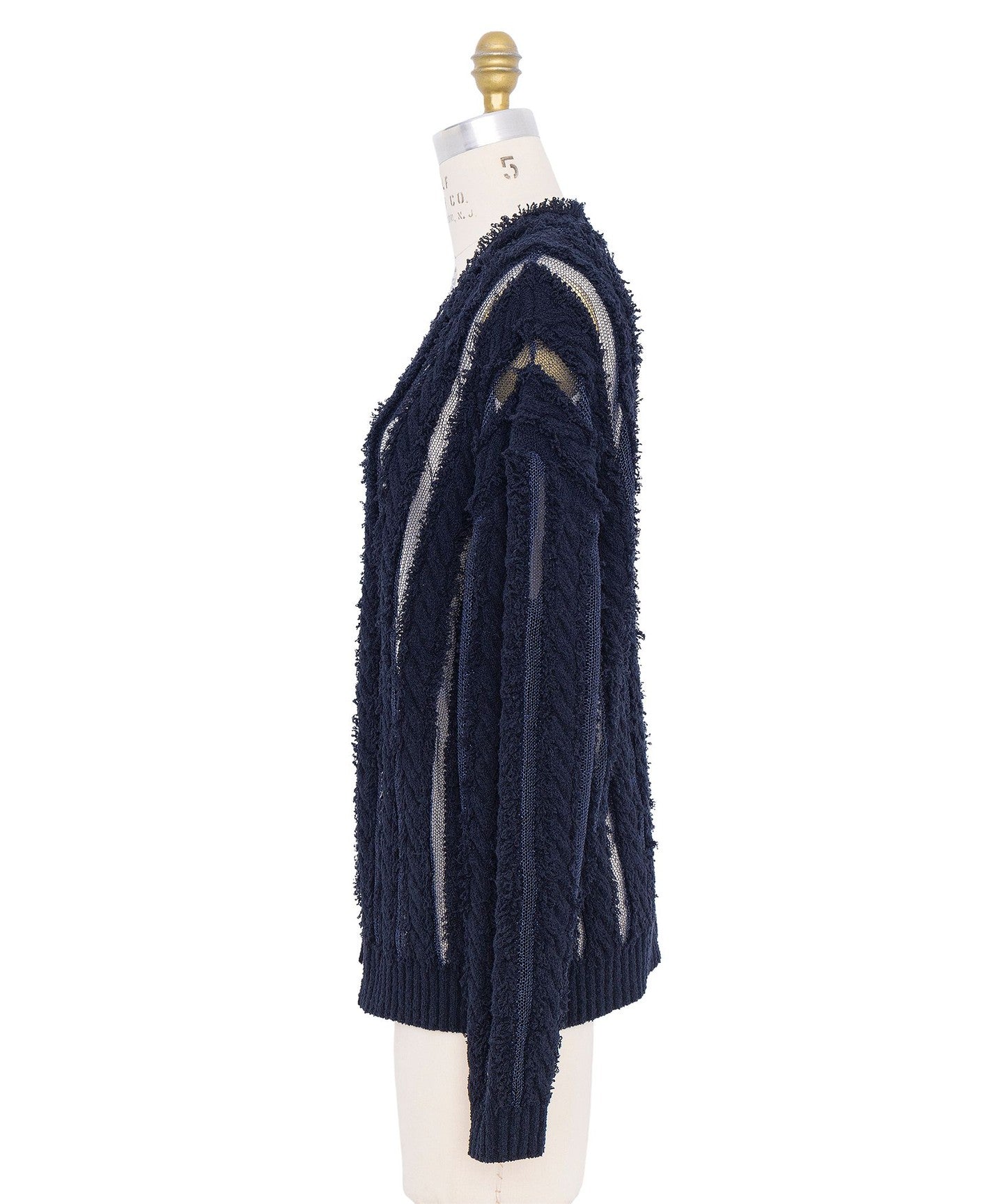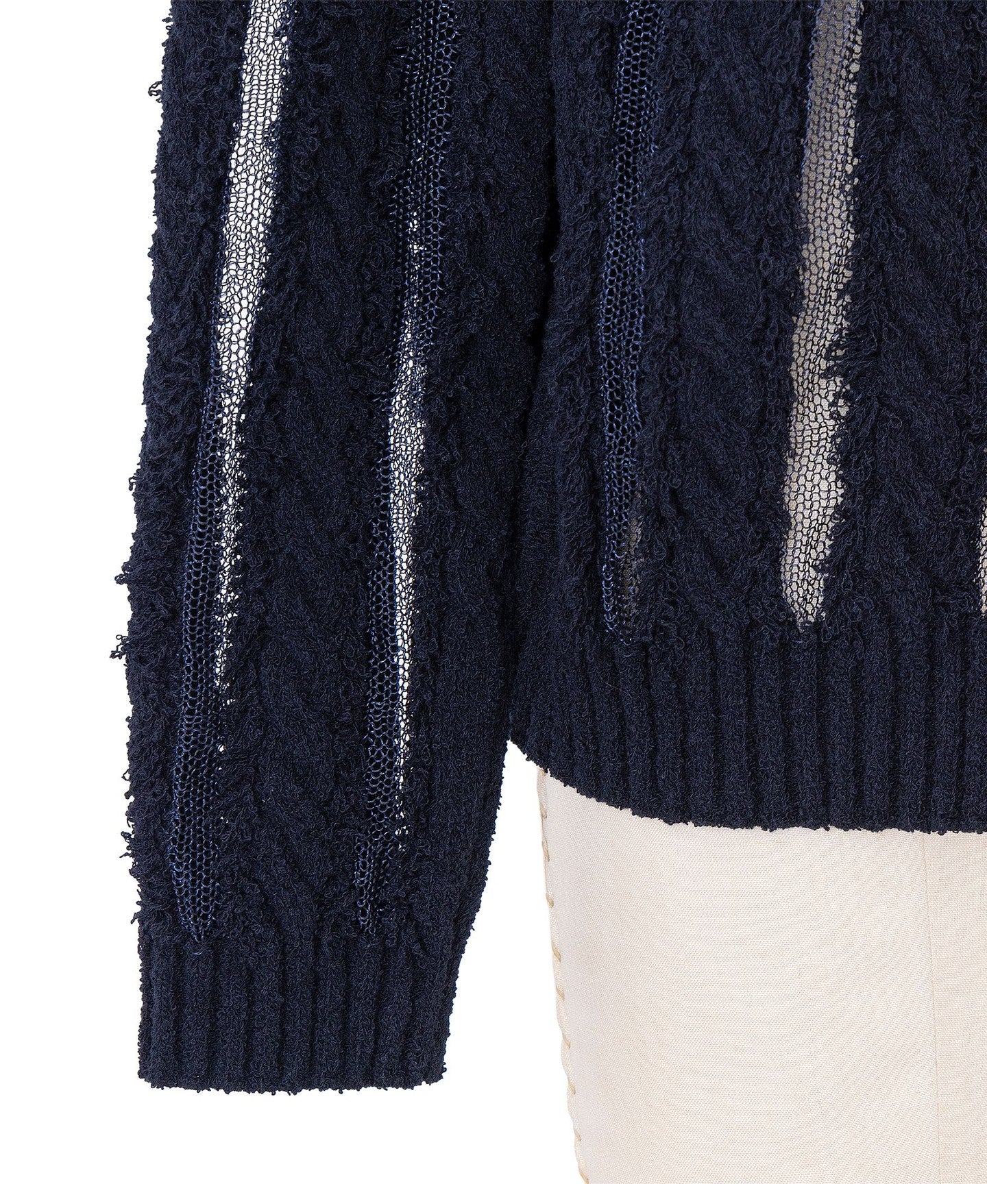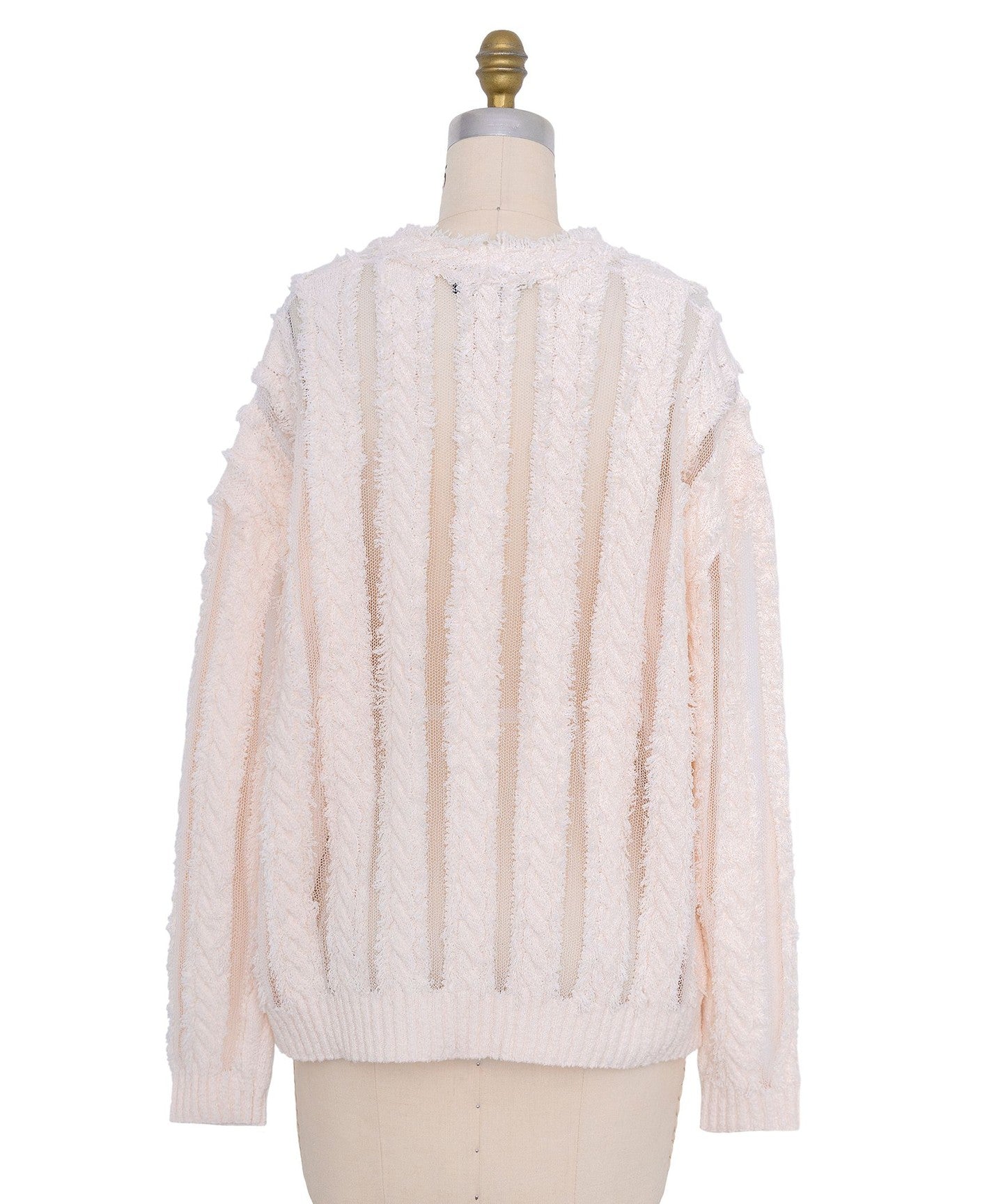 A striped knit fabric with a contrasting sheer knit fabric made from sheer yarn and cable knit fabric made from fringe-like boucle yarn.