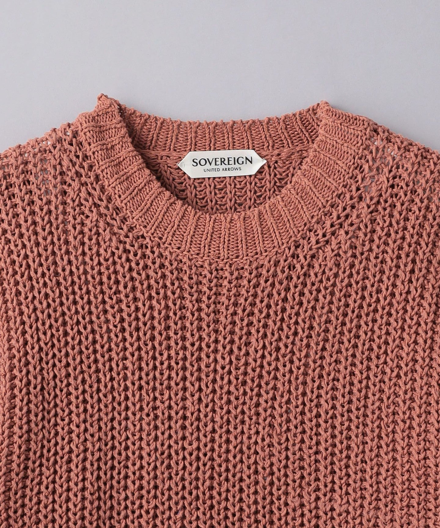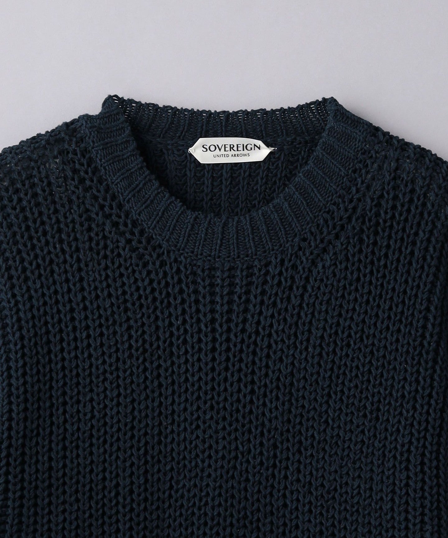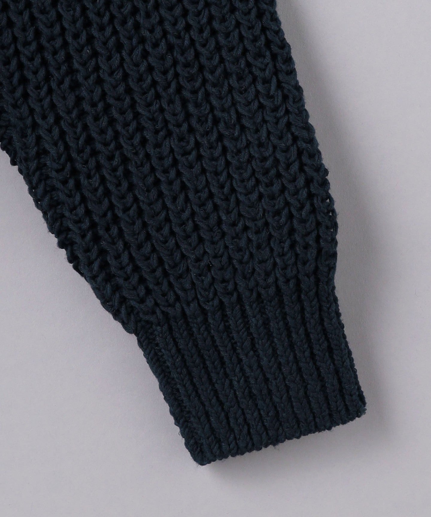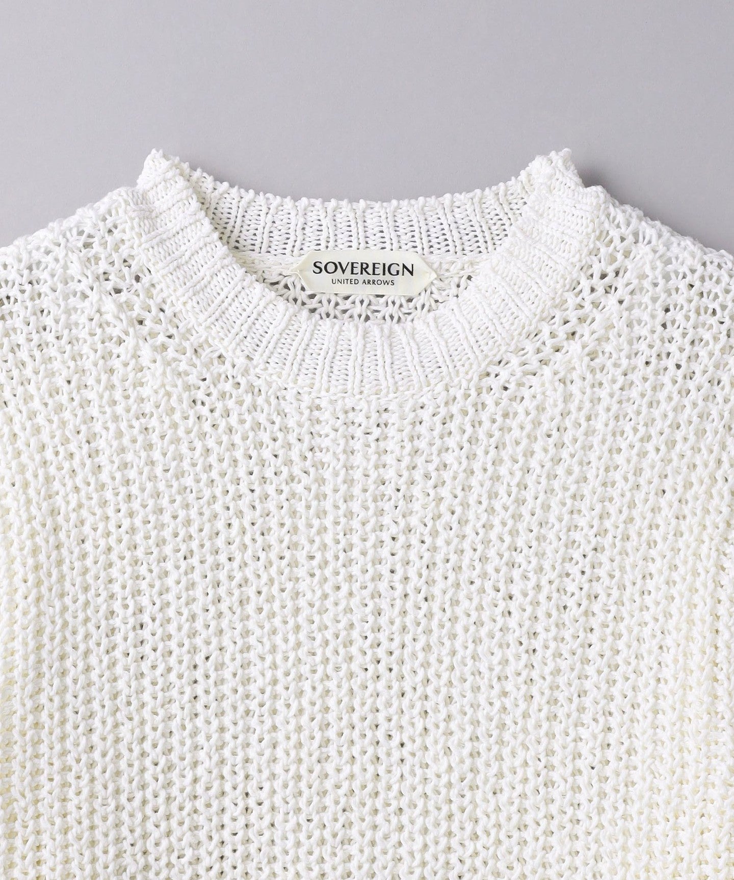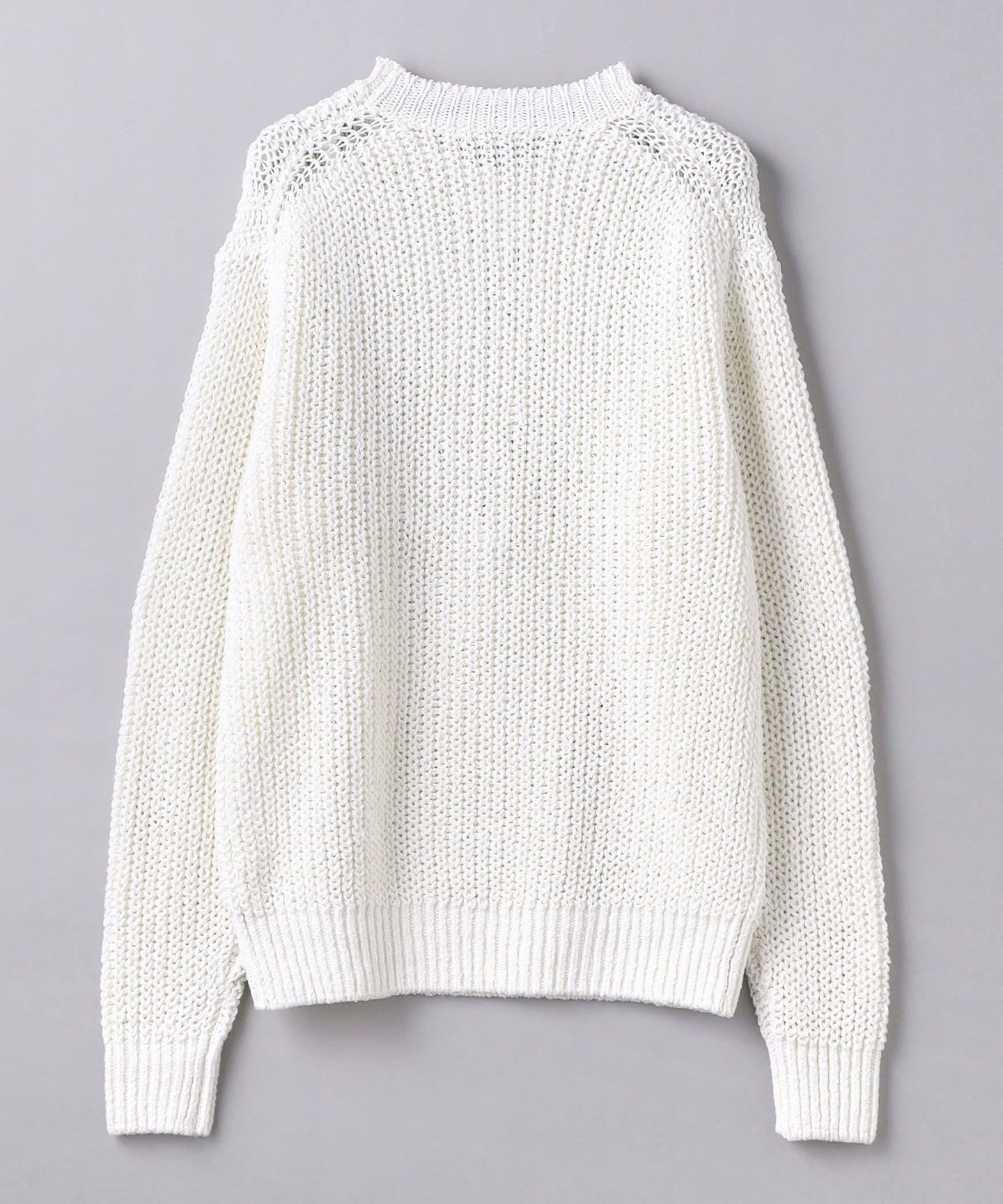 The crew neck part is made with 3G rib knitting and uses a lot of stretch yarn to maintain its shape.