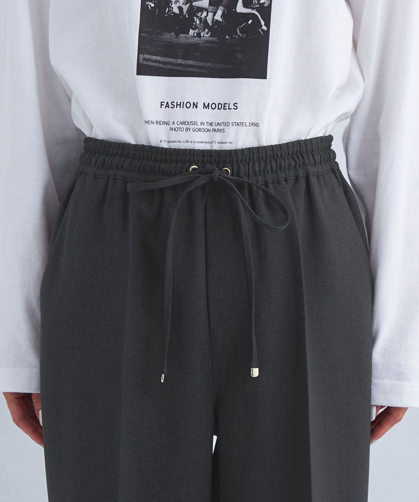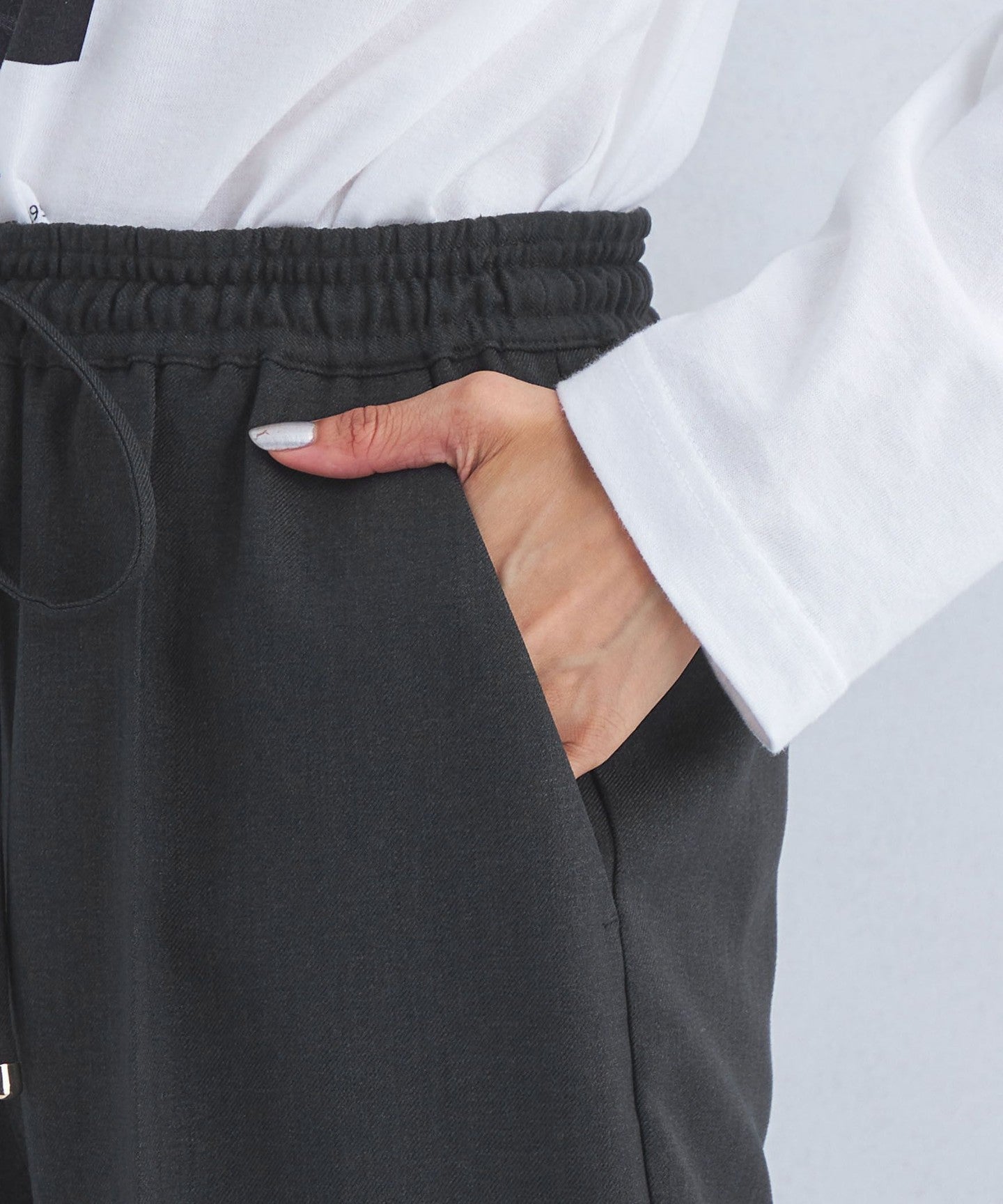 The shiny metal fittings at the end of the waist cord add a subtle accent.