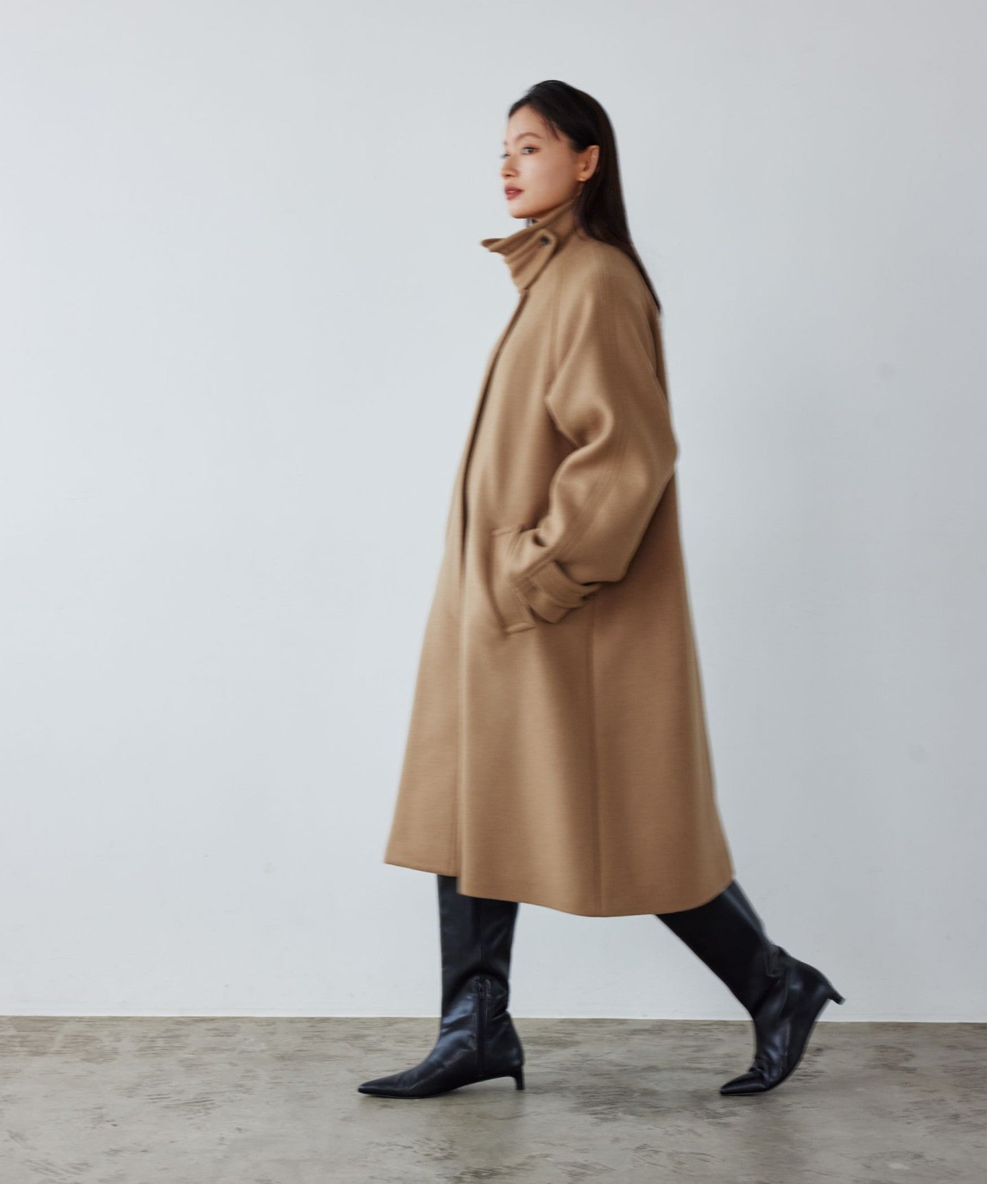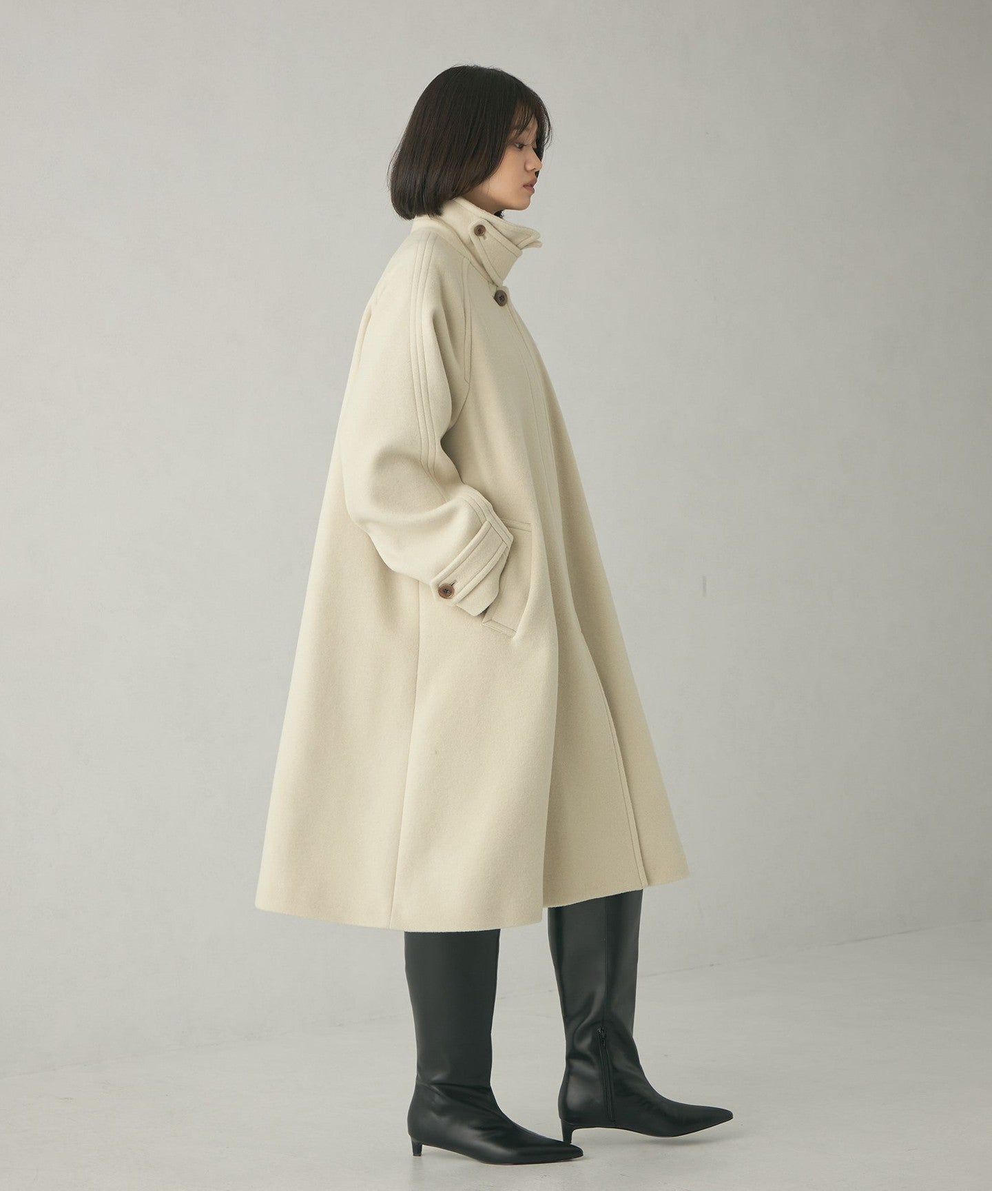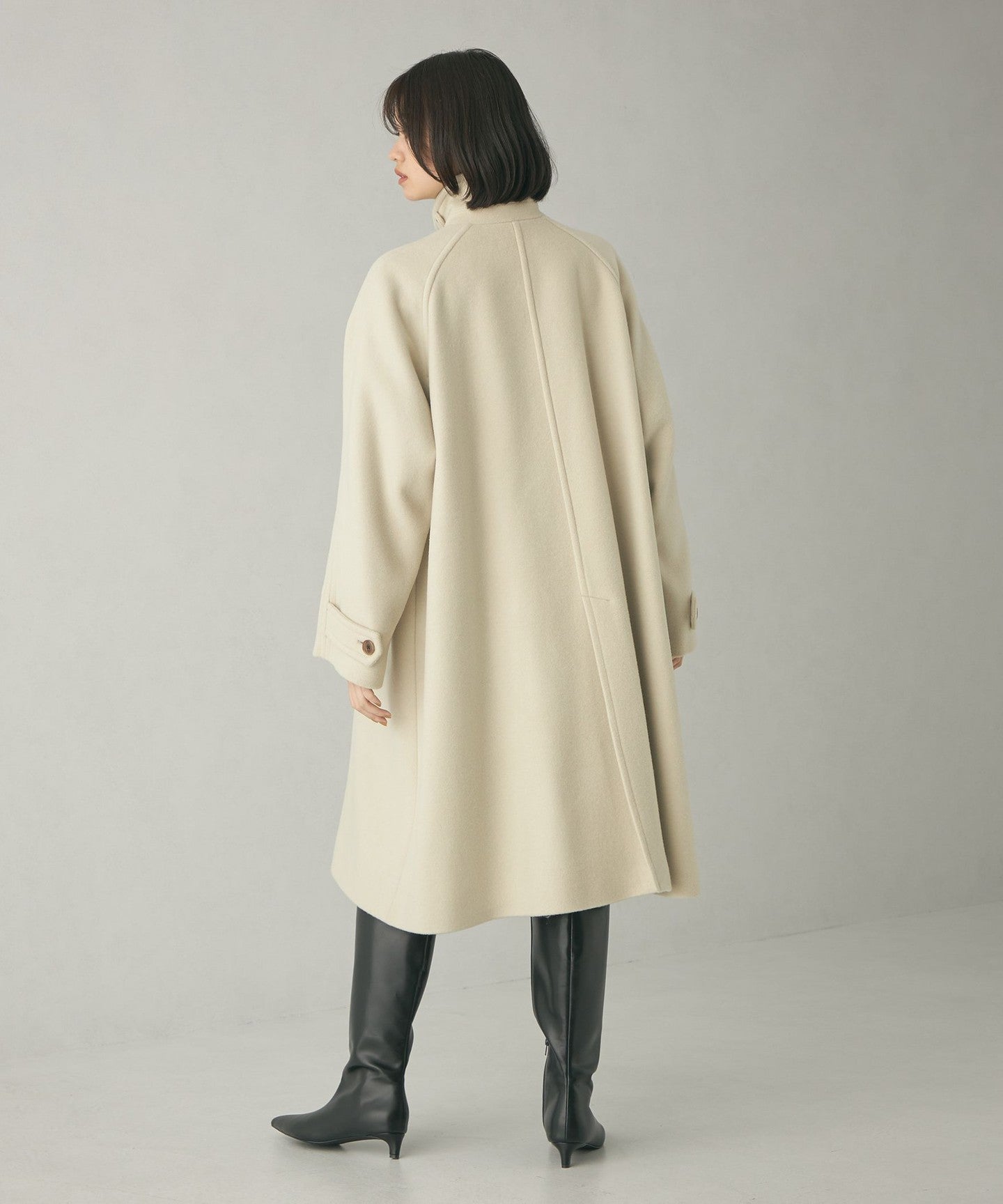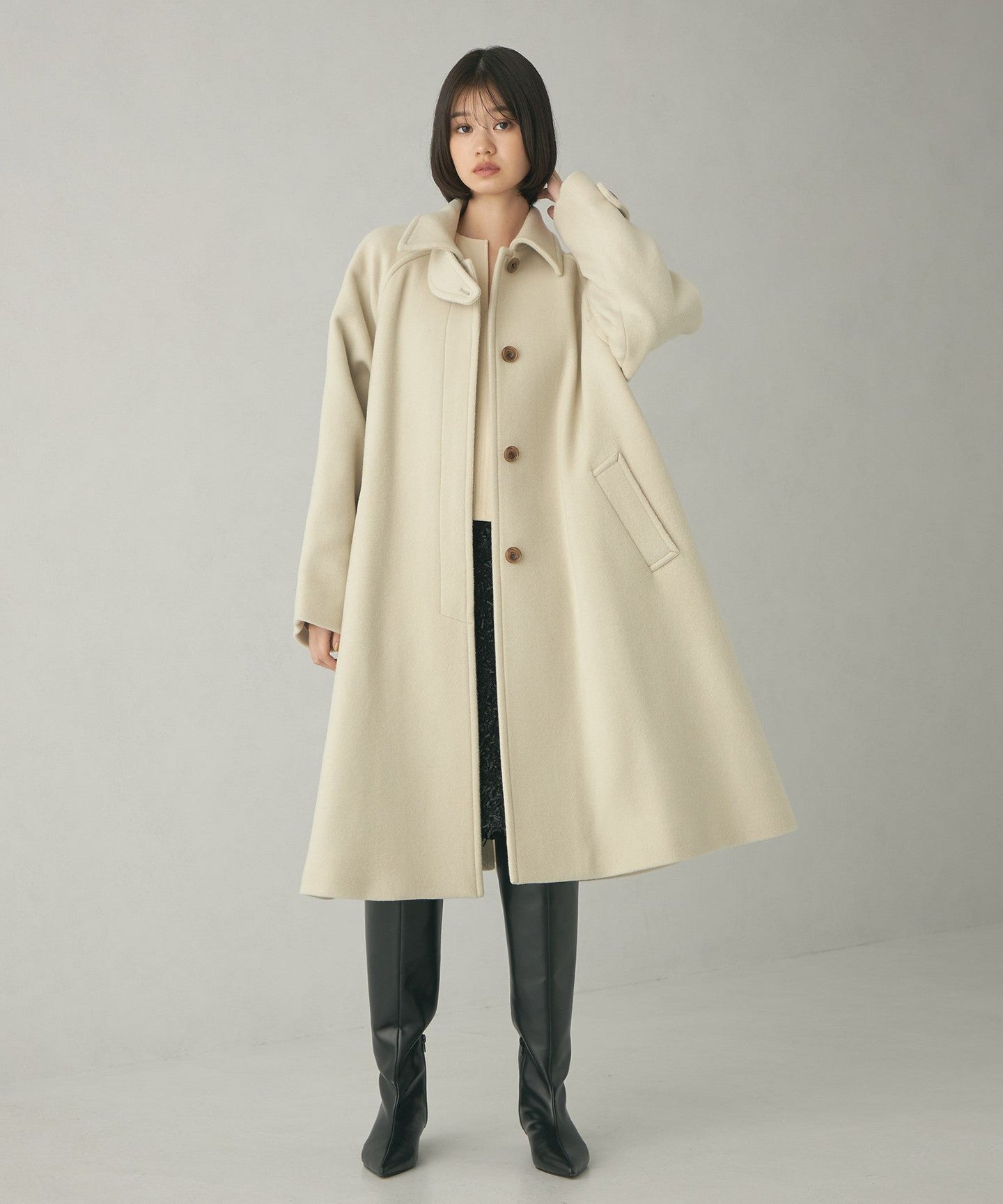 This ladylike coat has a tent-line silhouette with a swaying hem like a cape.