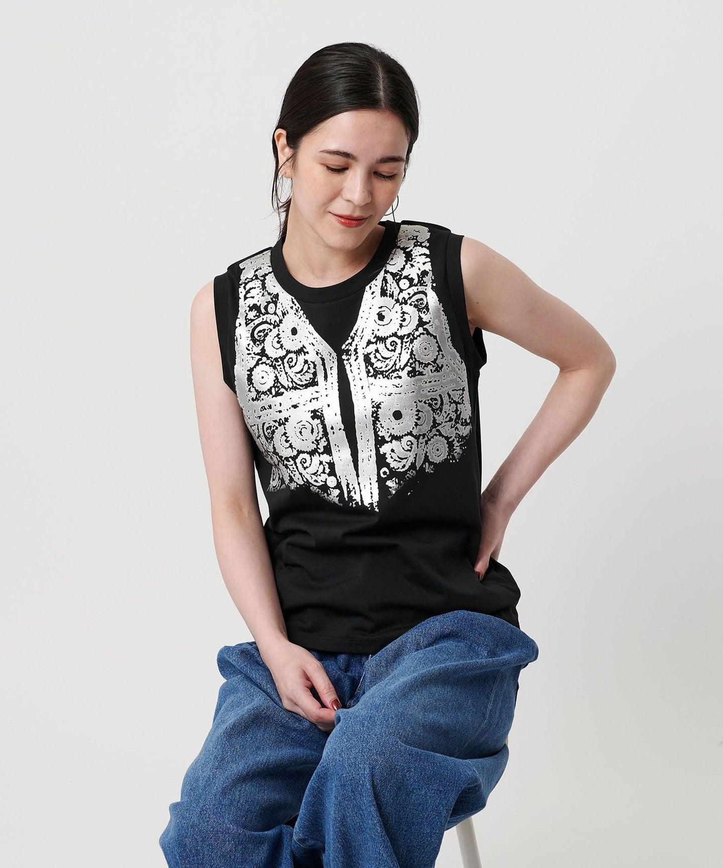 This eye-catching piece features a trompe l'oeil print that makes it look like an antique lace gilet is layered over it.