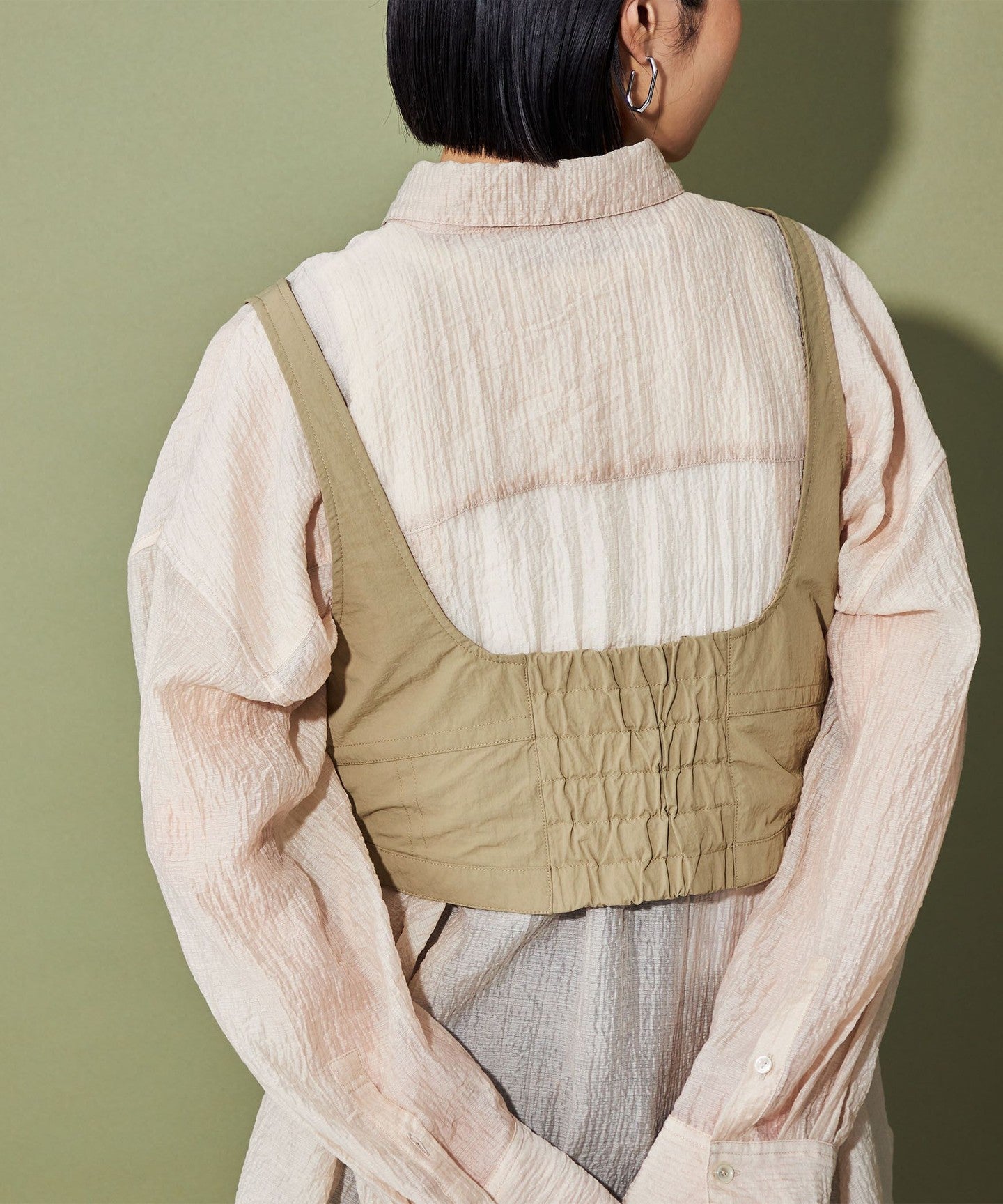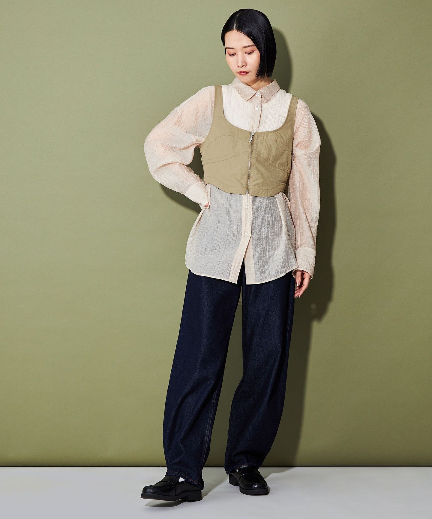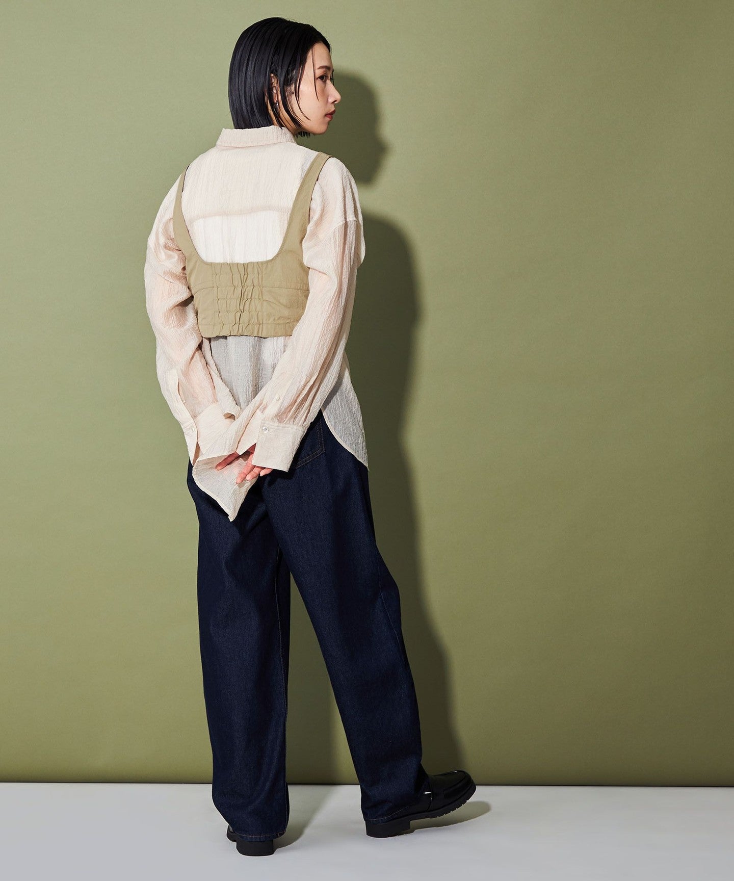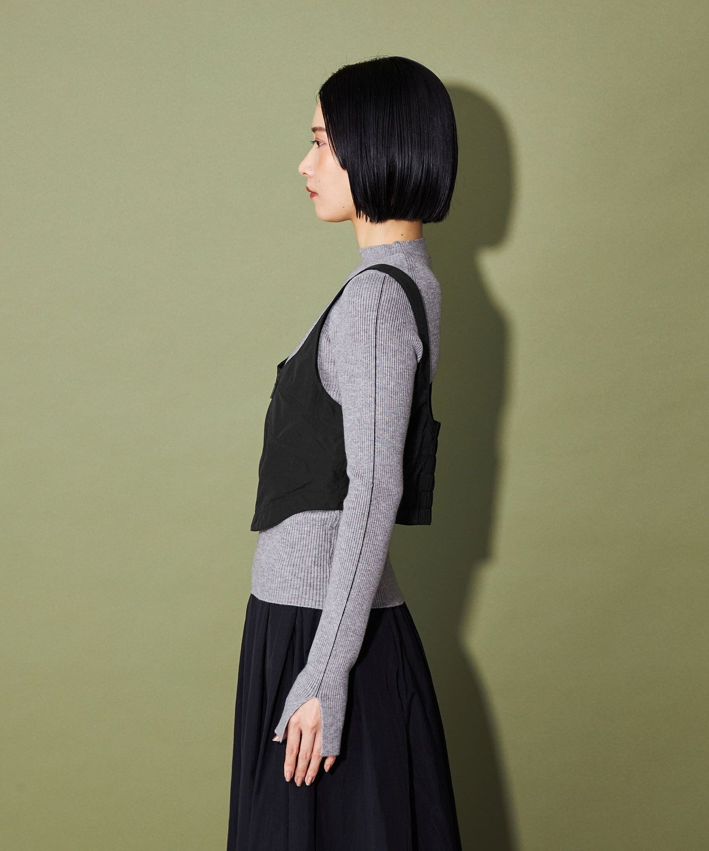 The short length gives it a clean silhouette like a narrow skirt, but it also looks balanced when paired with loose-fitting bottoms such as slacks and denim.