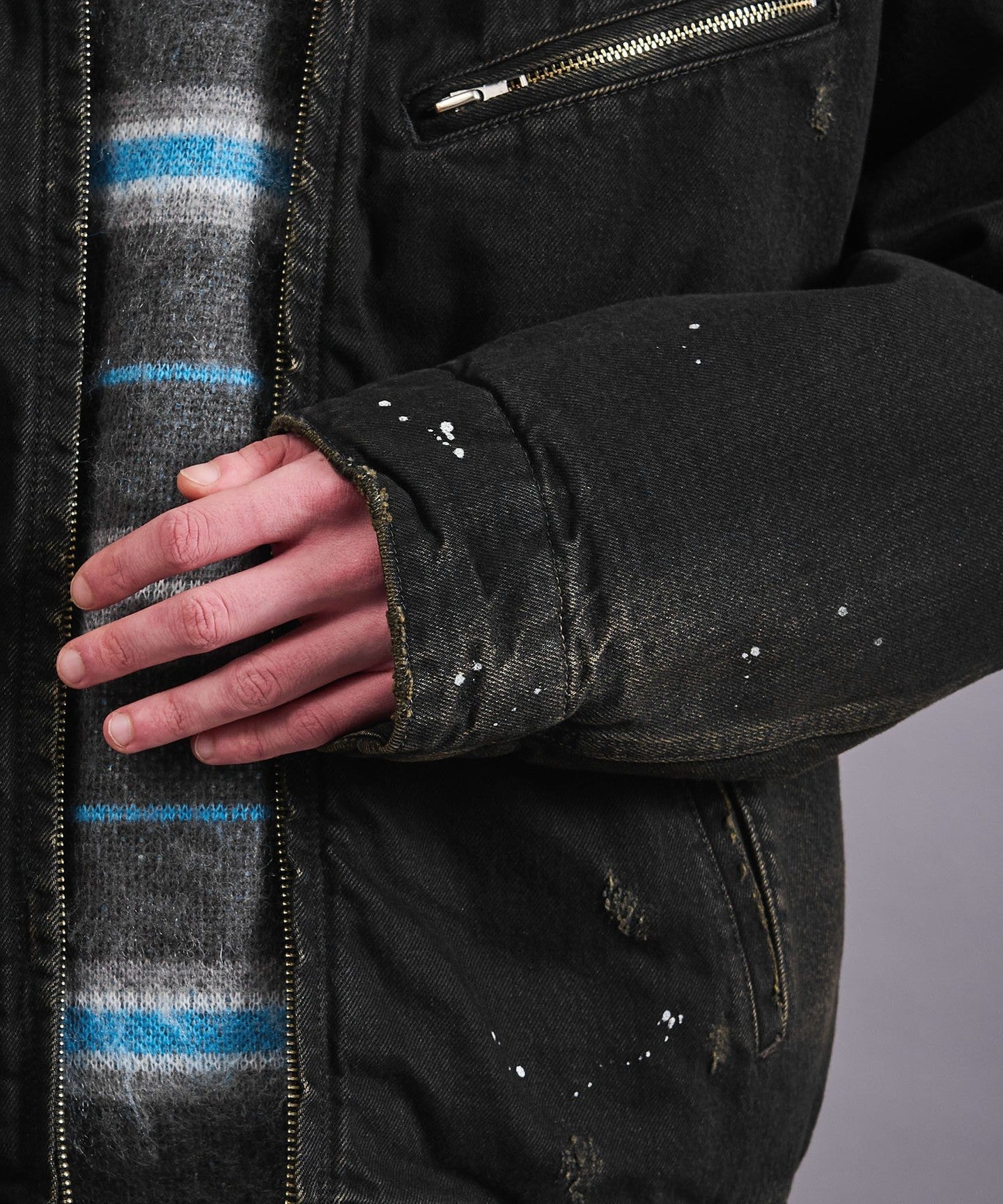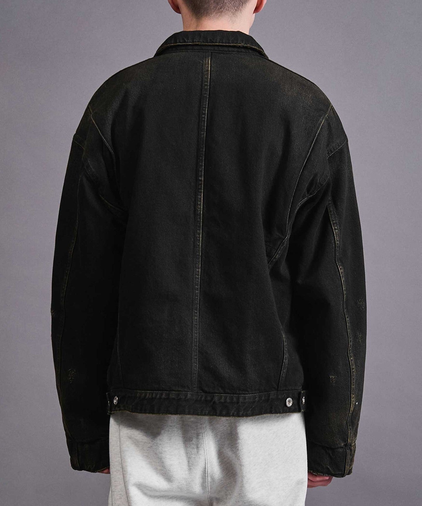 This work jacket is made from approximately 13 oz denim and has been faded and overdyed.