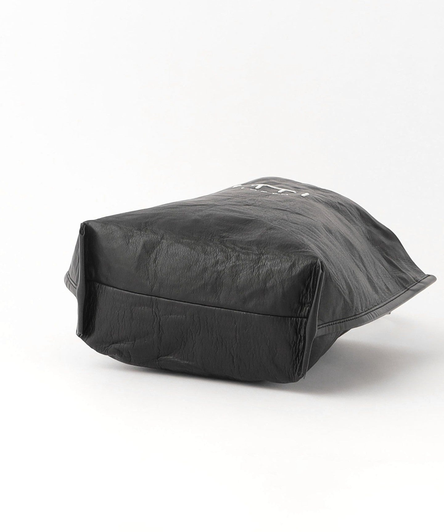 This small bucket bag is made from cow leather with a unique wrinkled texture and shape, and features a simple logo.