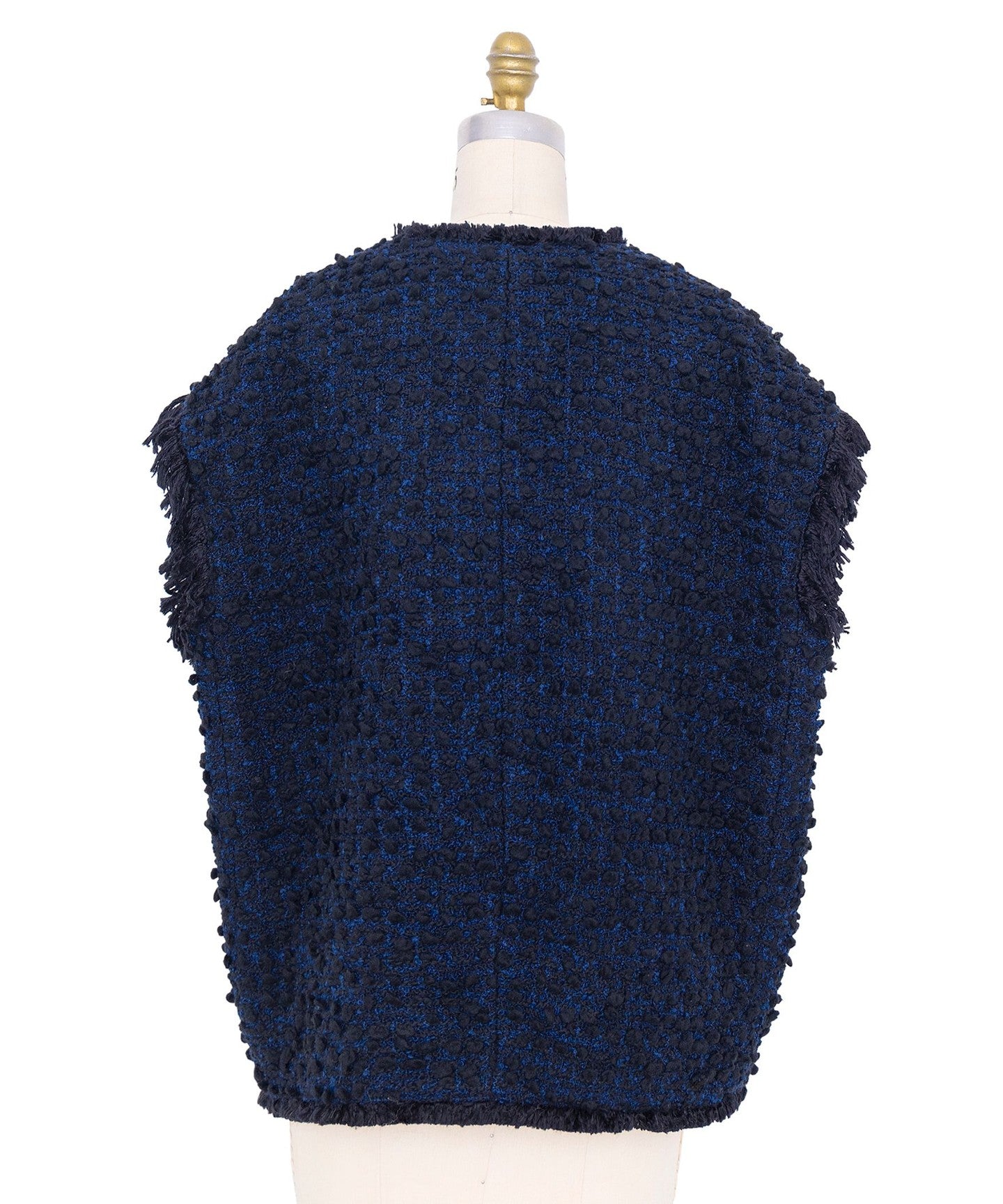 This tweed blouse has a dot button closure on the front, allowing it to be styled like a vest.