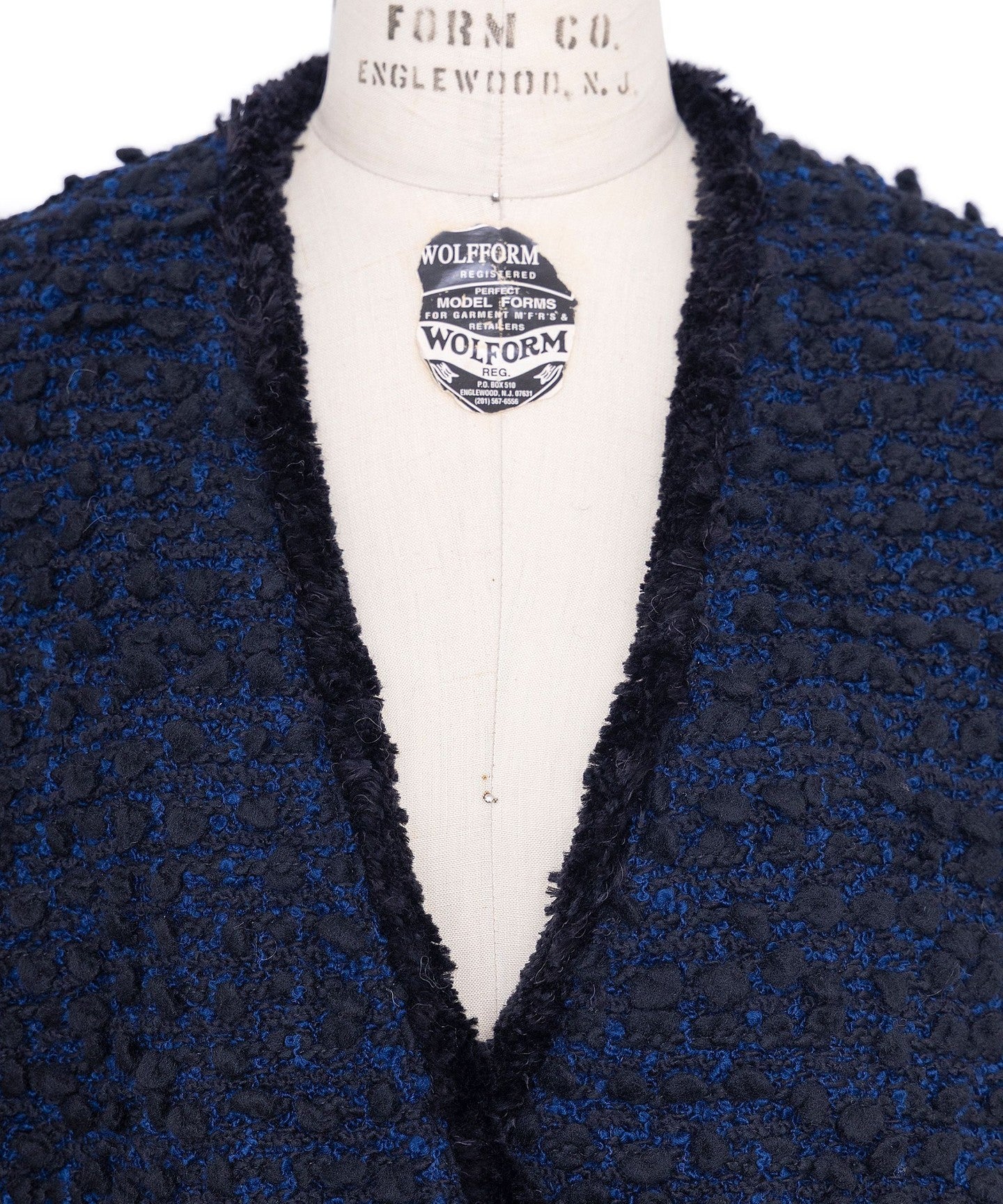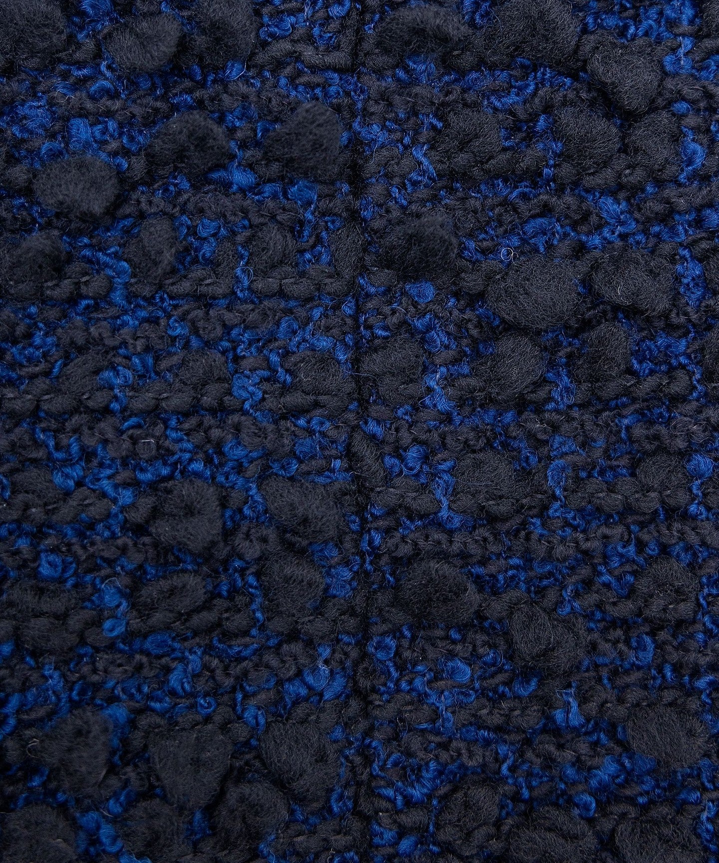 Made from roving tweed material featuring large ring threads and a contrast of blue and black.