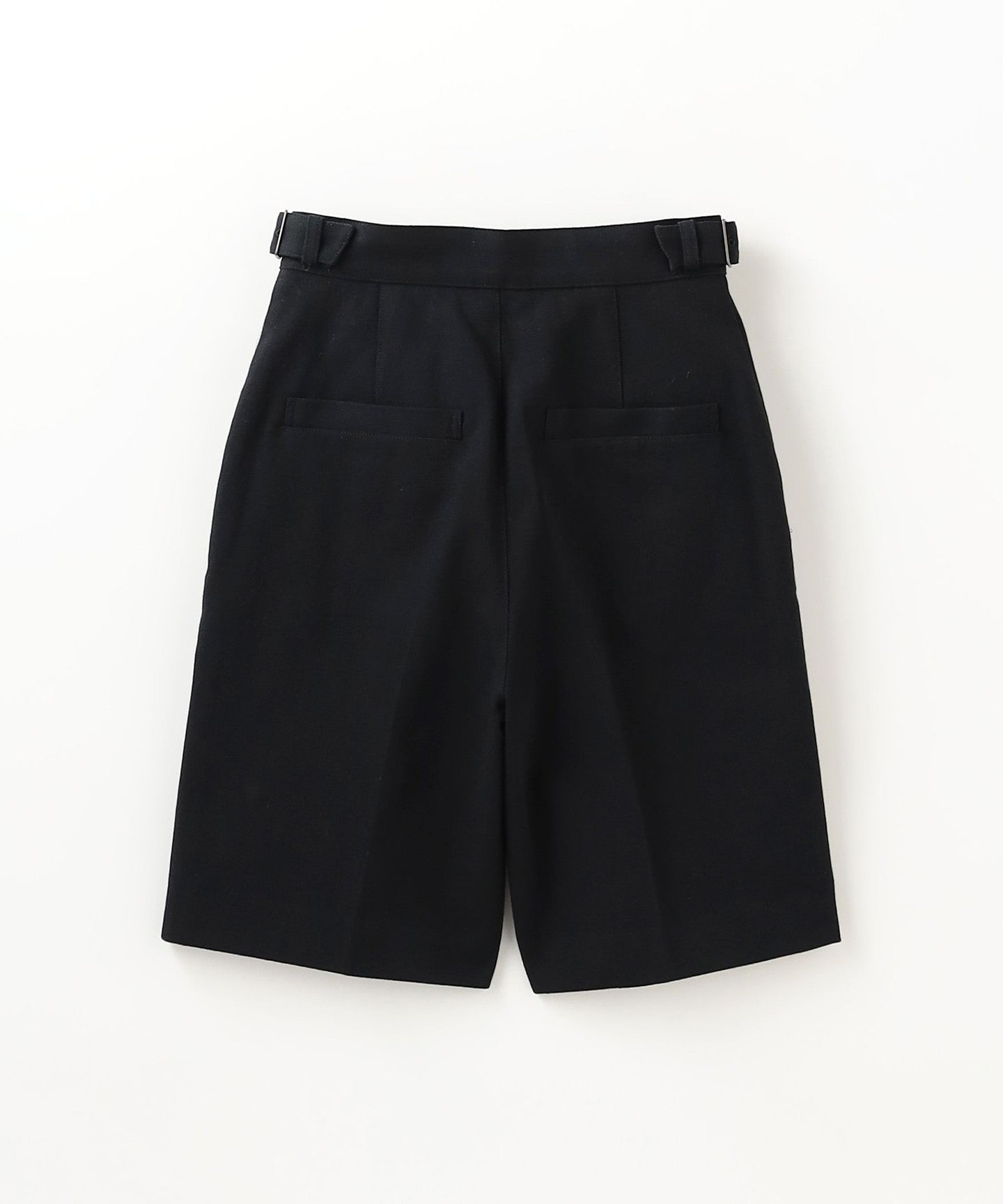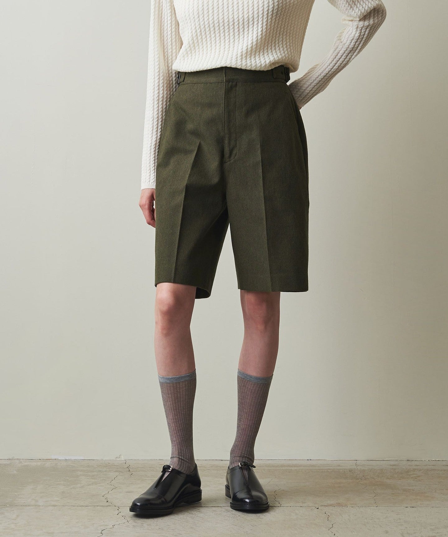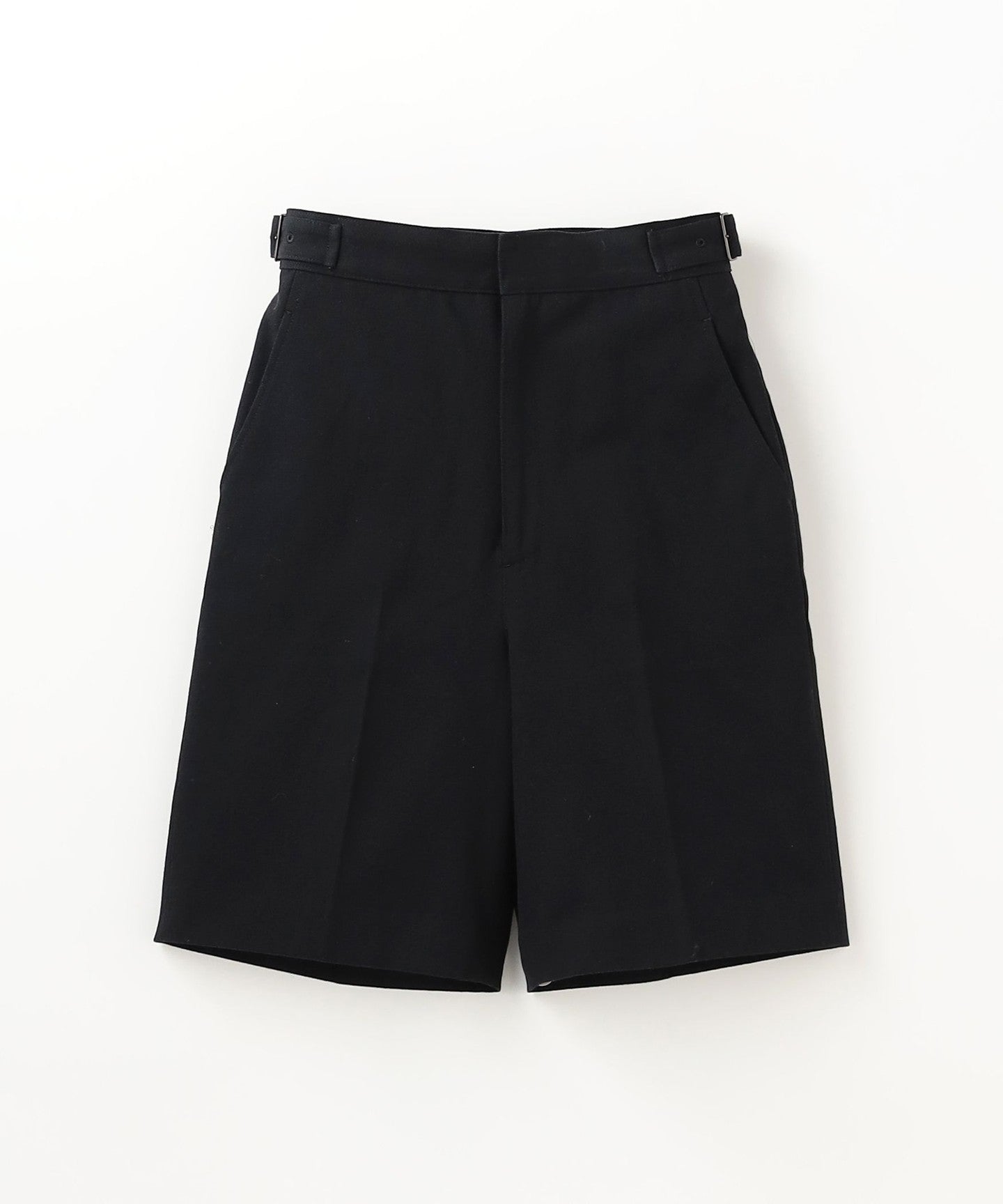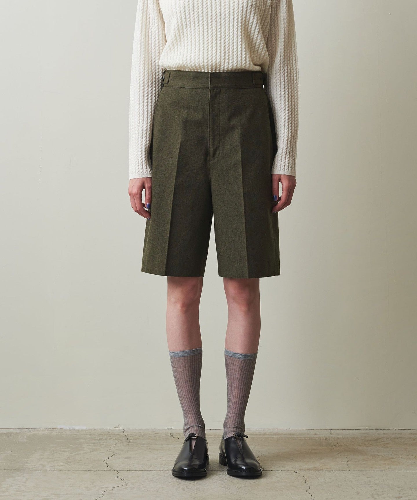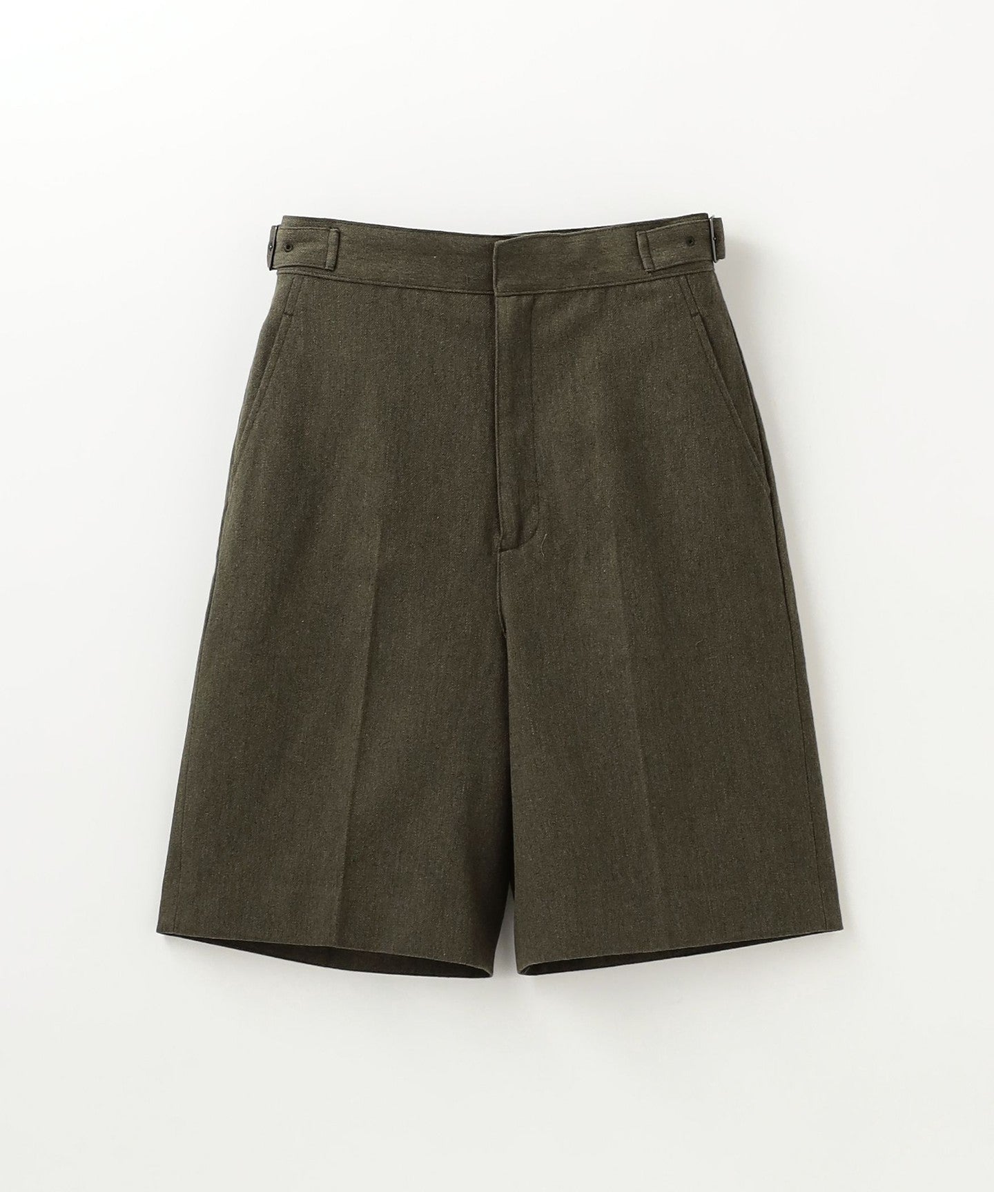 The boxy above-knee silhouette is accented with a belt and buckle on the waist side for a work-like feel.