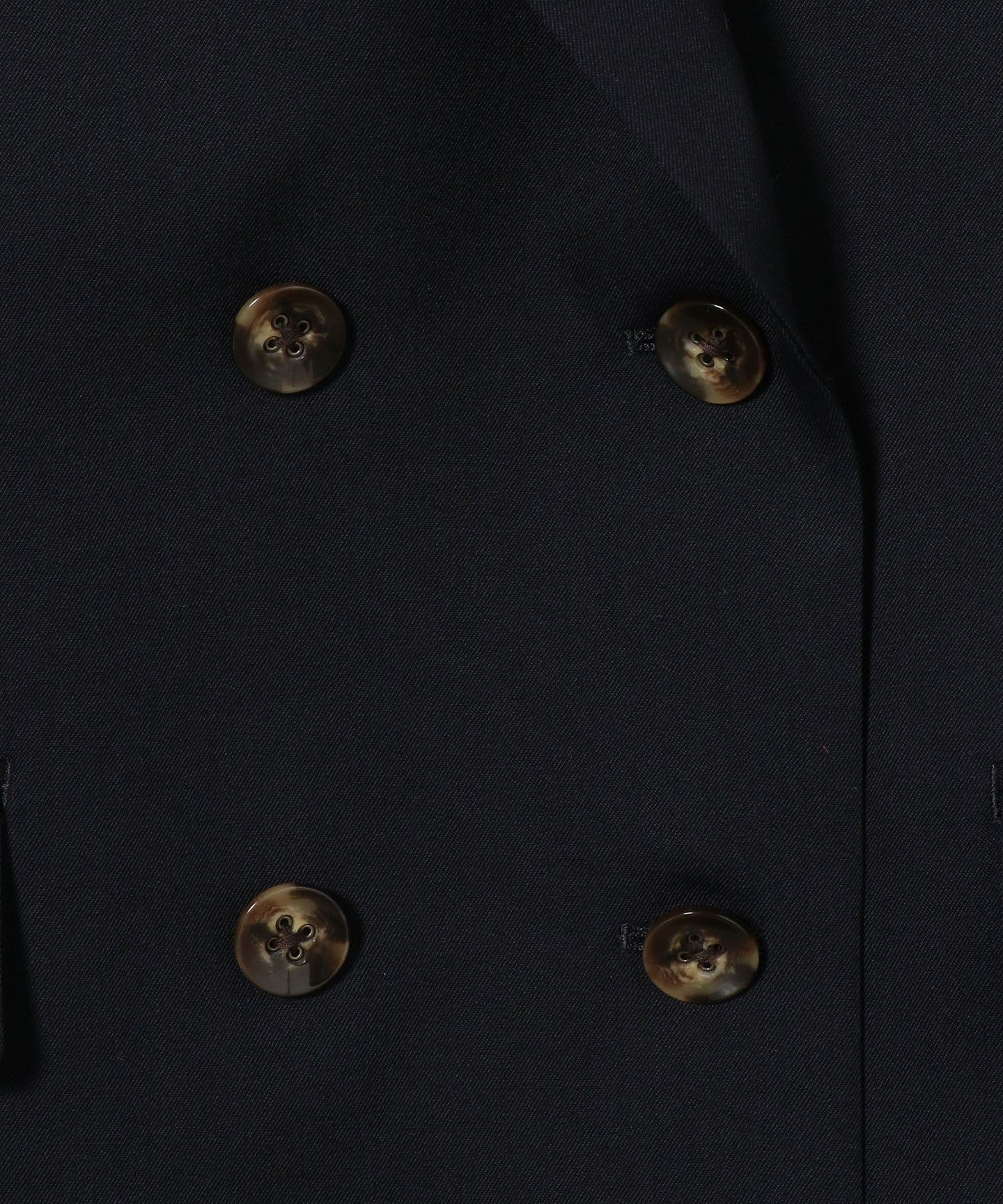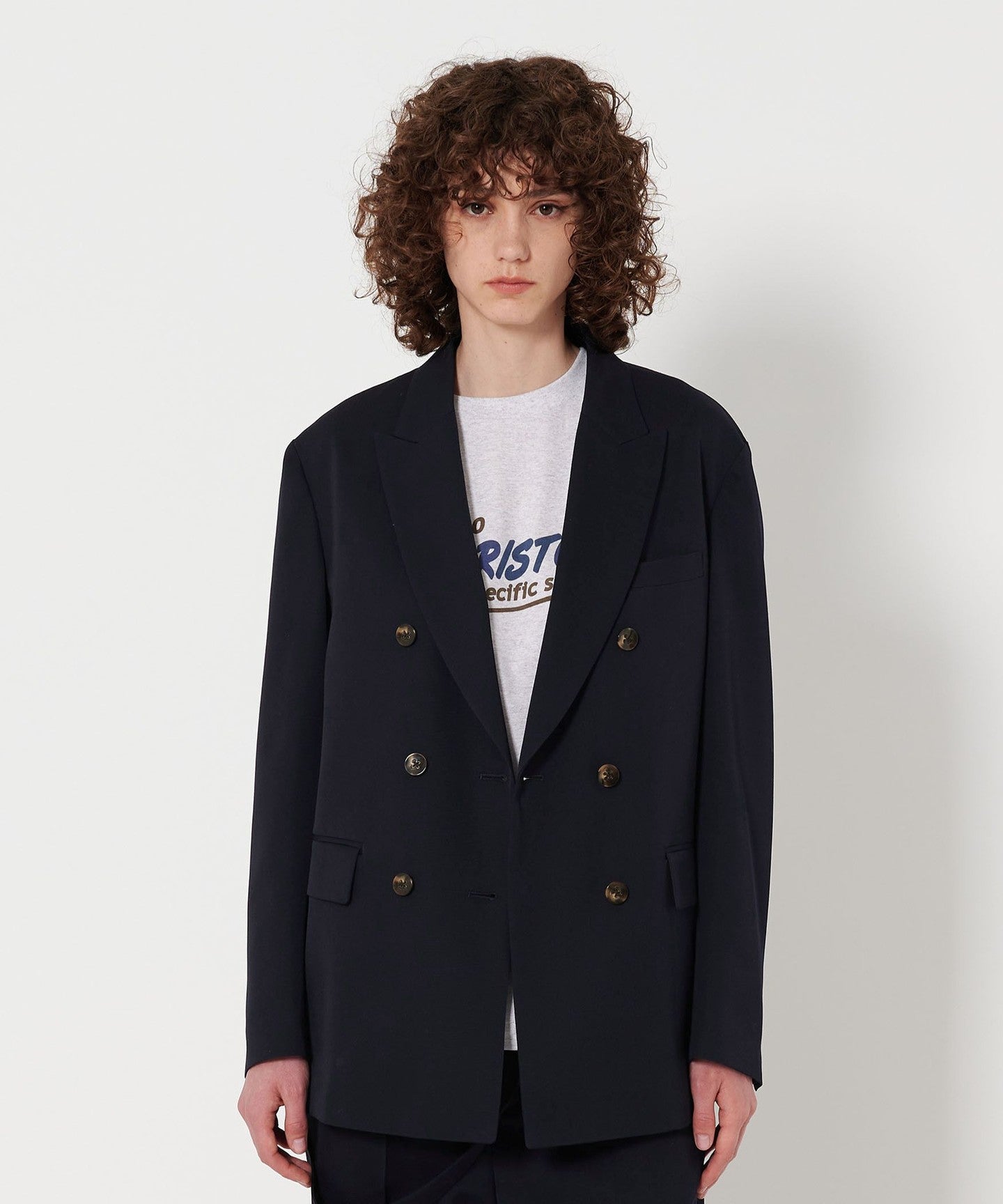 A deep navy double-breasted jacket that exudes a mature vibe.