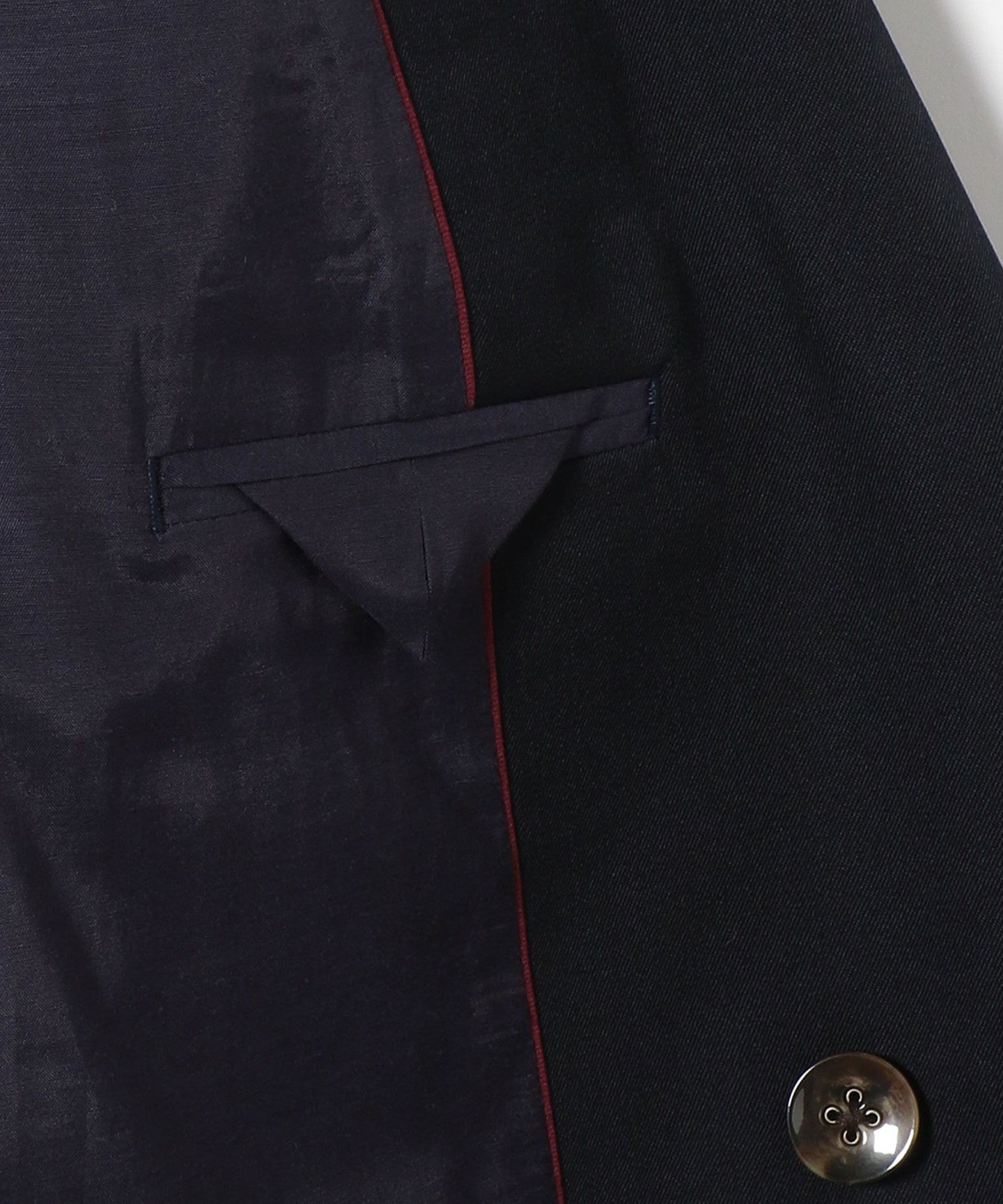 It has a slightly larger silhouette, and the key features are the men's-like peak lapels and gusset fasteners.