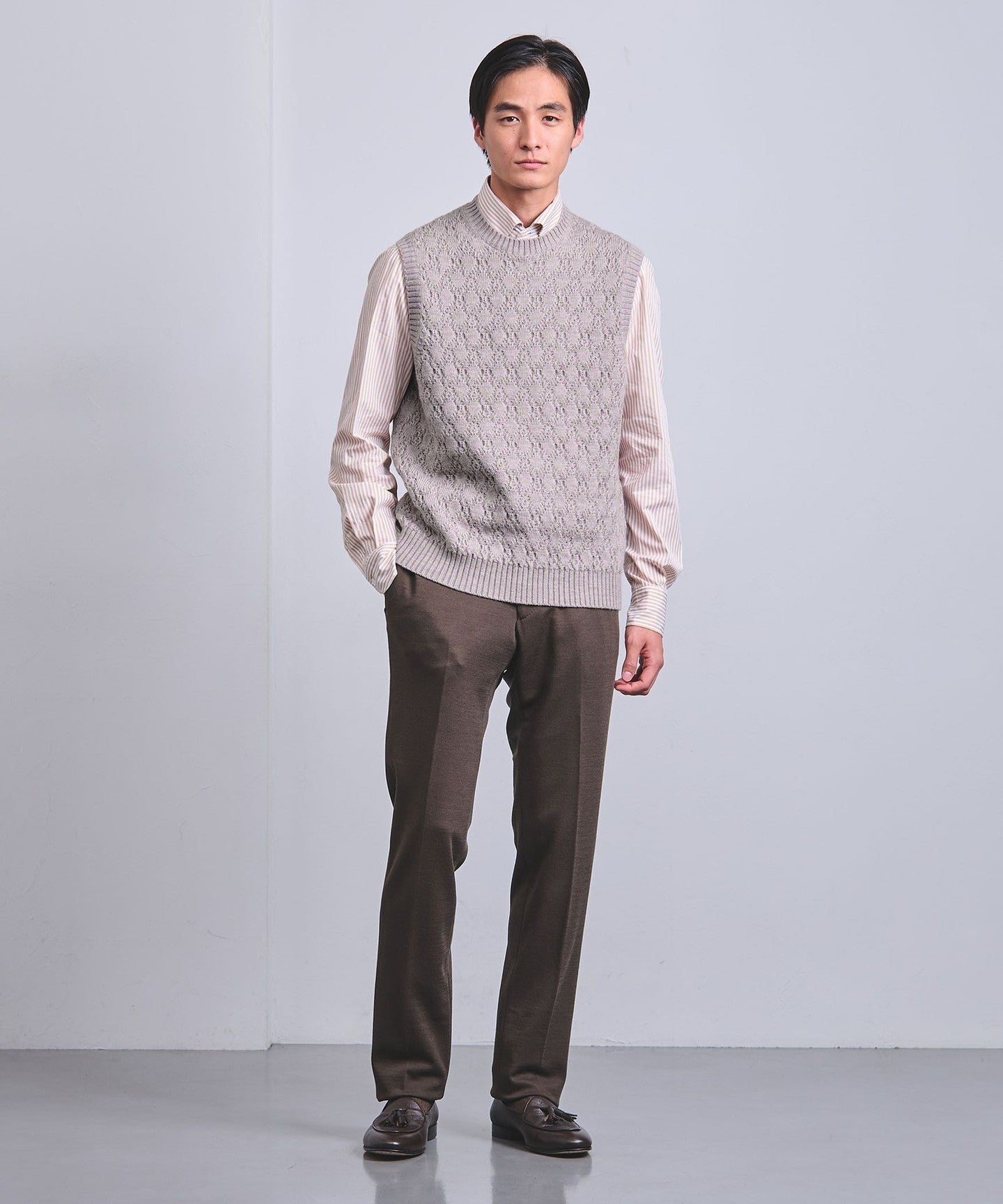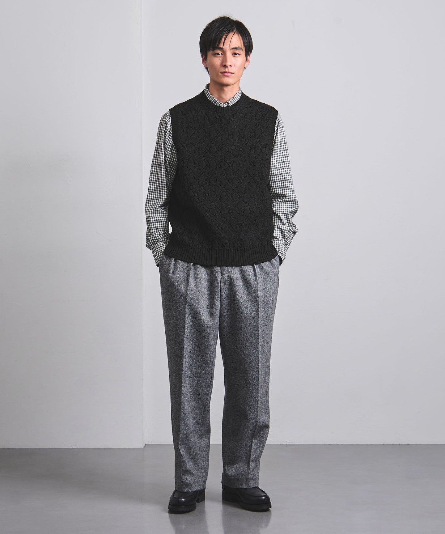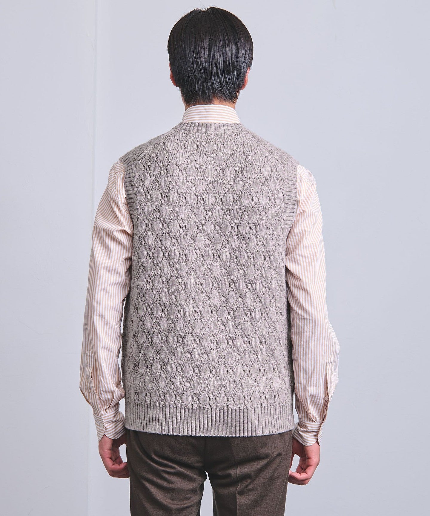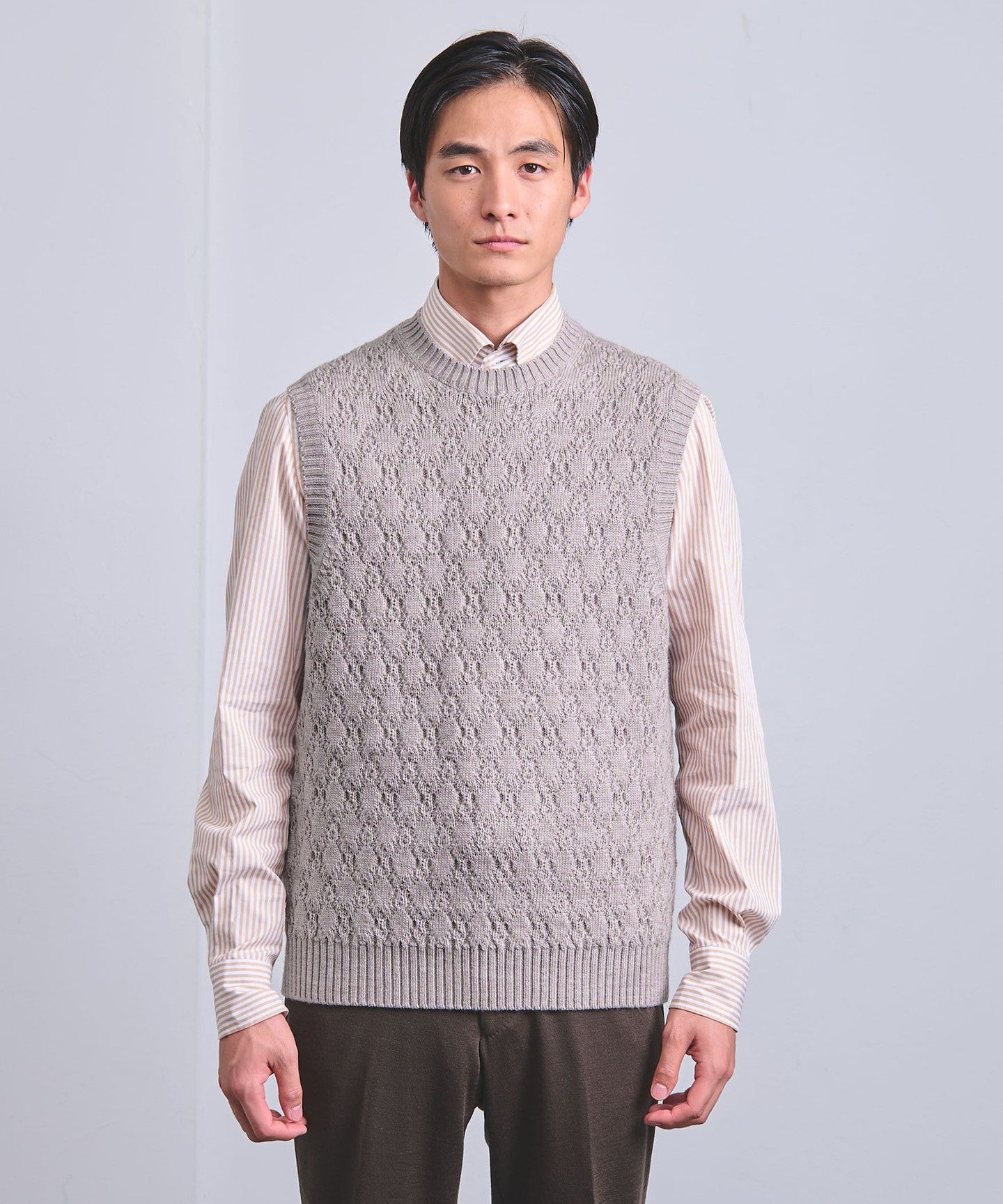 A crew neck vest featuring a shadow argyle-like knit design.