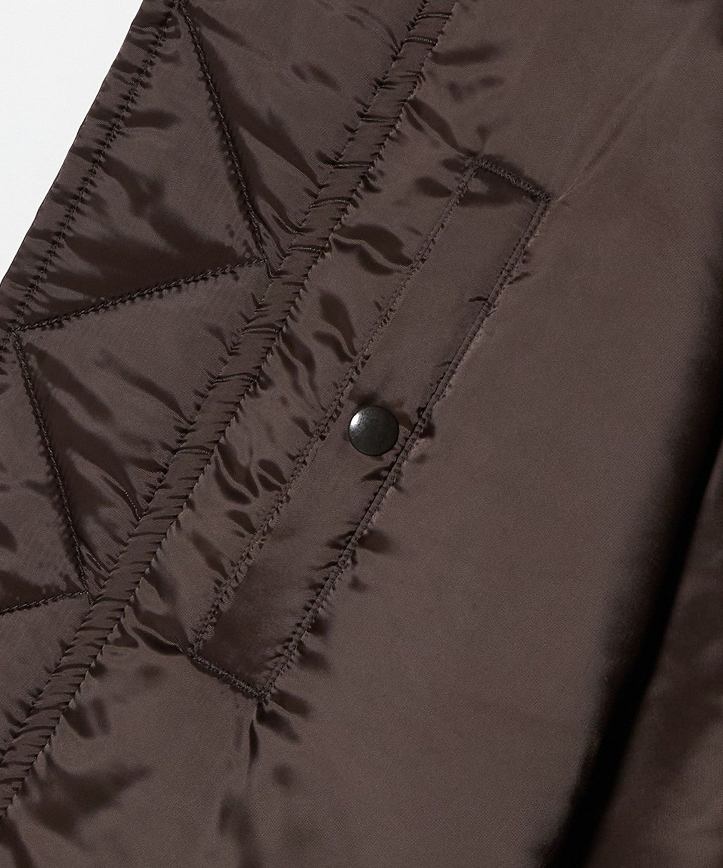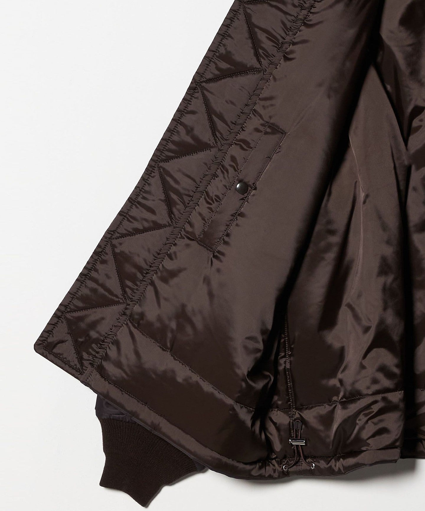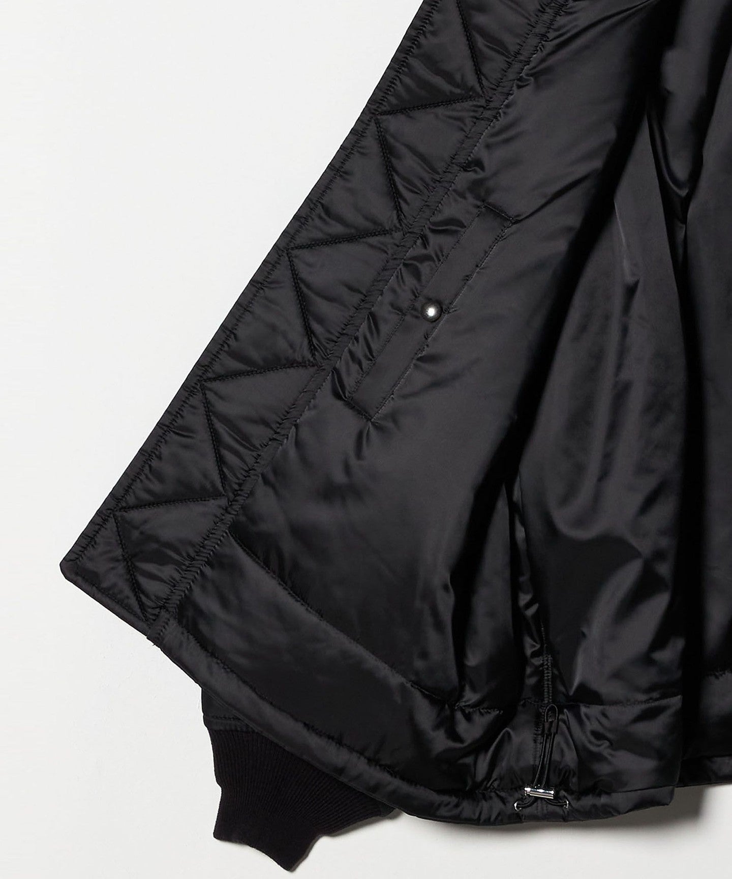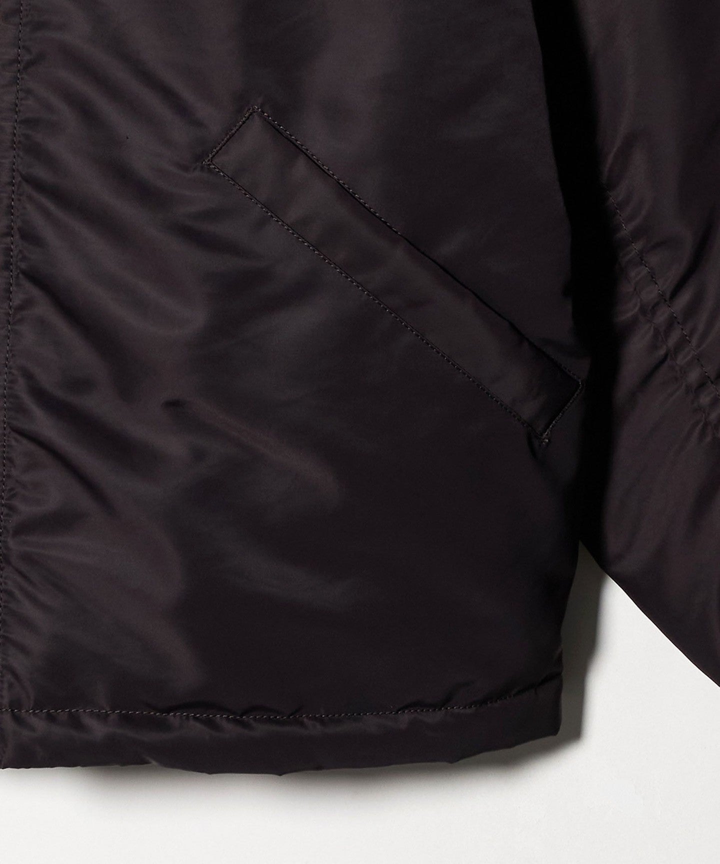 This flight jacket is crafted from nylon twill by OLMETEX, a premium Italian synthetic fiber manufacturer. Based on the MA-1, it retains traditional details like seamless circular knit ribbing and arm pockets, while elevating it to a modern, urban feel. The high-quality nylon fibers and sophisticated finishing techniques result in a dense, thick construction, yet soft, elegant, and luxurious finish. The zippers are made by the Italian manufacturer RACCAGNI, and the sophisticated balance of the moderate oversized fit and tight ribbing enhances the fashionable mood.