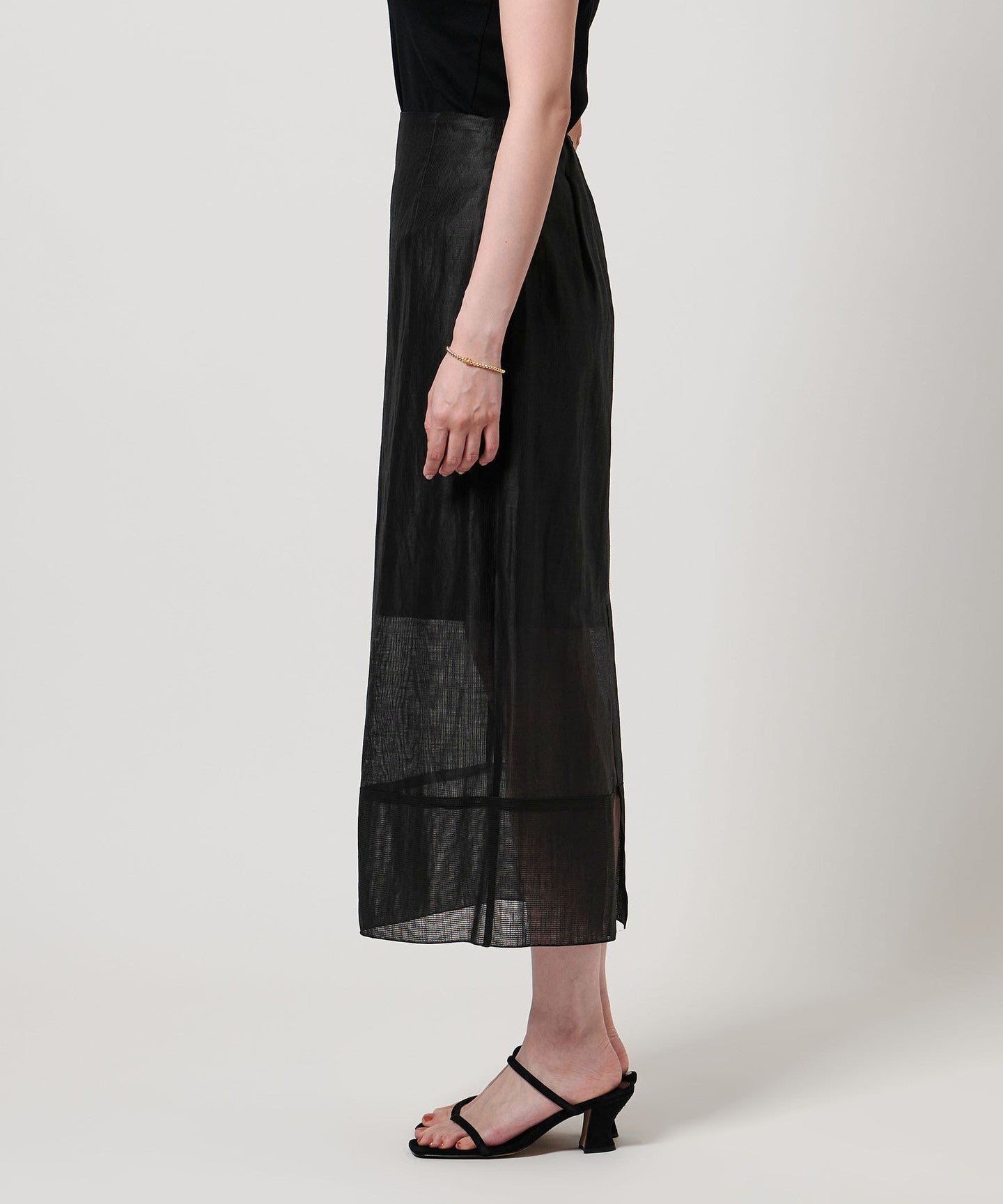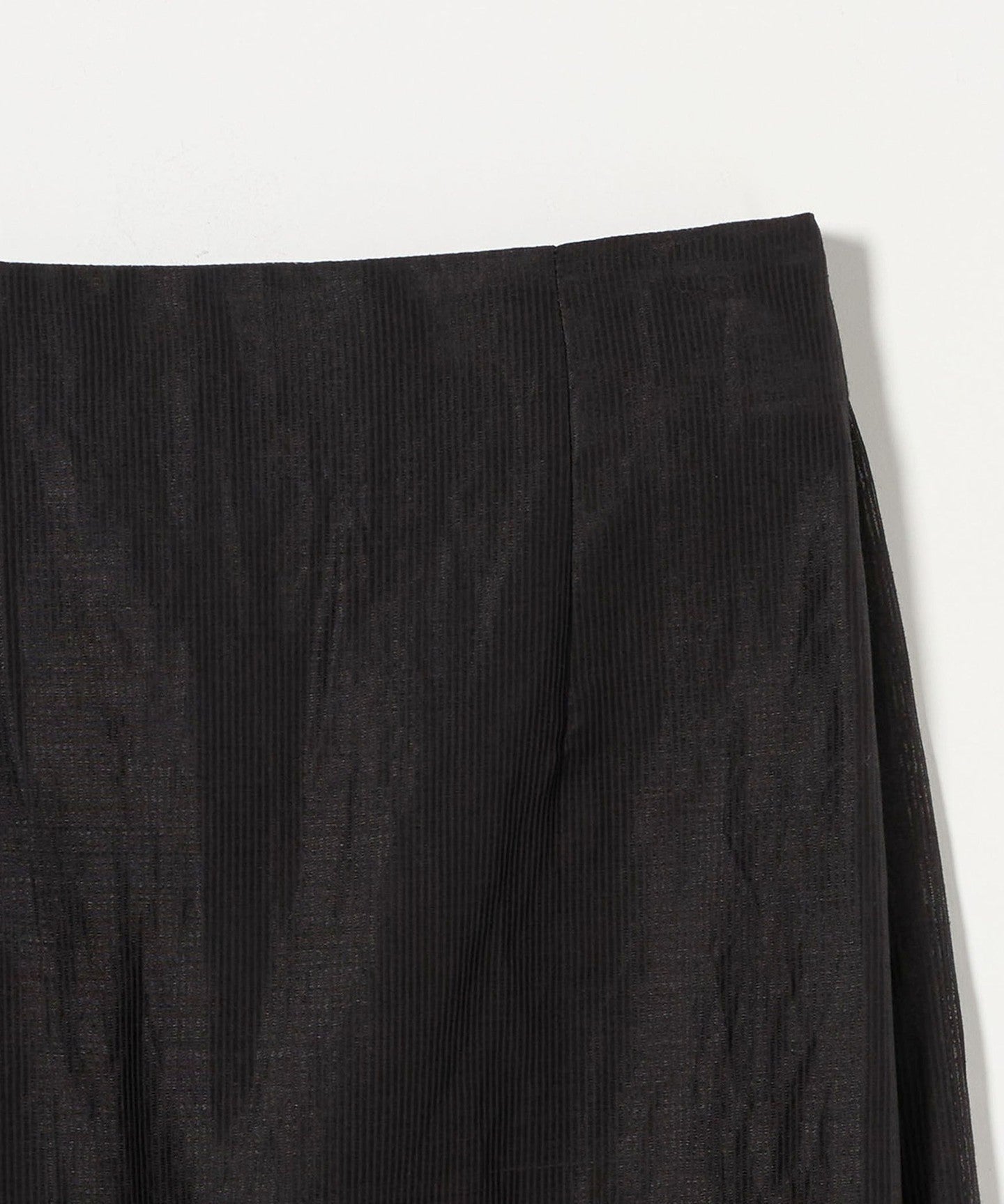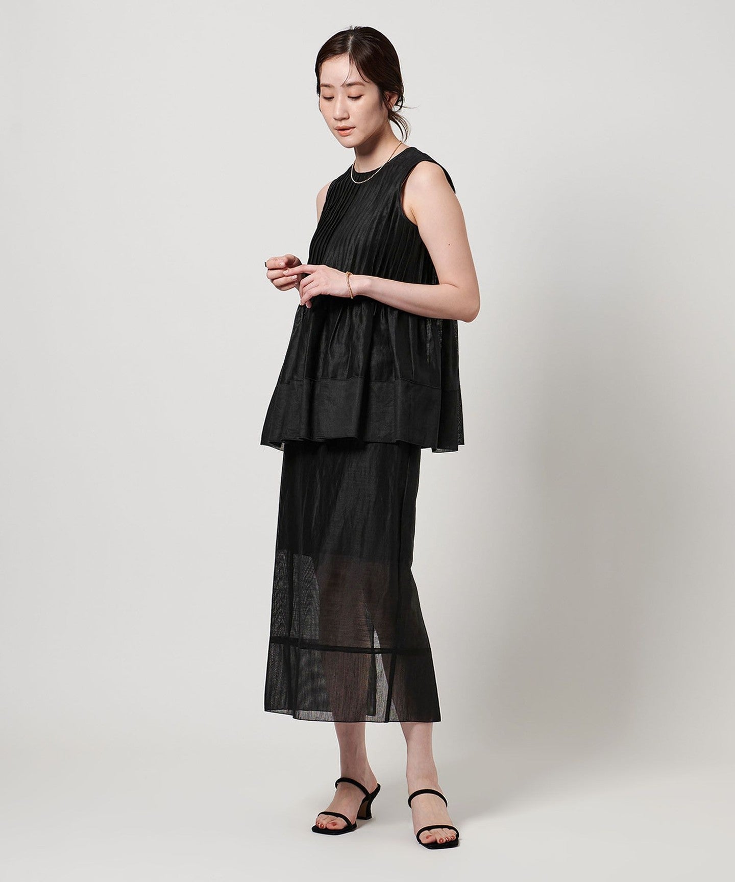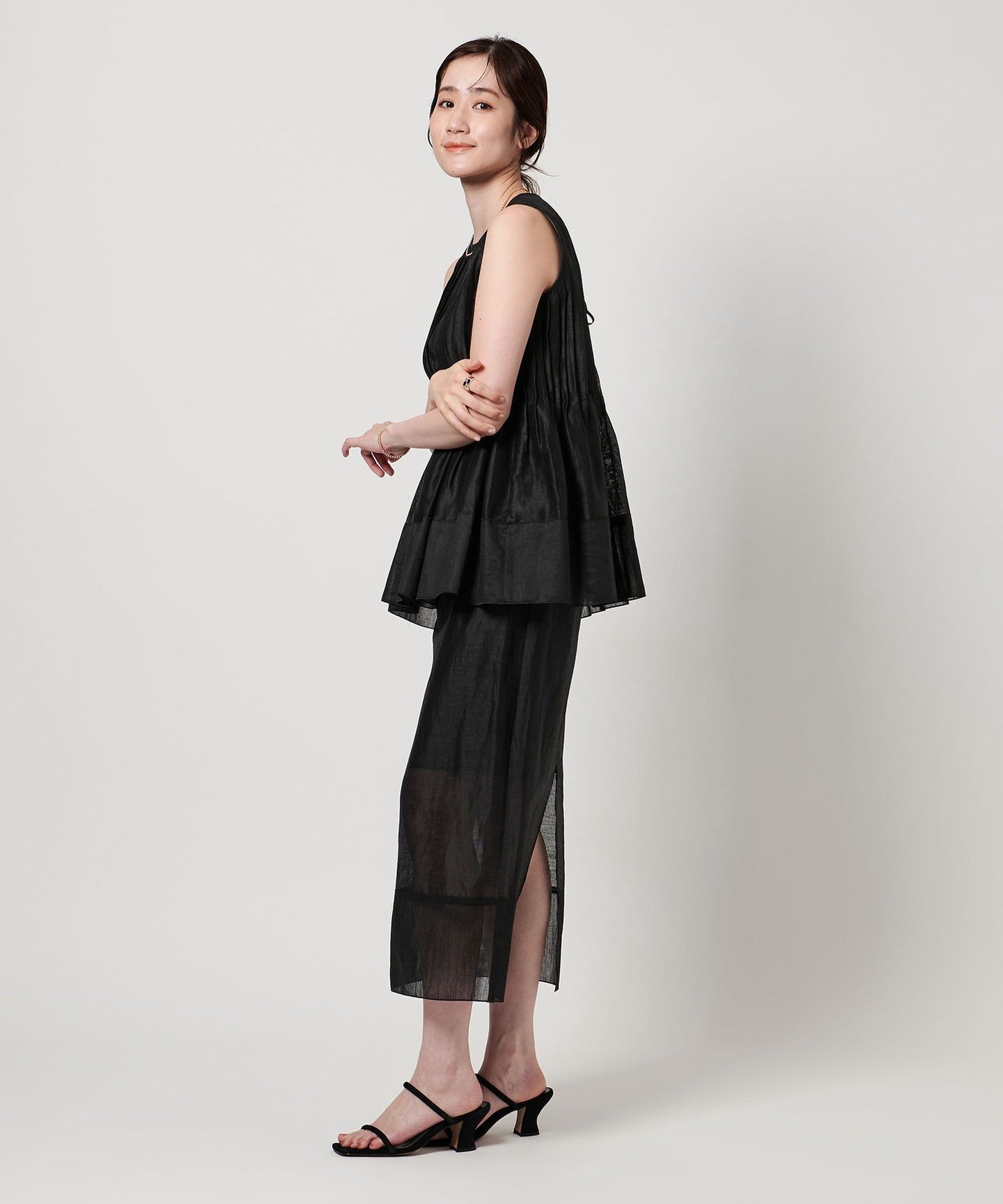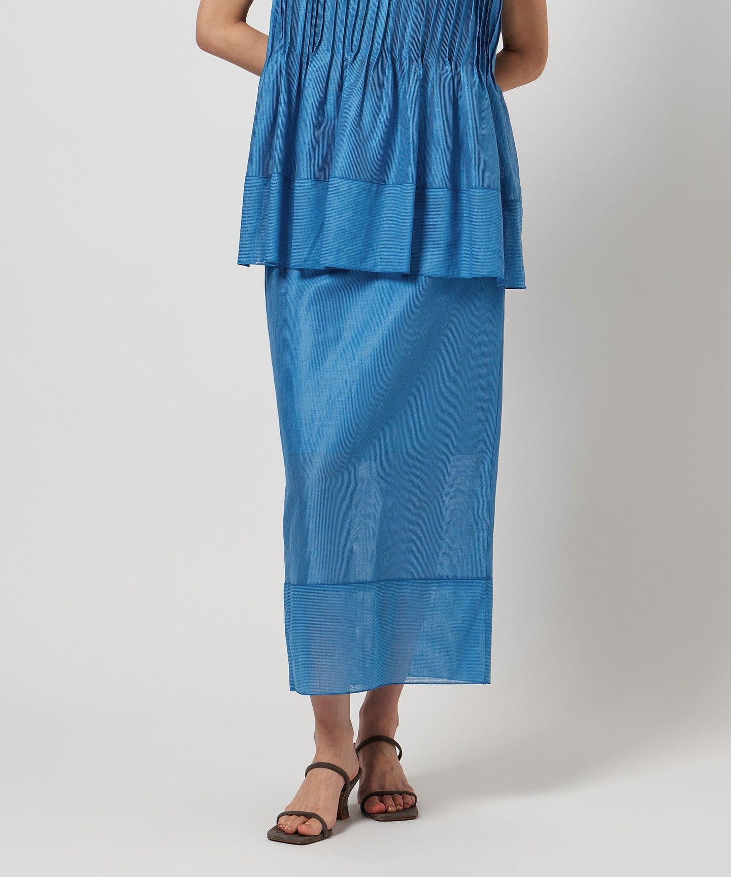 It can be worn as a set with a blouse made of the same material, or worn alone and easily combined with T-shirts and knitwear, allowing for a wide range of coordination options.