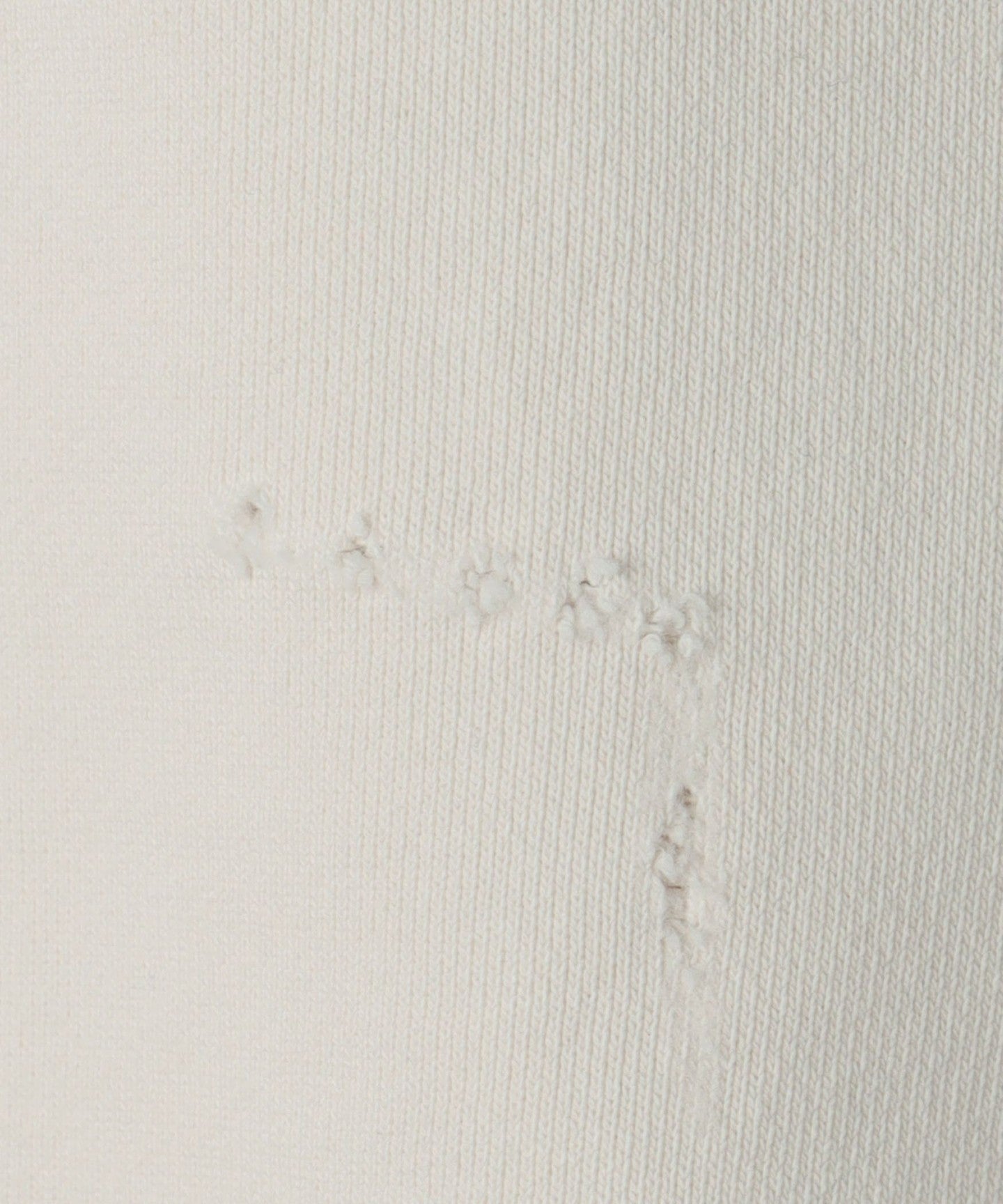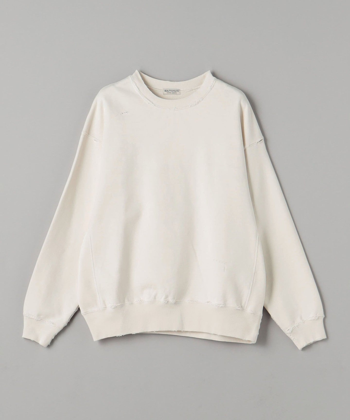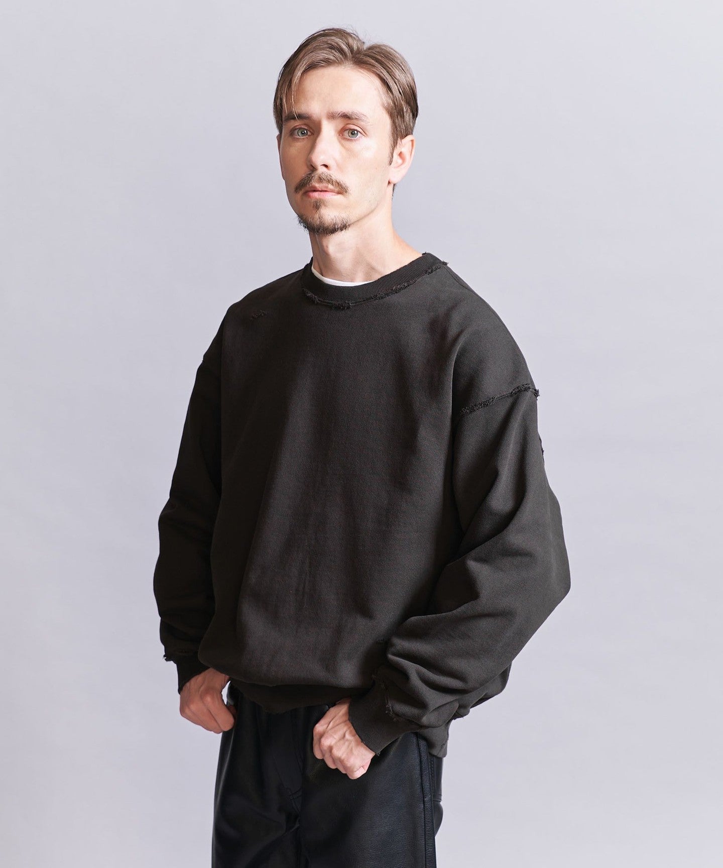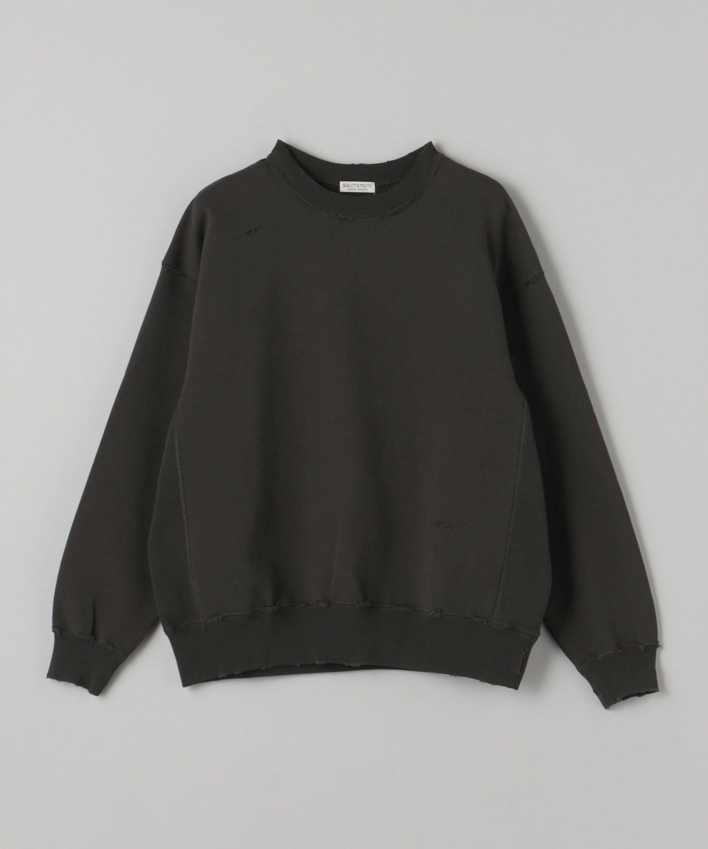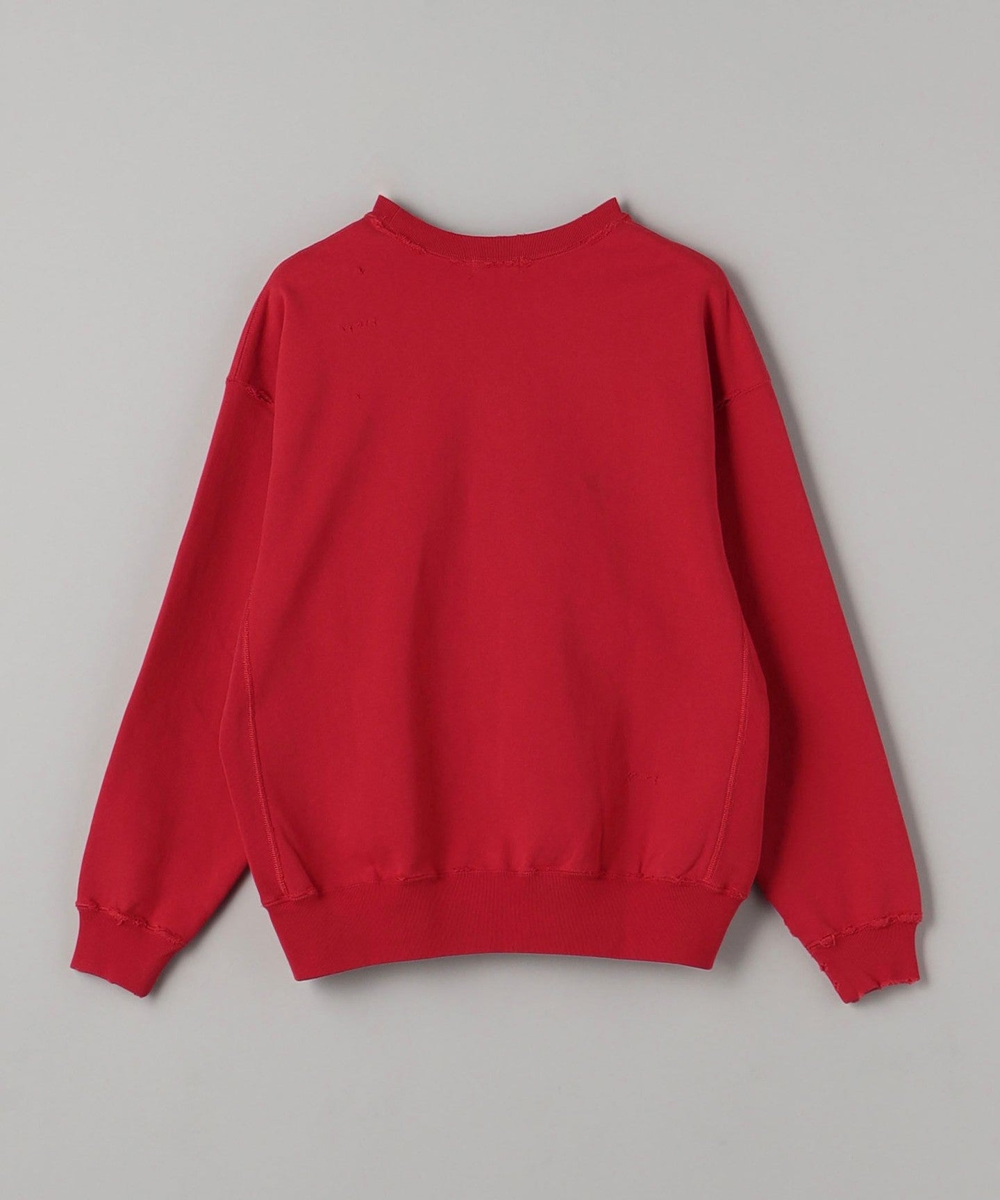 This distressed sweatshirt has a vintage feel that has been hand-applied to the seams around the neck, hem, and cuffs where stitching occurs.