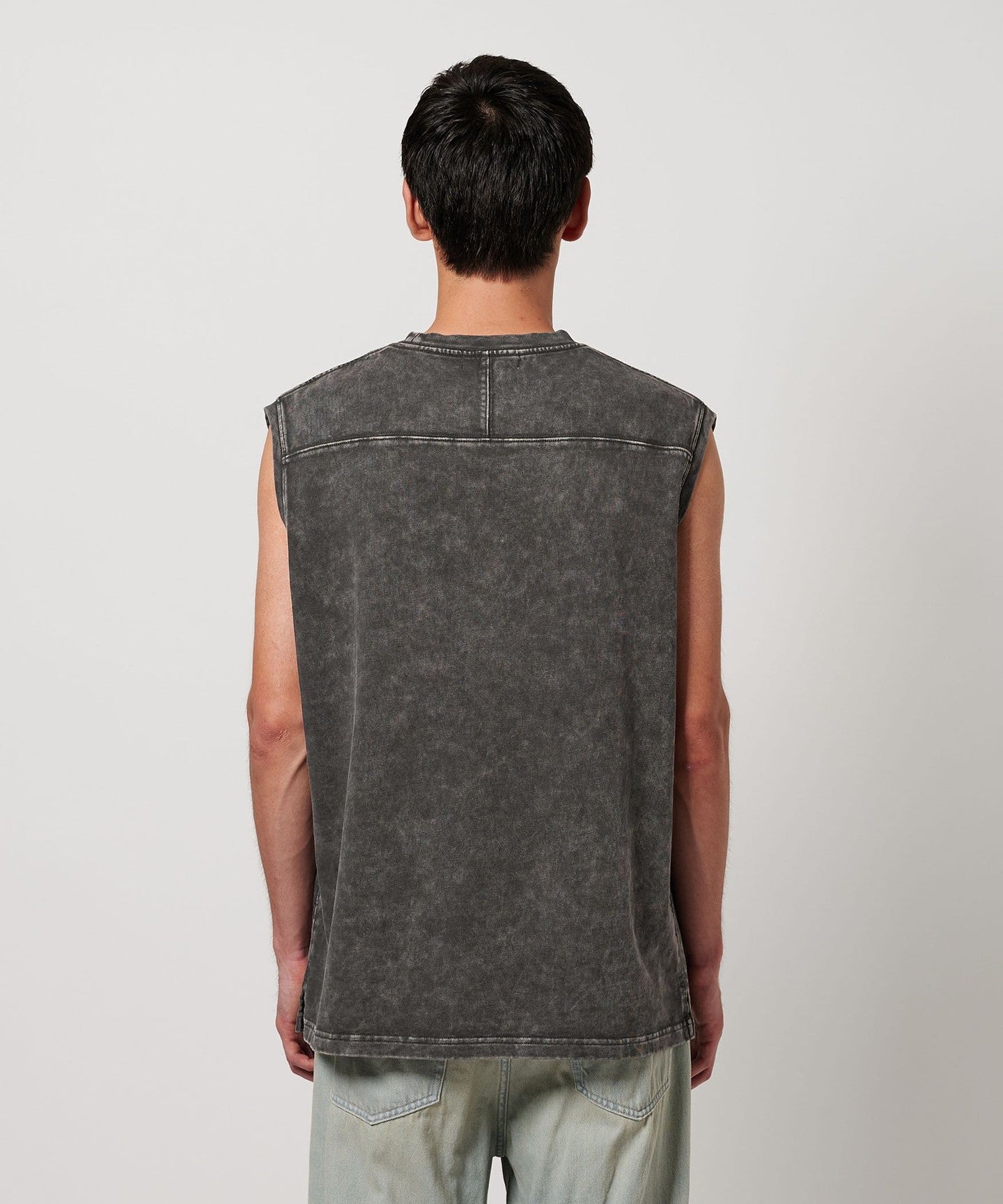 A sleeveless T-shirt made from a sturdy, opaque jersey material.