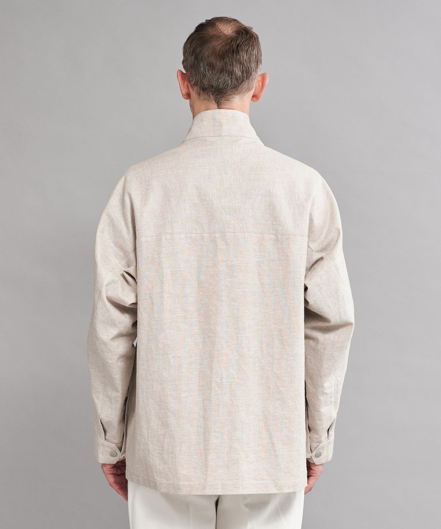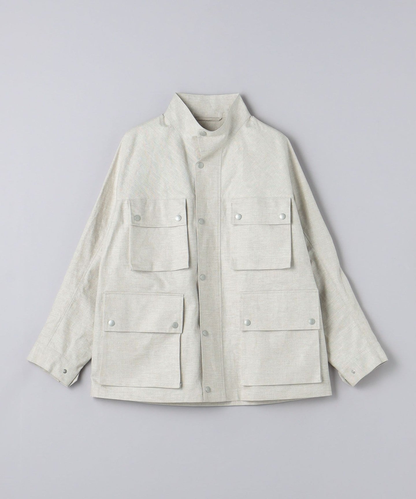A loose-fitting dolman sleeve stand-collar blouson.