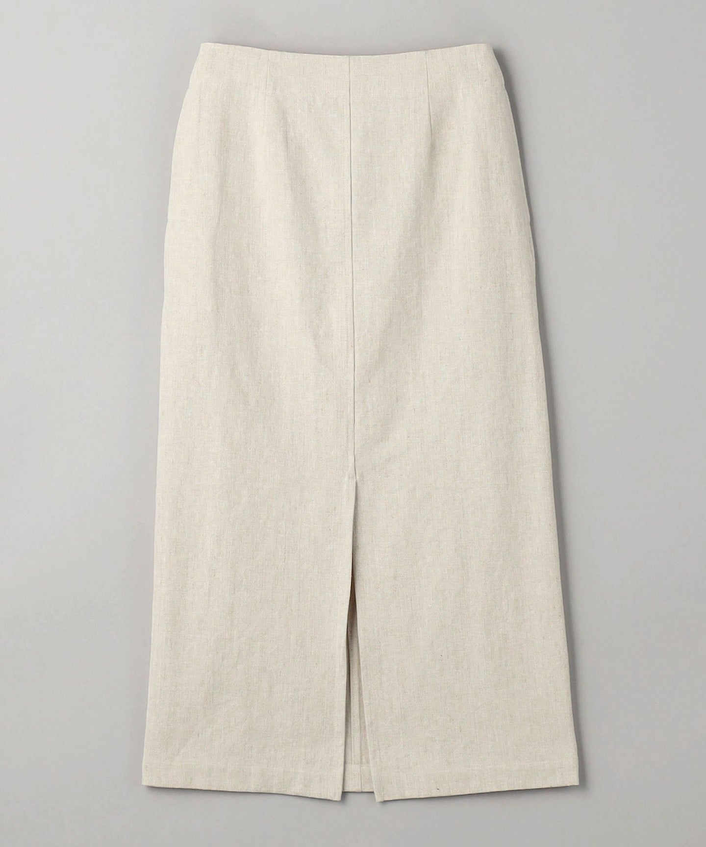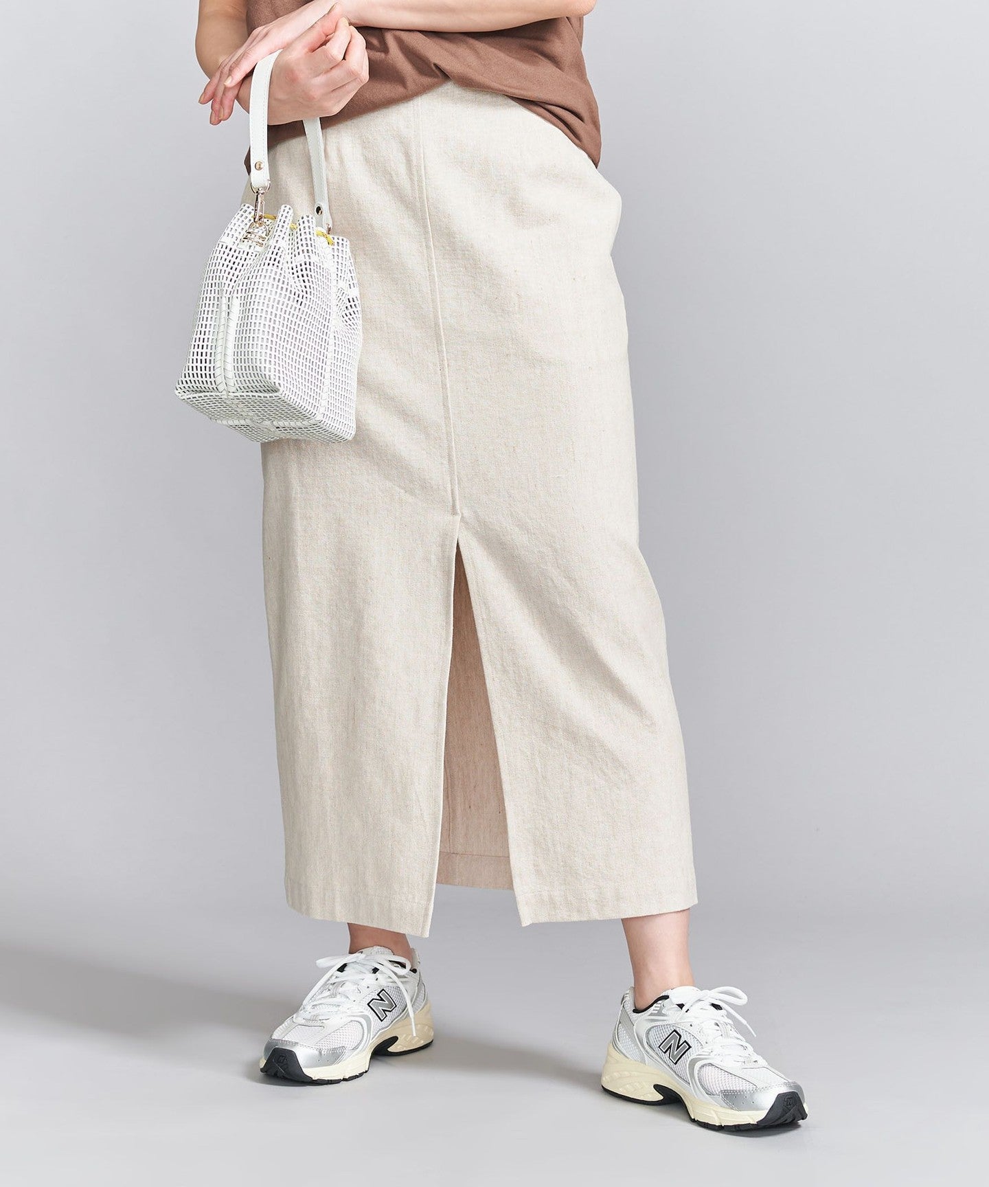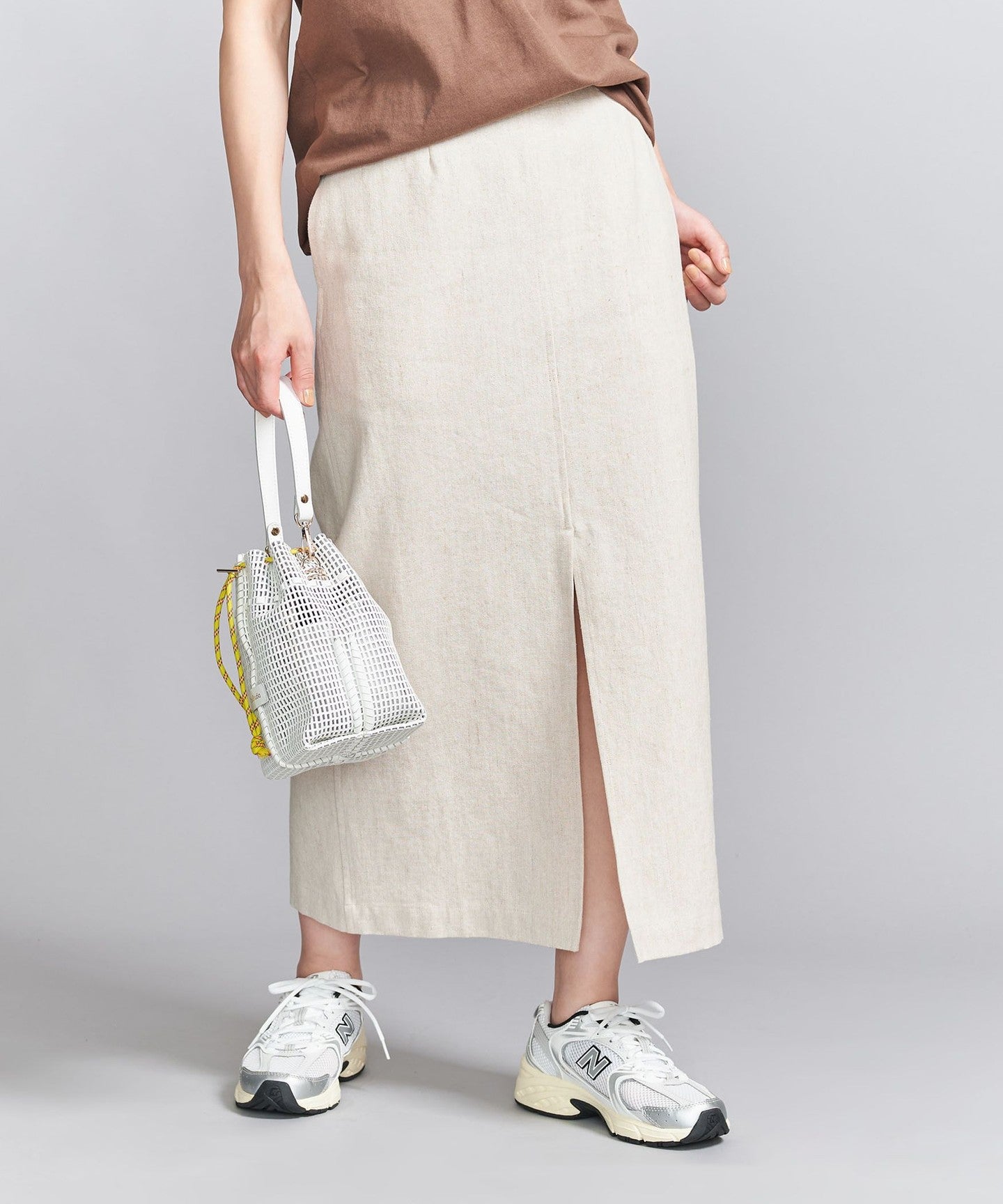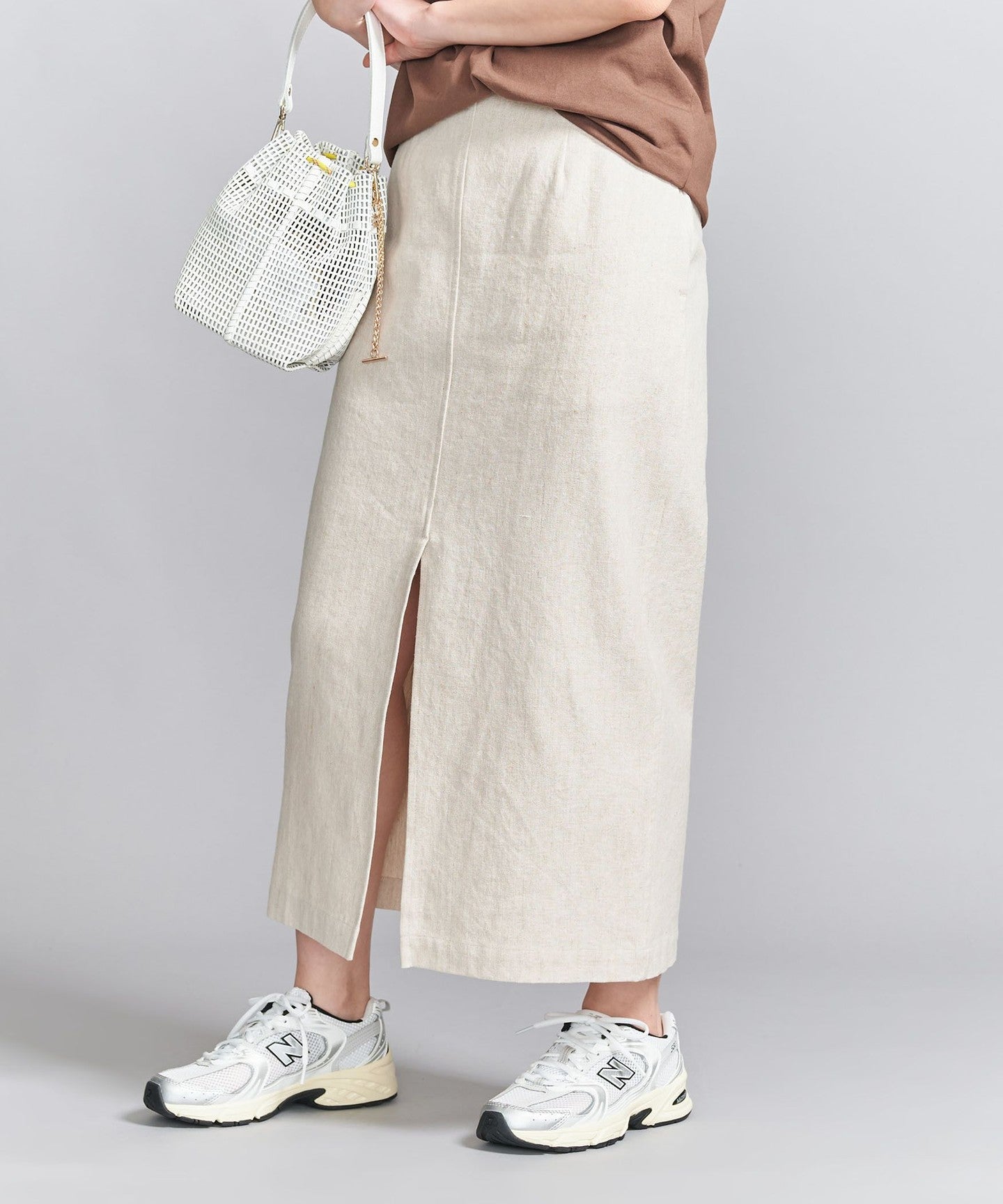 A slit skirt that eliminates accessories such as a belt and makes the most of the texture of the fabric.