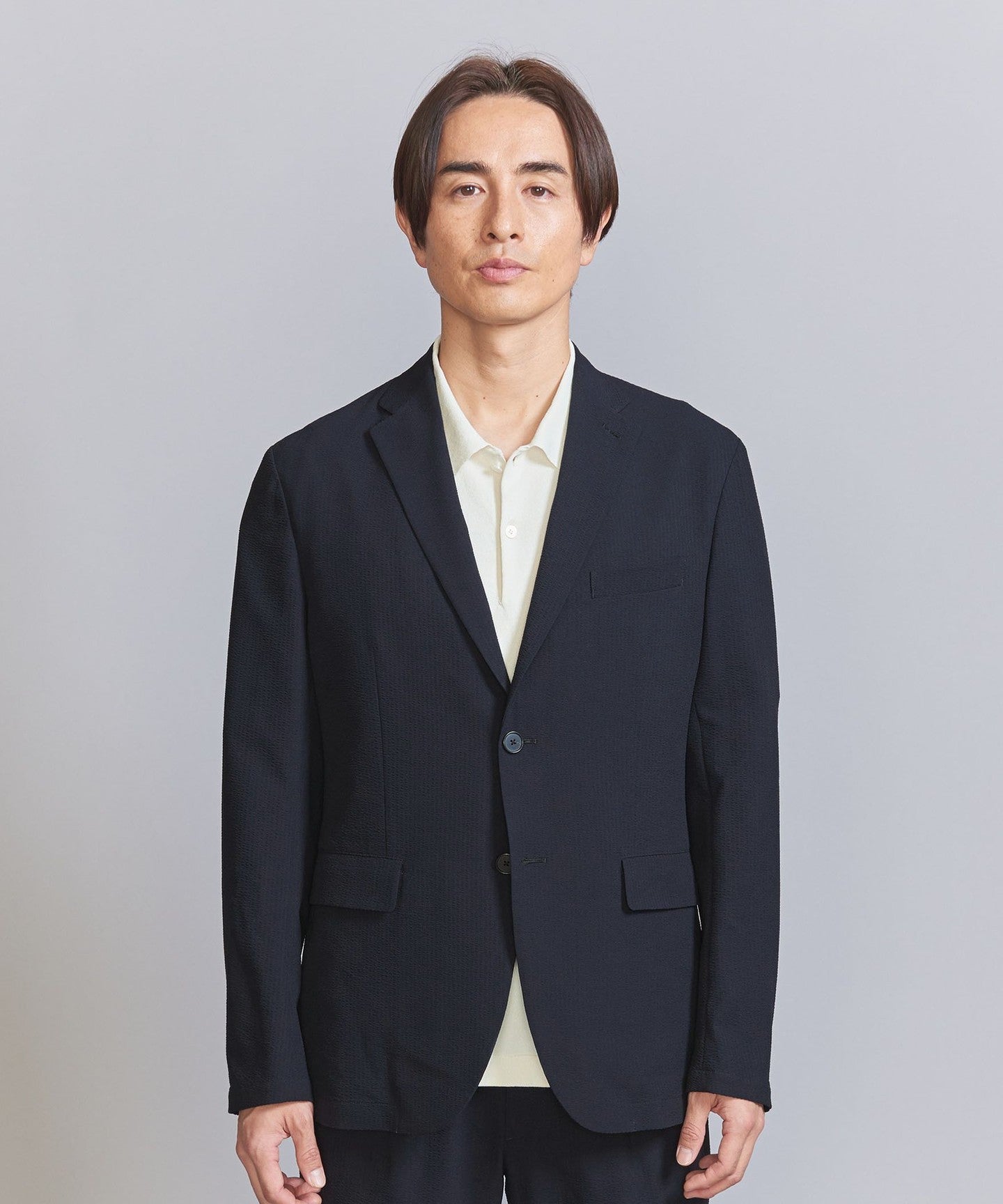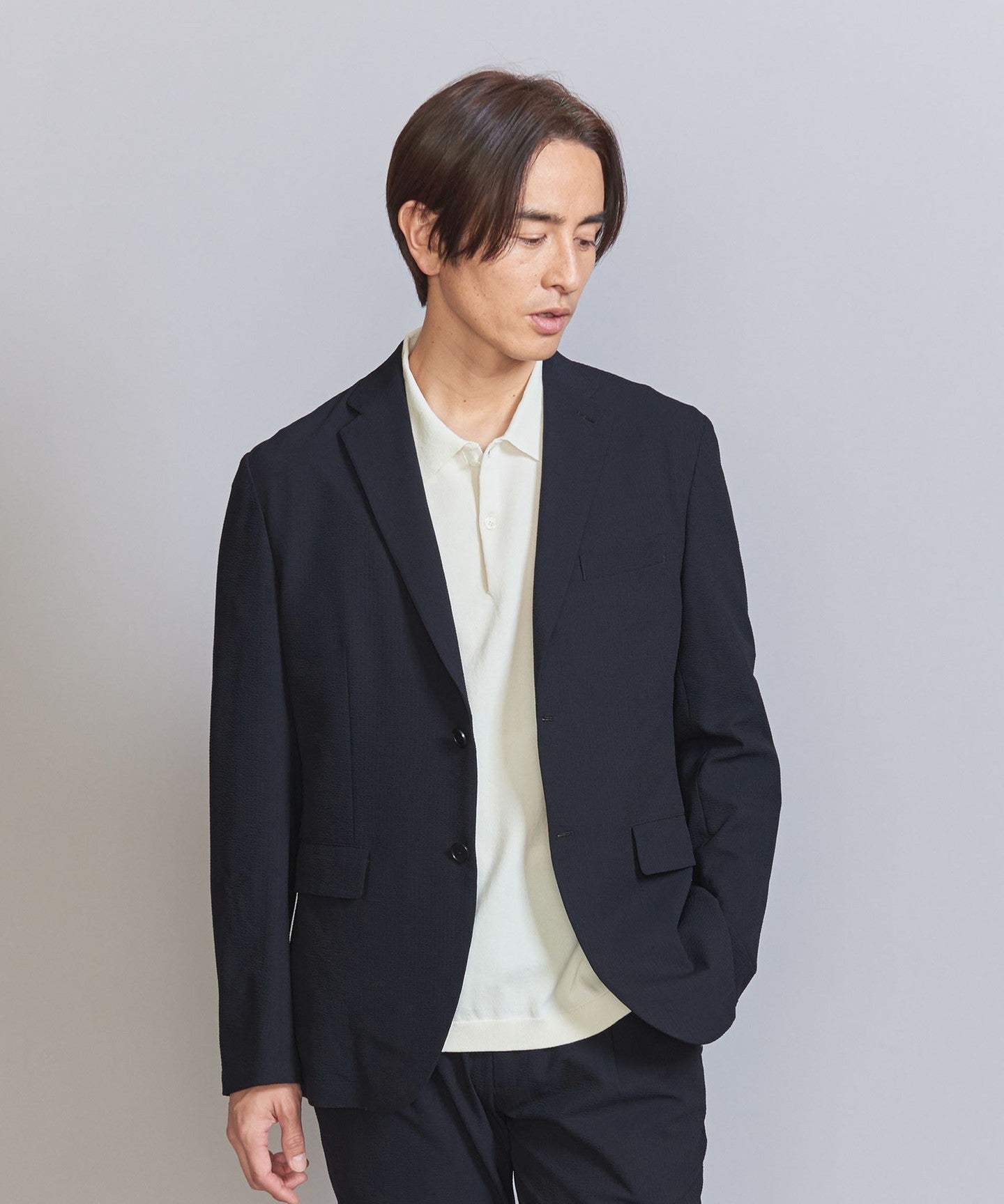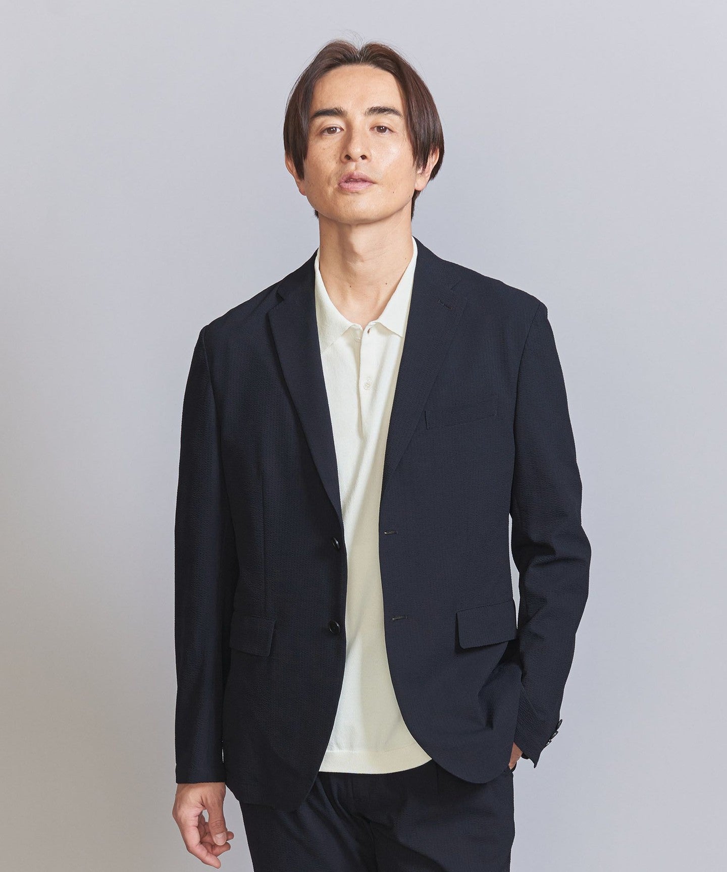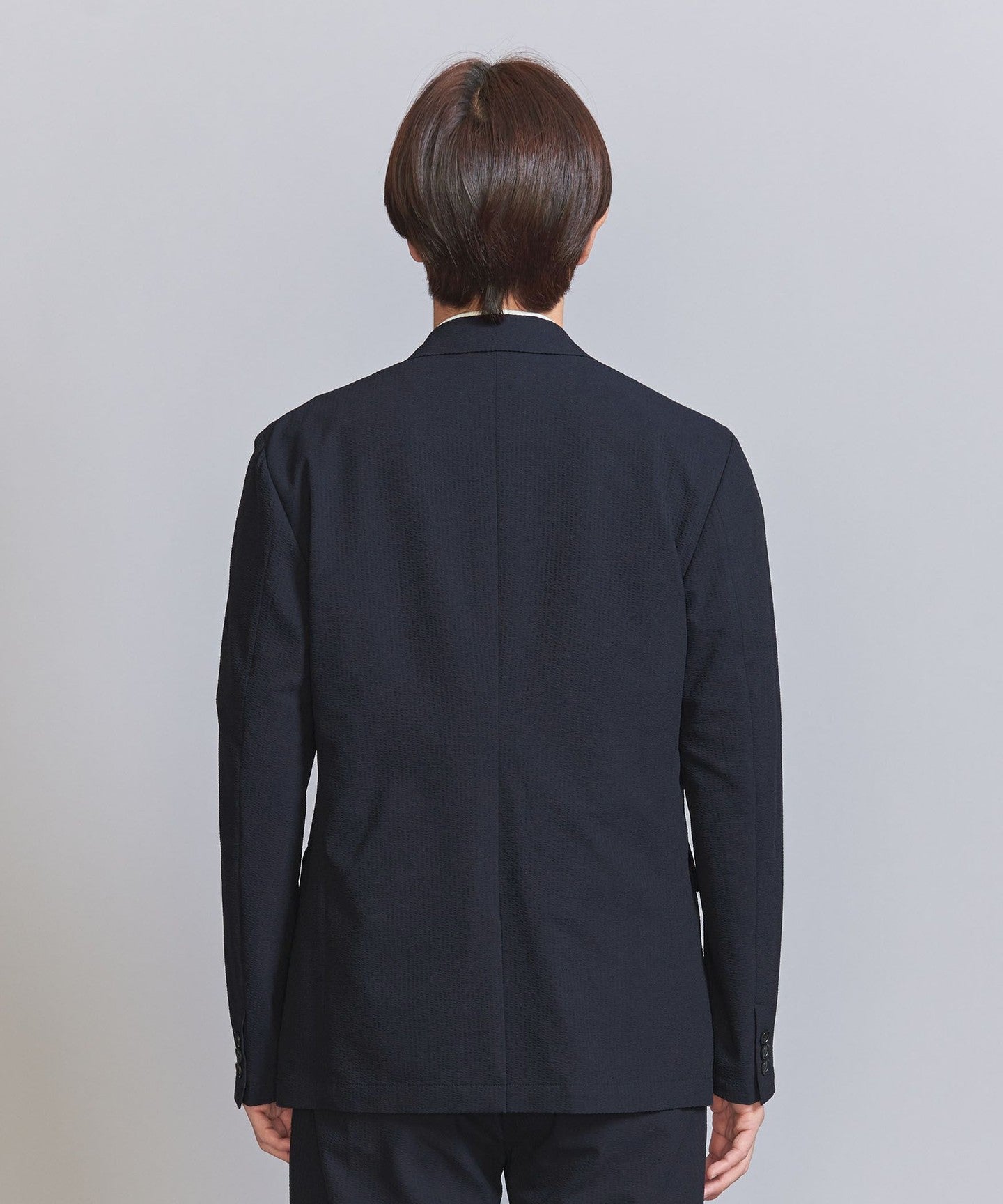 A single-layer jacket made with Toray's Ecodia (R), which combines the elegance of seersucker with functionality.