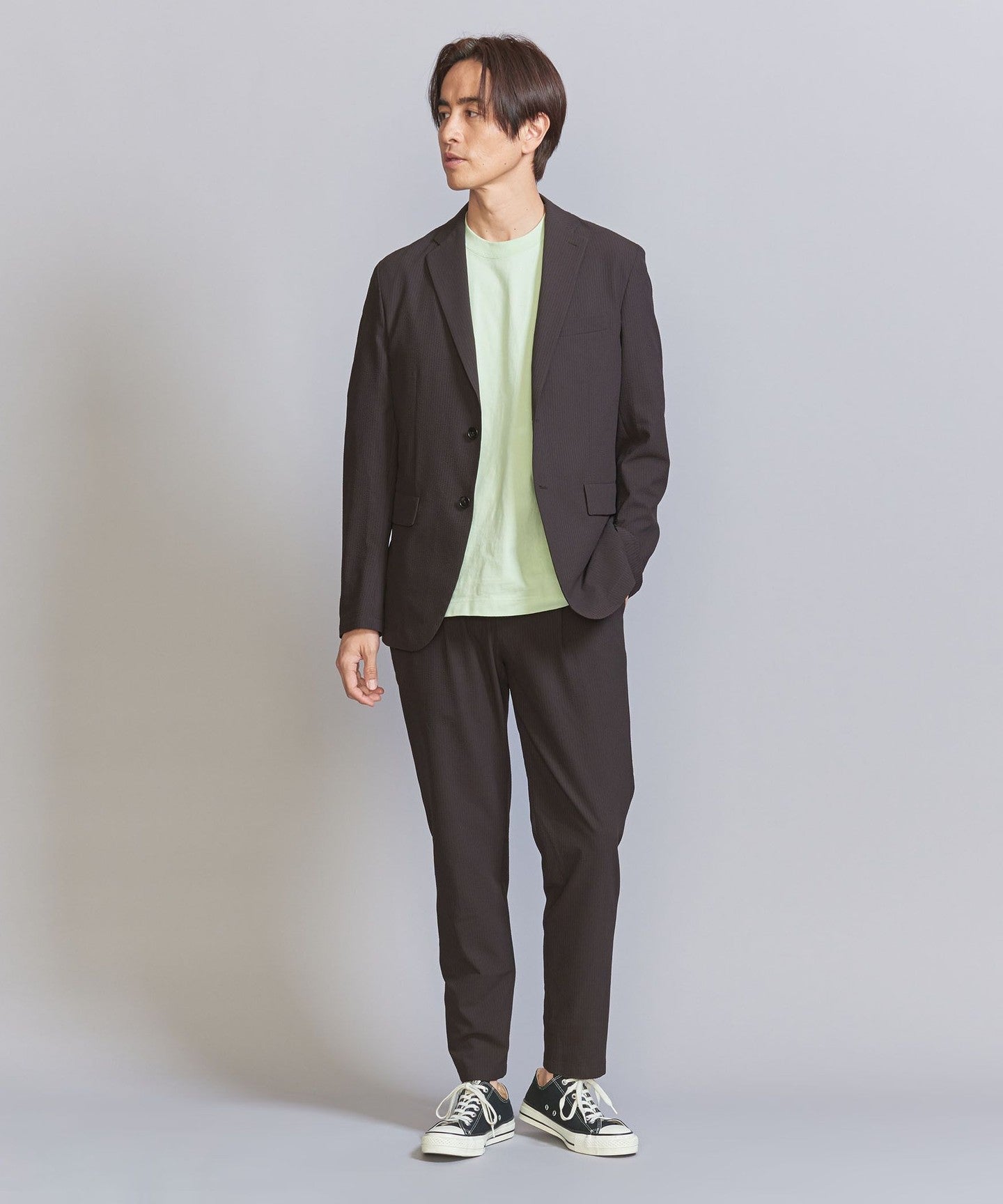 In addition to leather shoes, light and casual sneakers also go well with this outfit.