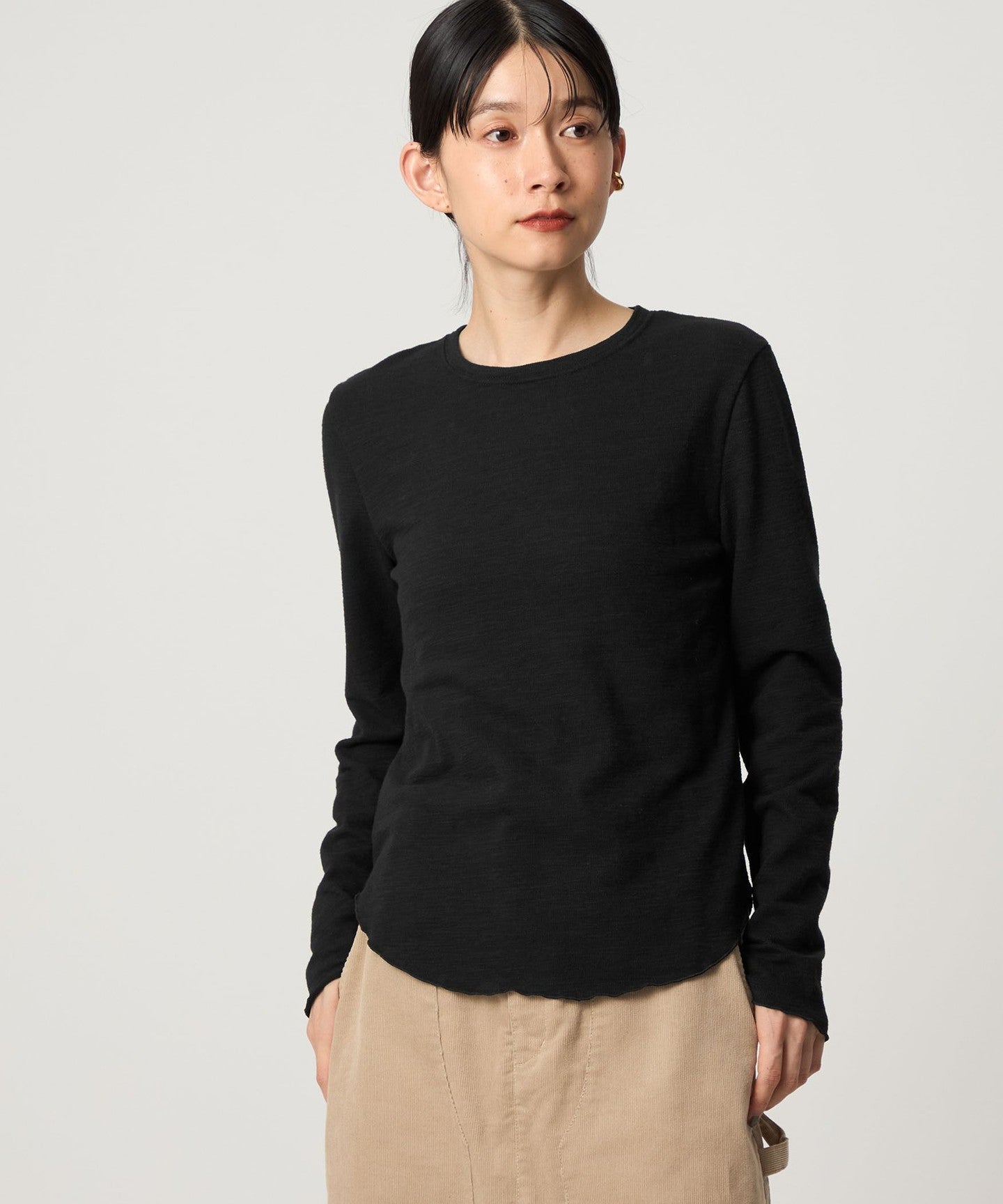 A simple long T-shirt made from slub ribbed fabric that can be worn daily.
