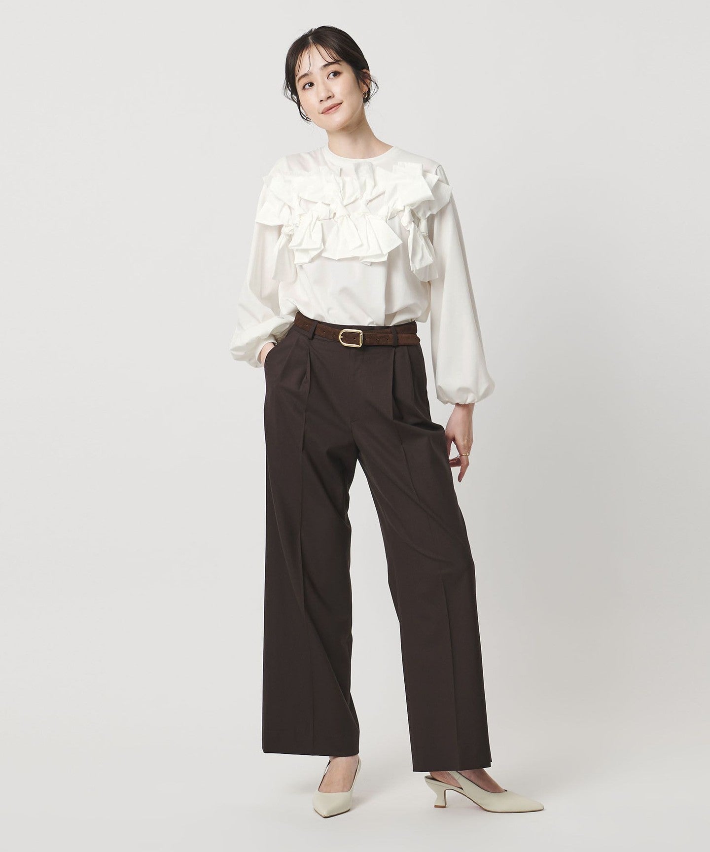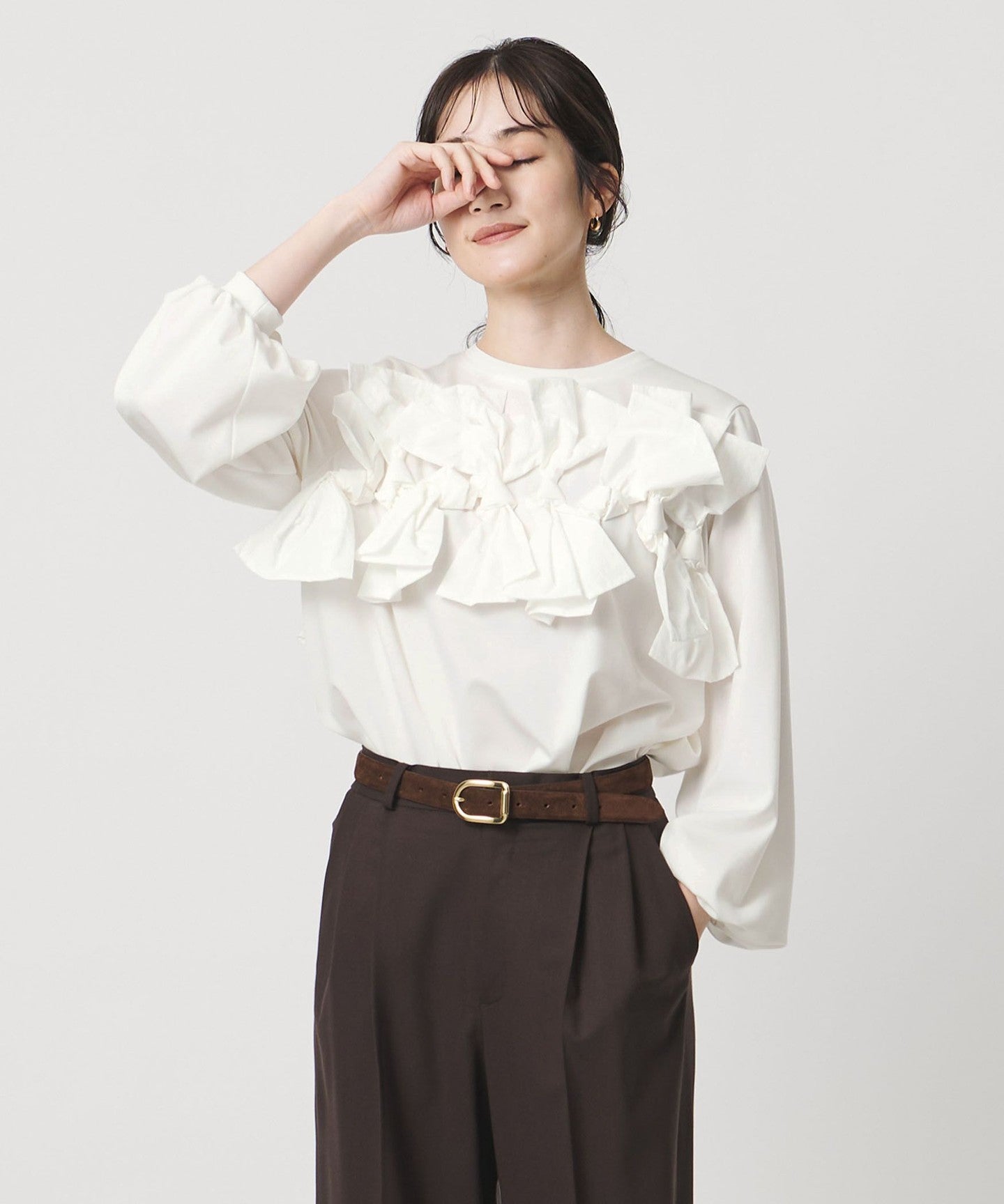 袖口にギャザーを入れたボリュームスリーブや、適度なネックの開きが女性らしい印象を演出します。