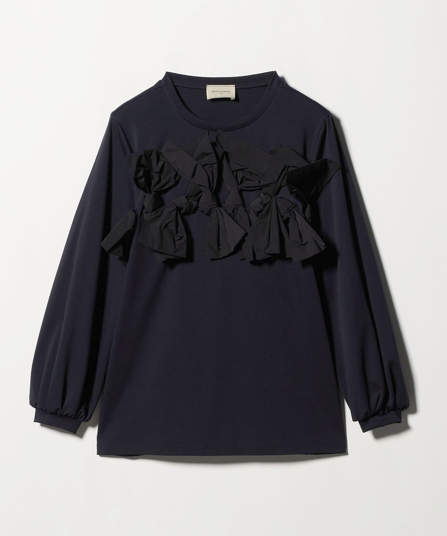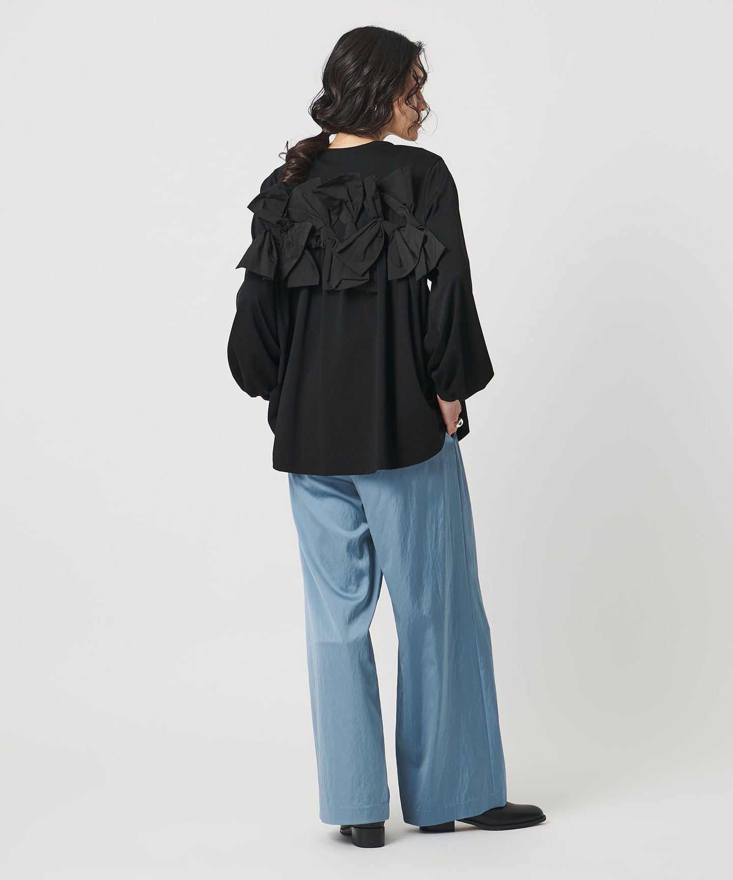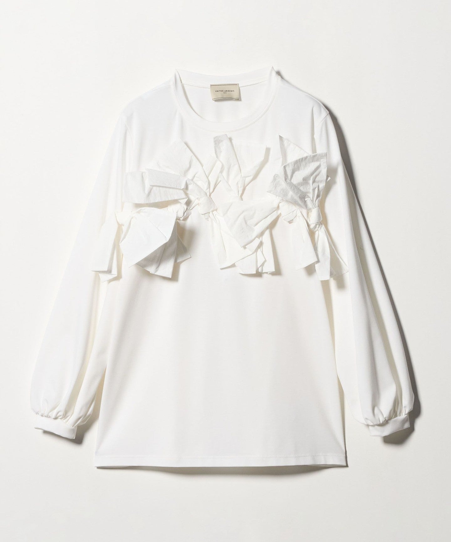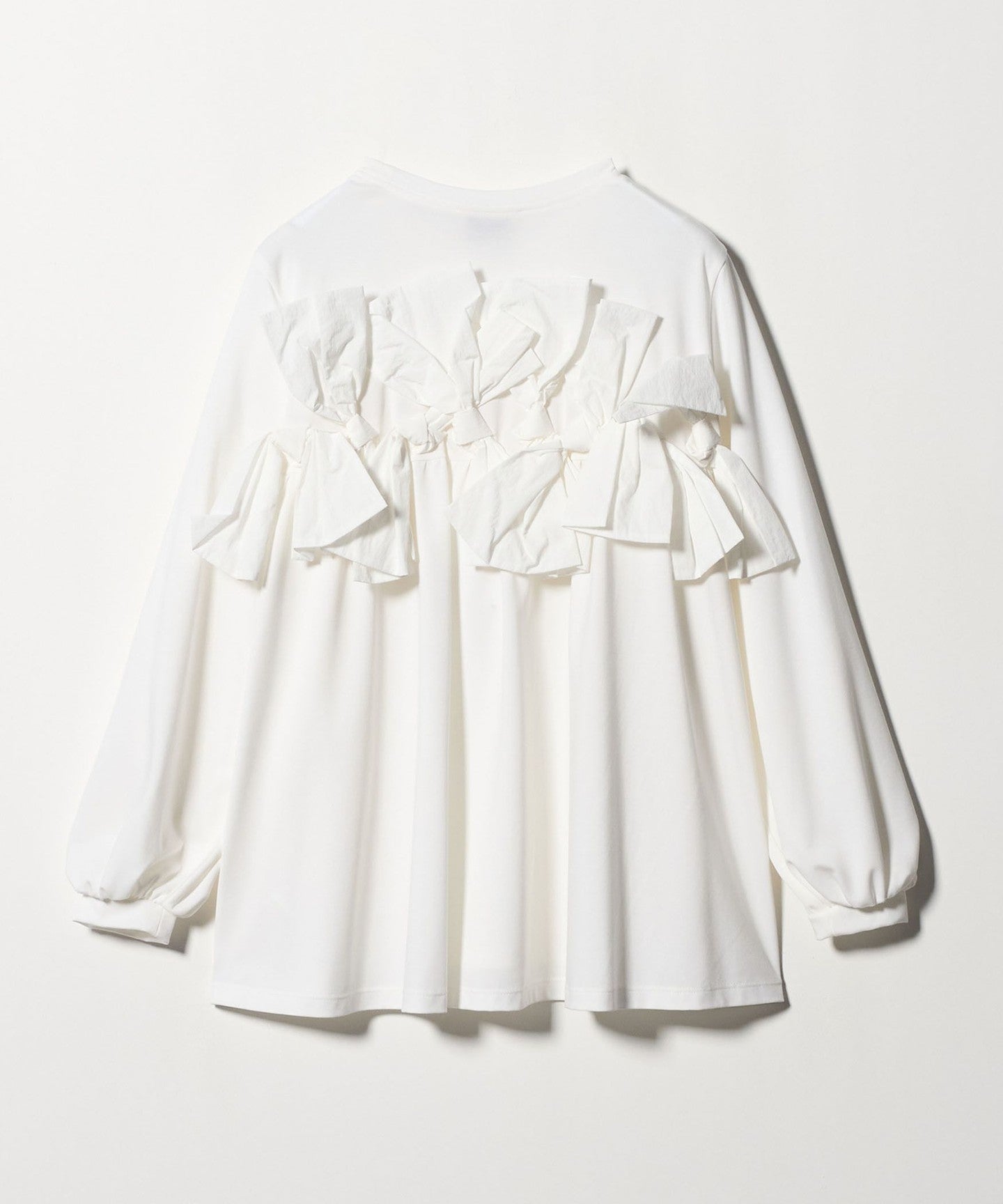 立体感のあるリボンモチーフを前後両面に大胆にあしらったデザインカットソー。