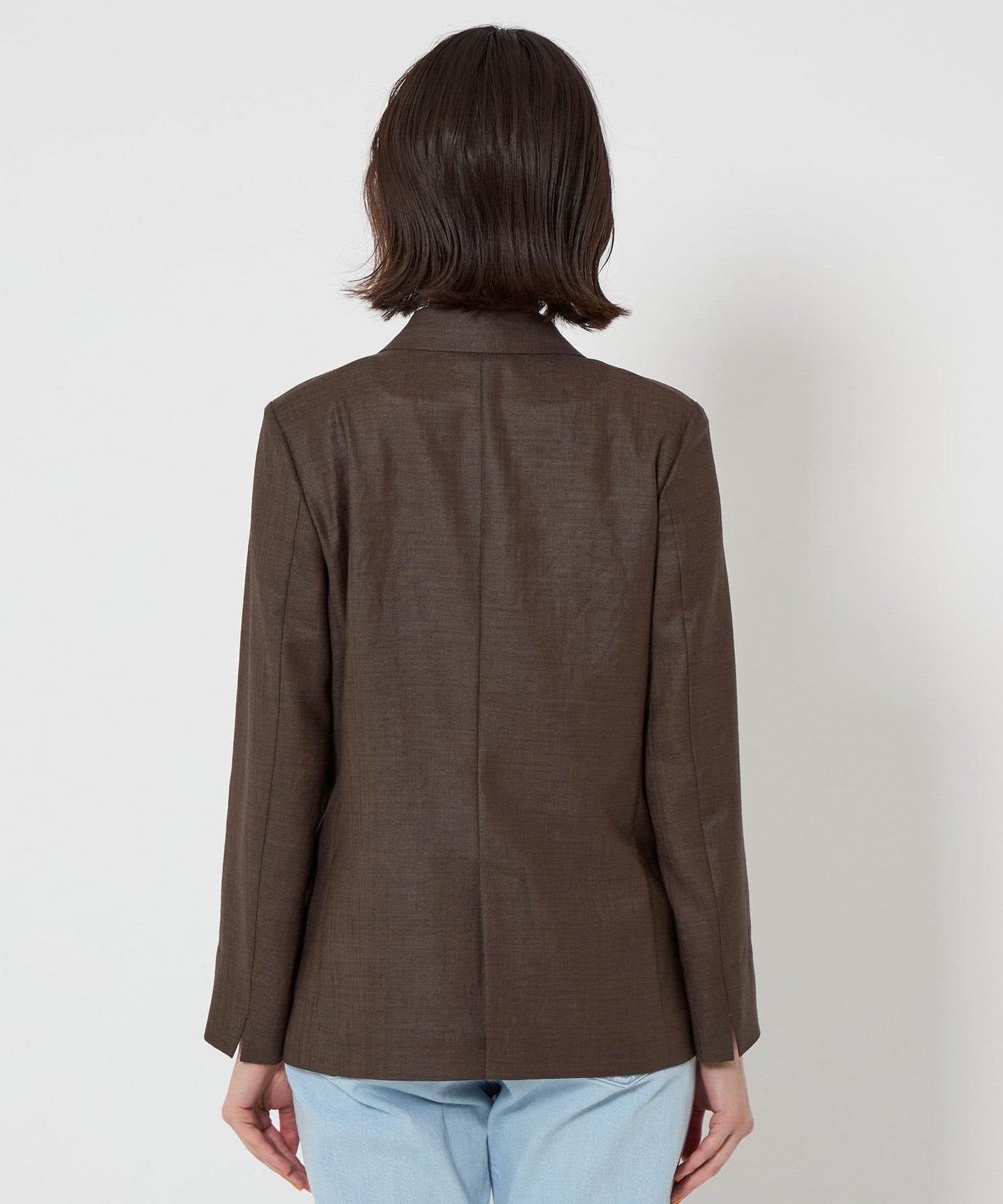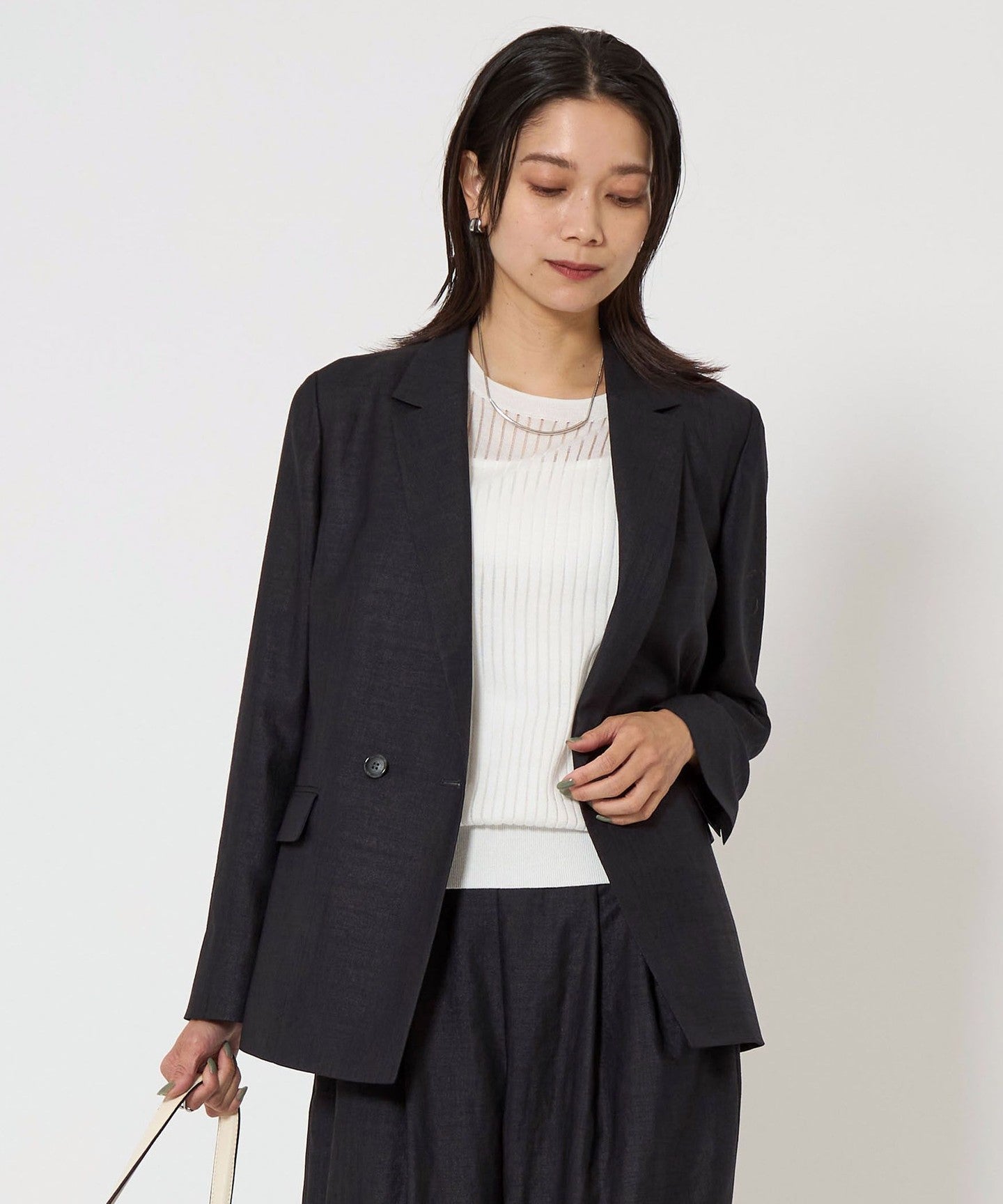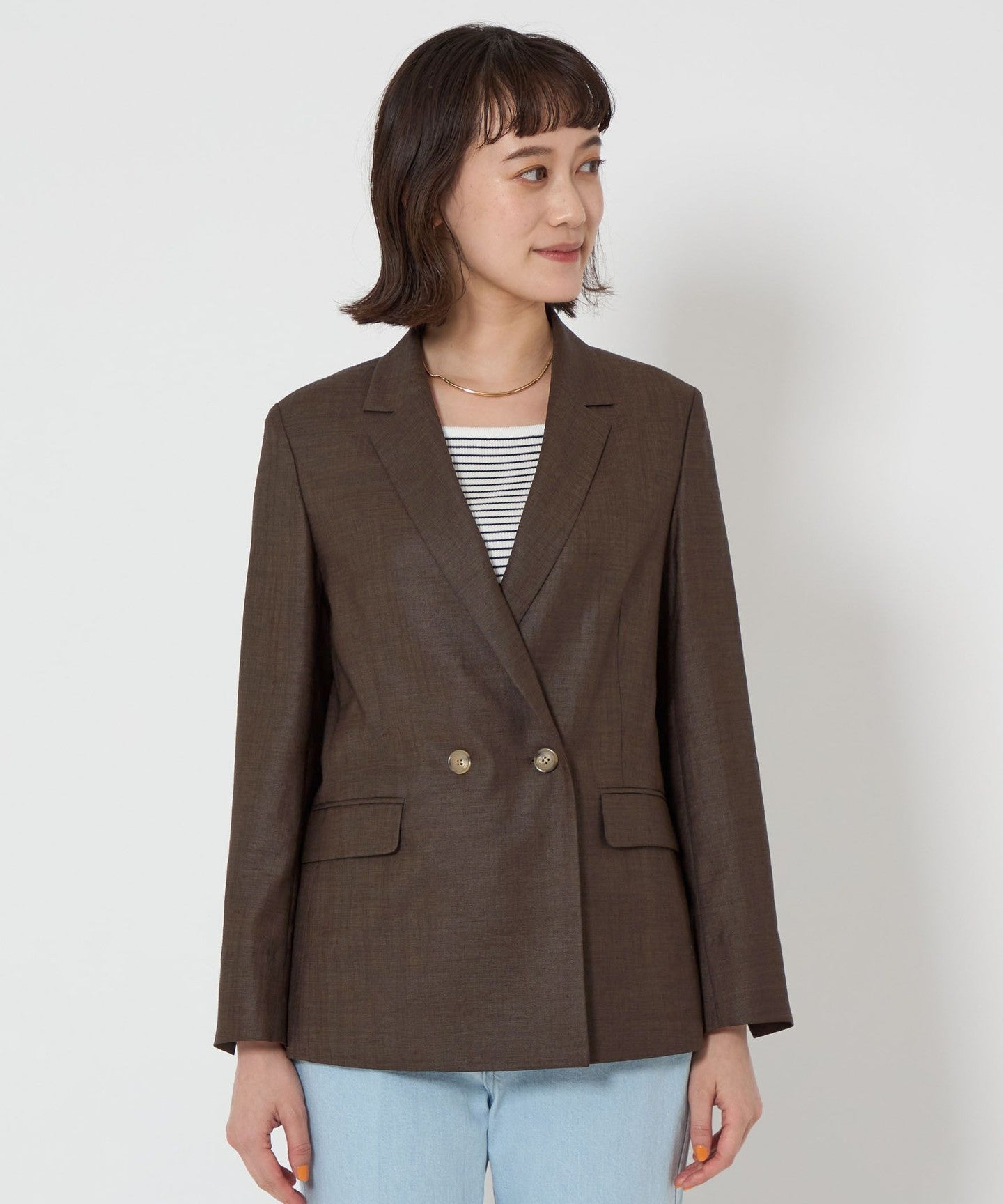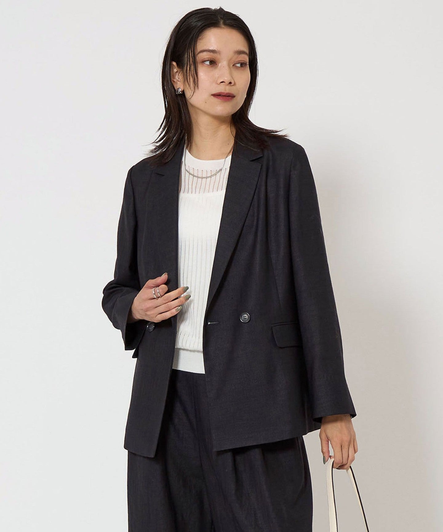 A double-breasted jacket with a natural texture and a refreshing feel