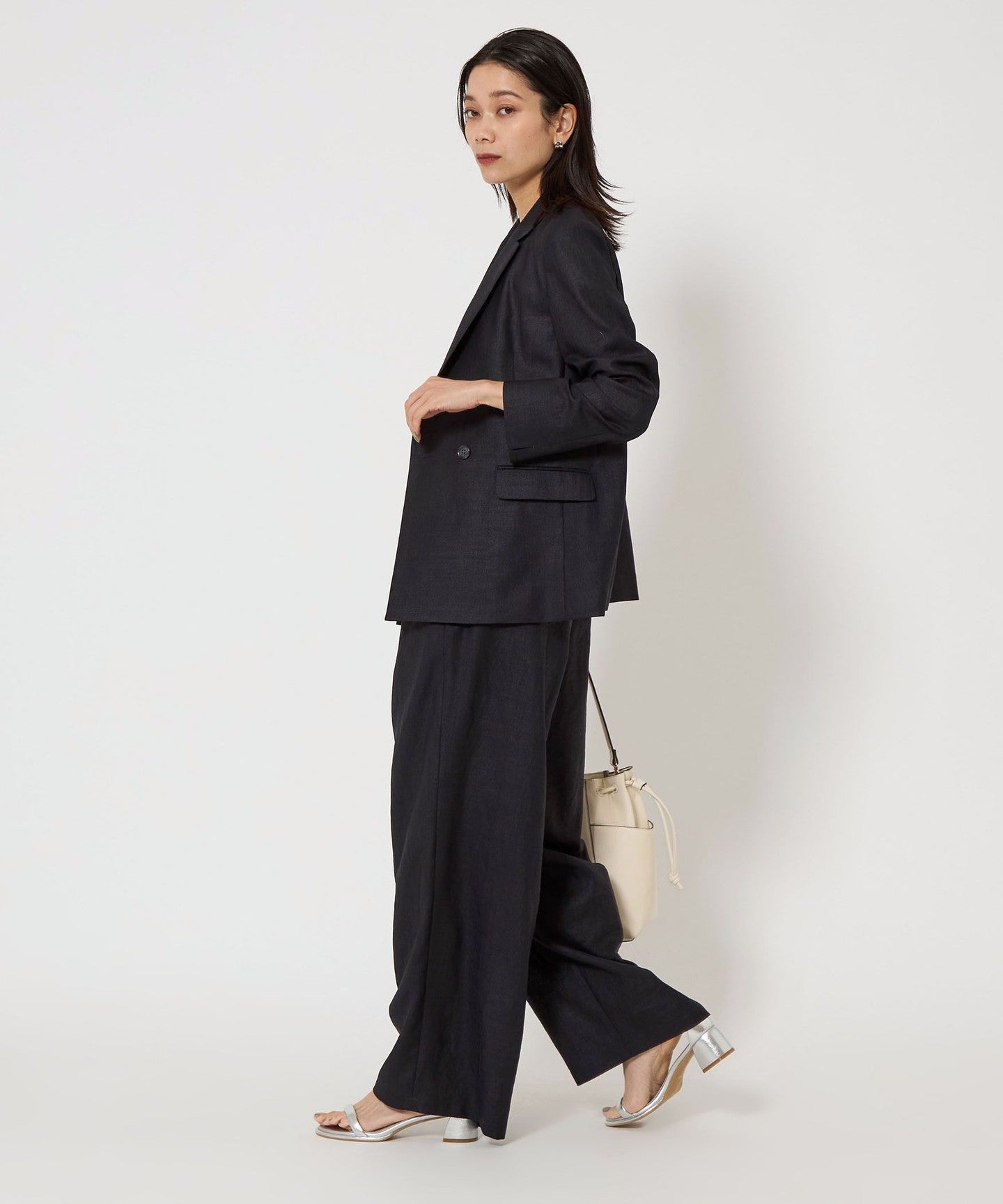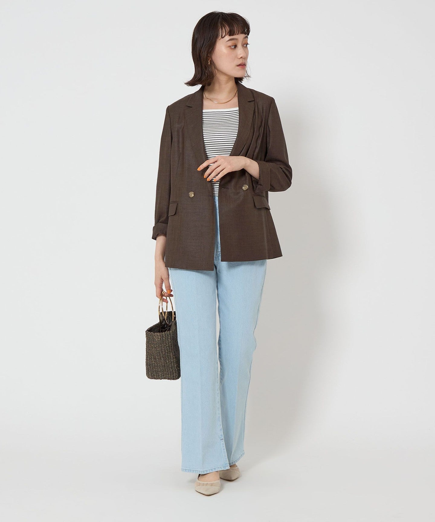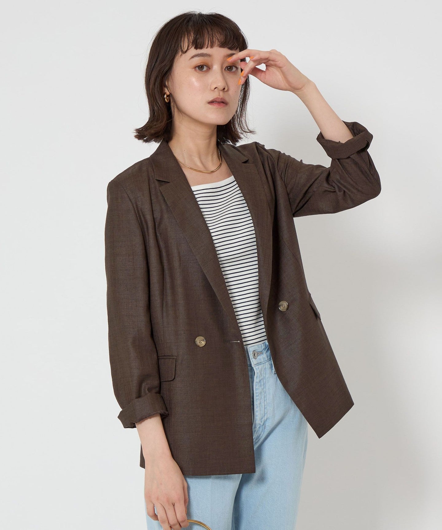 A double-breasted jacket with a natural texture and a refreshing feel