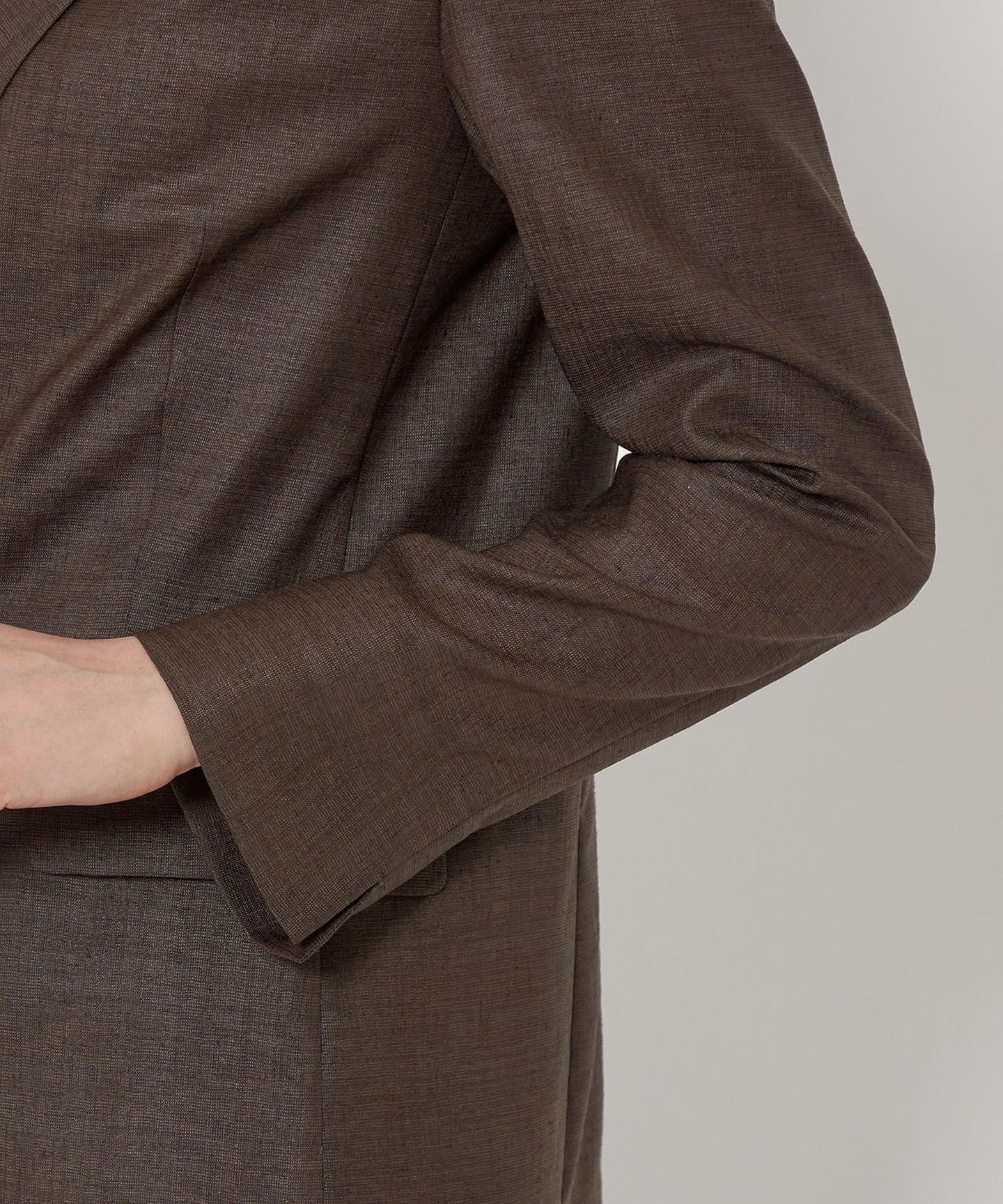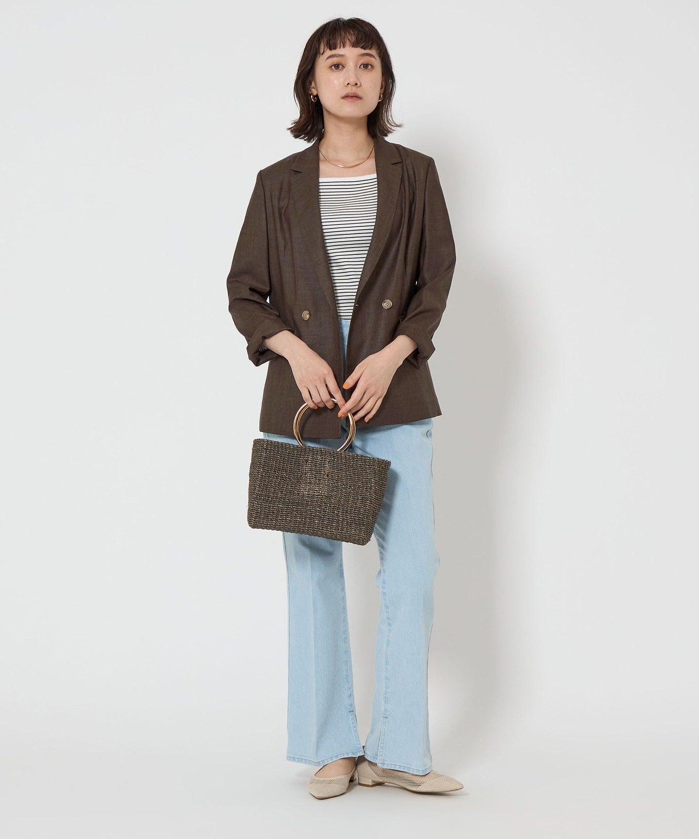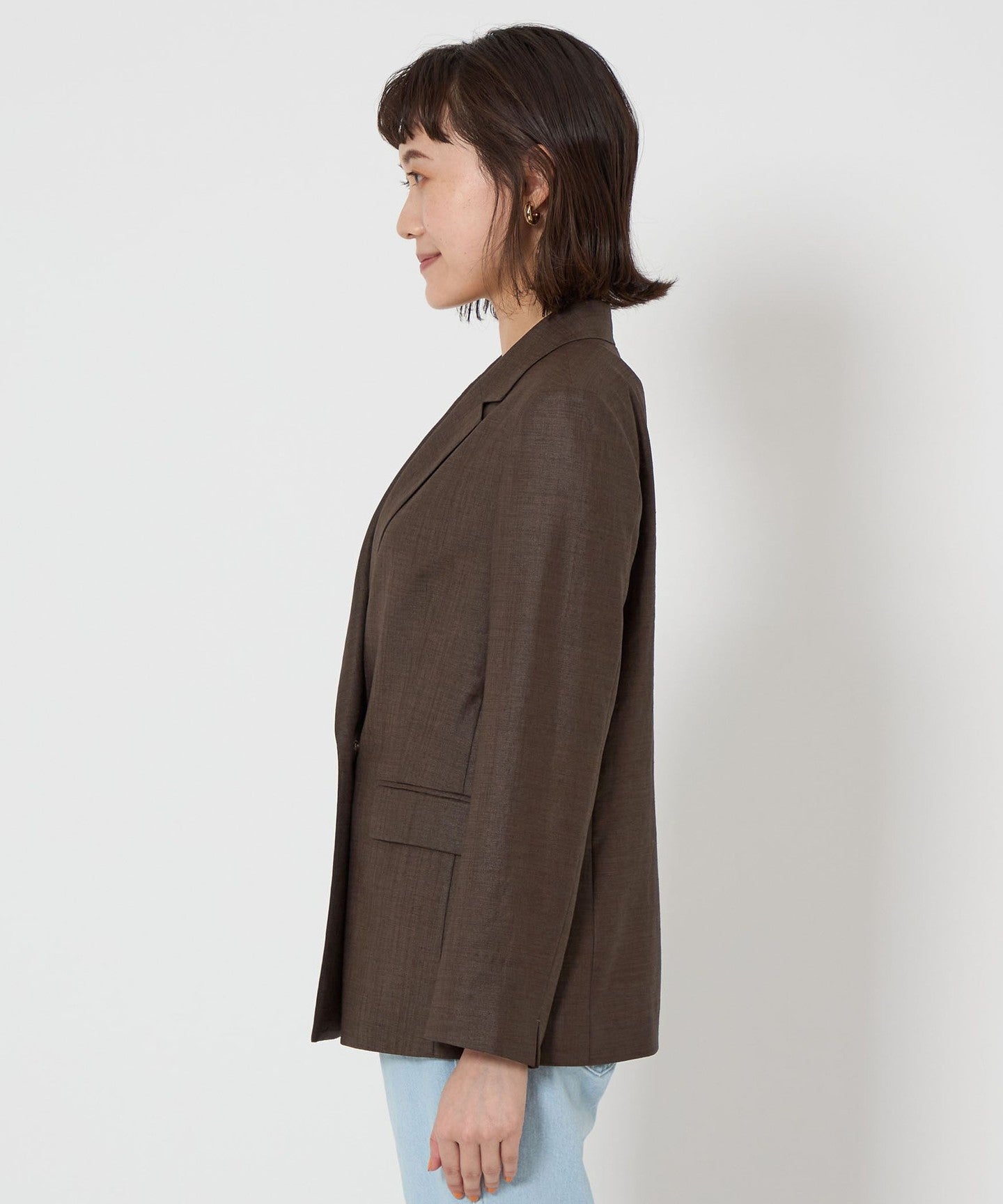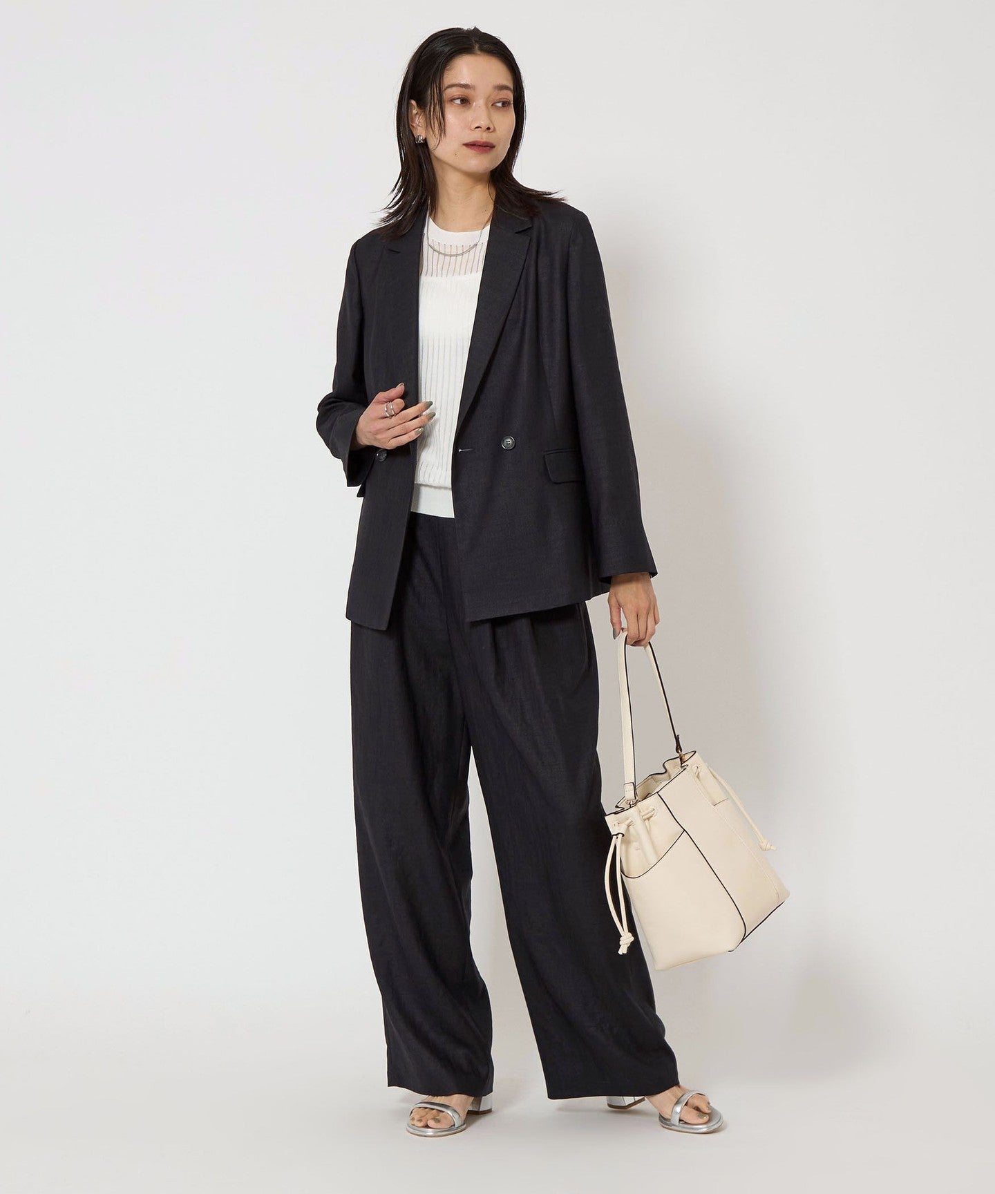 A double-breasted jacket with a natural texture and a refreshing feel