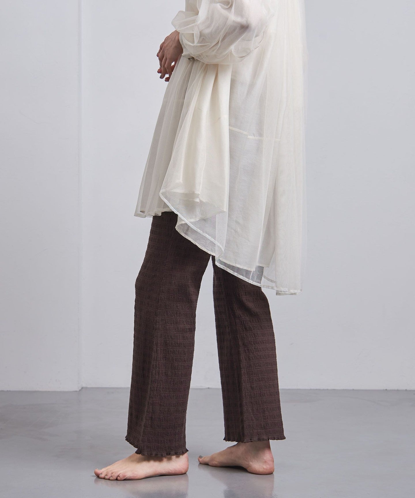 By combining thin cotton with polyurethane and weaving it into fabric, we have achieved the stretch and softness of knit despite it being a woven fabric.