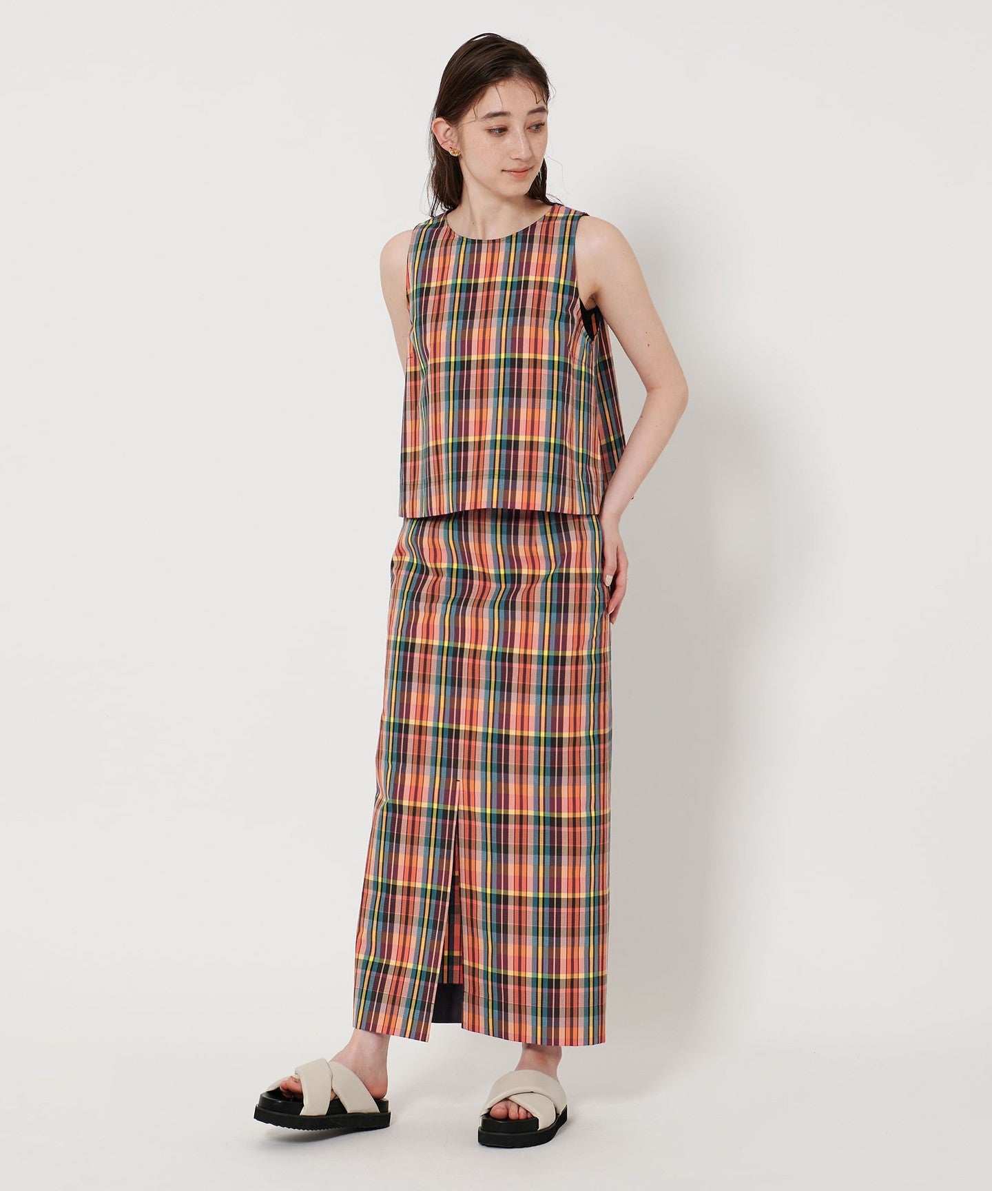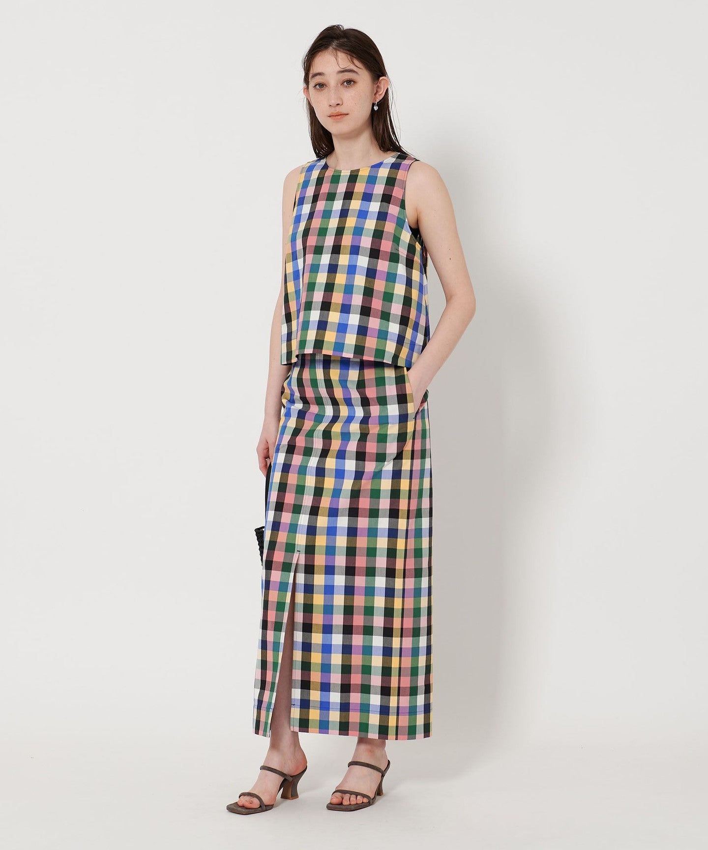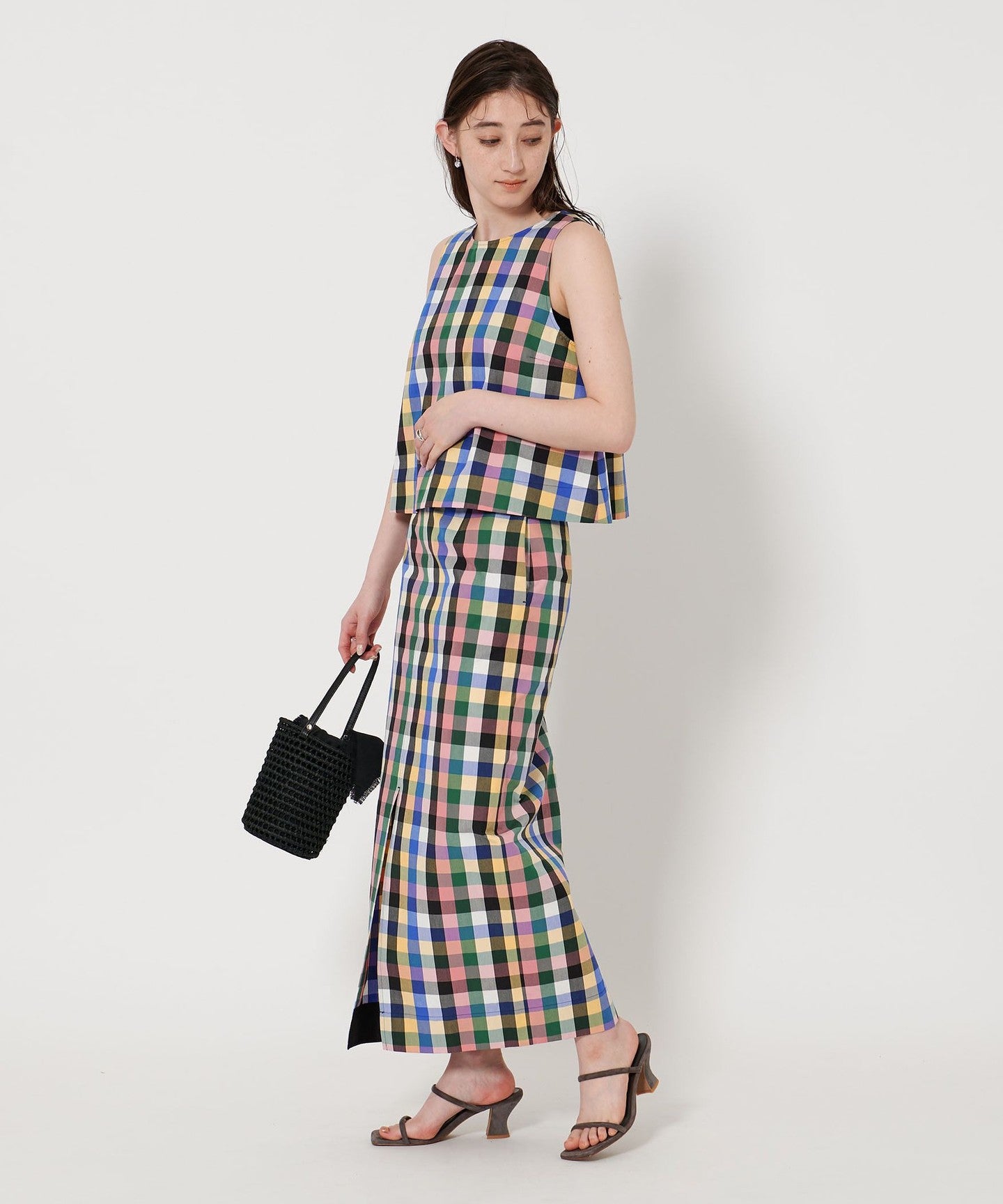 This piece features a clean I-line skirt with a modern, updated check pattern.