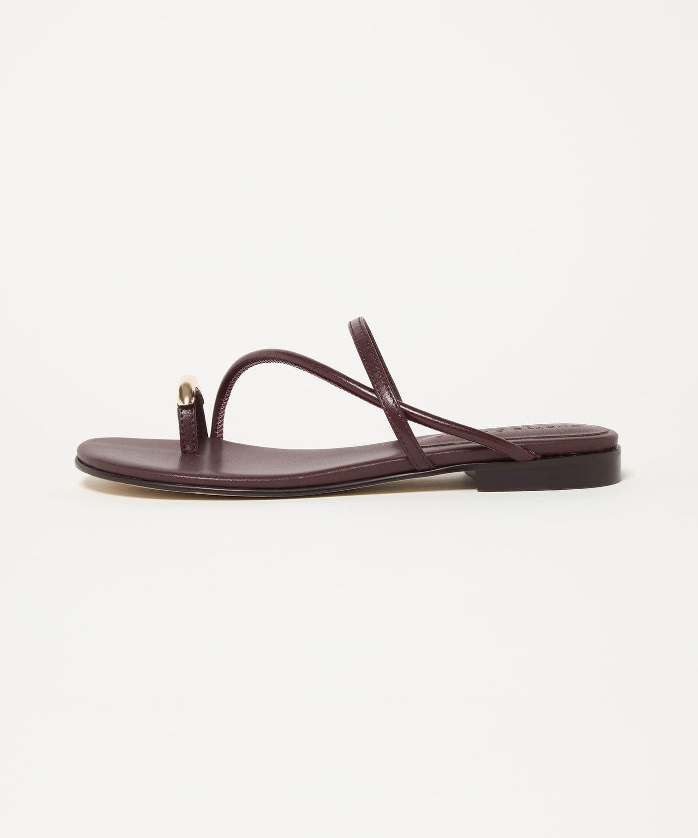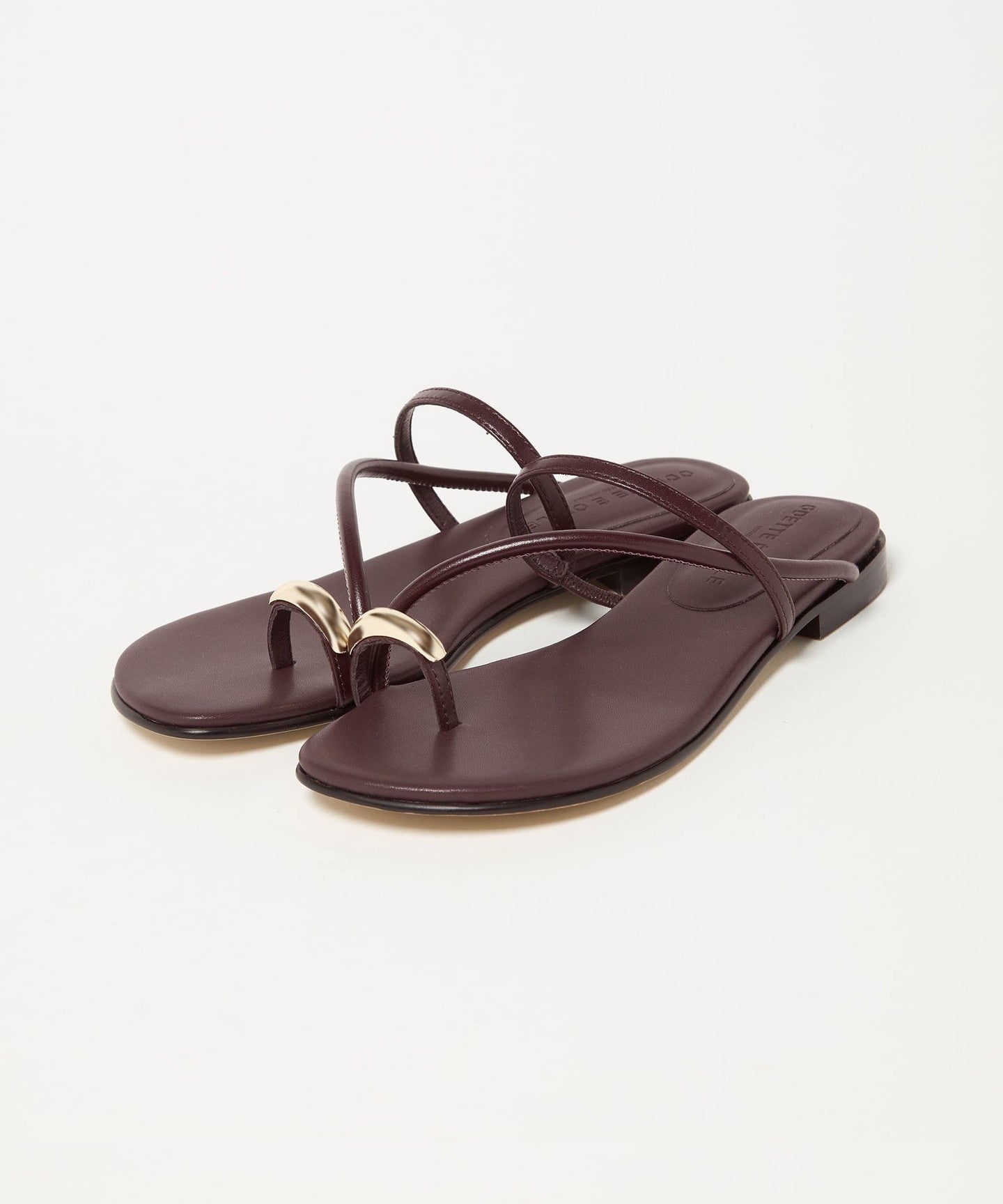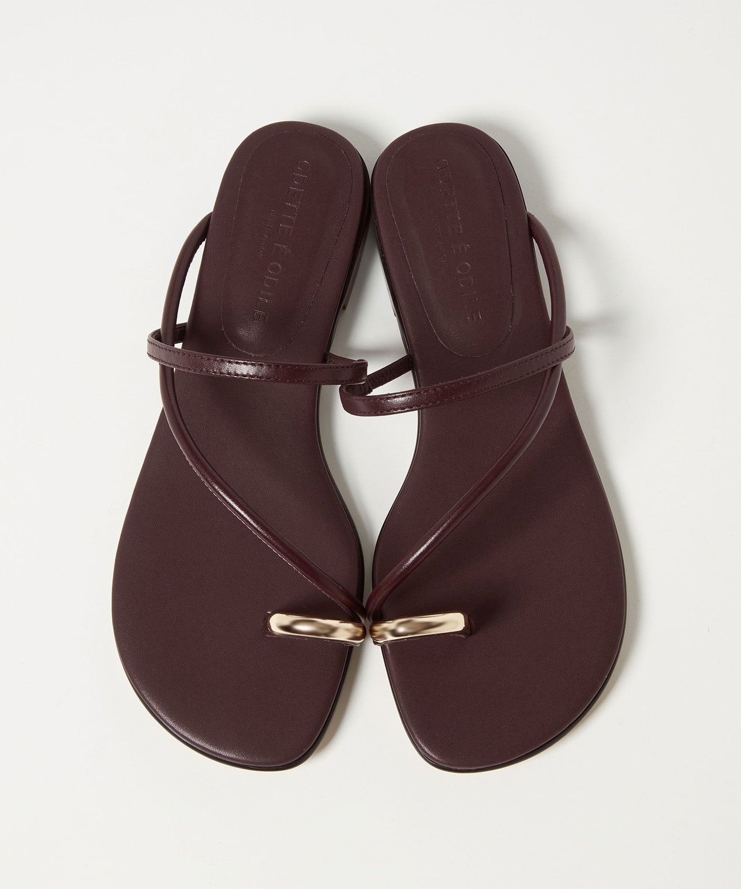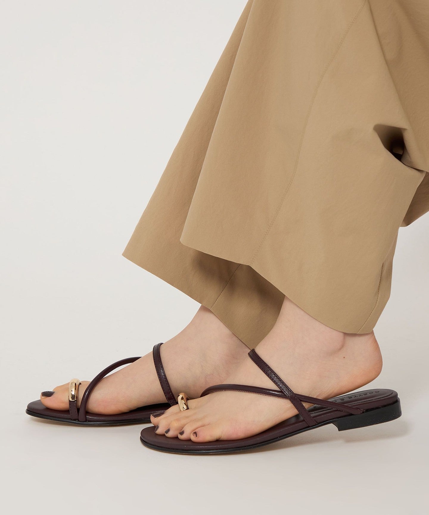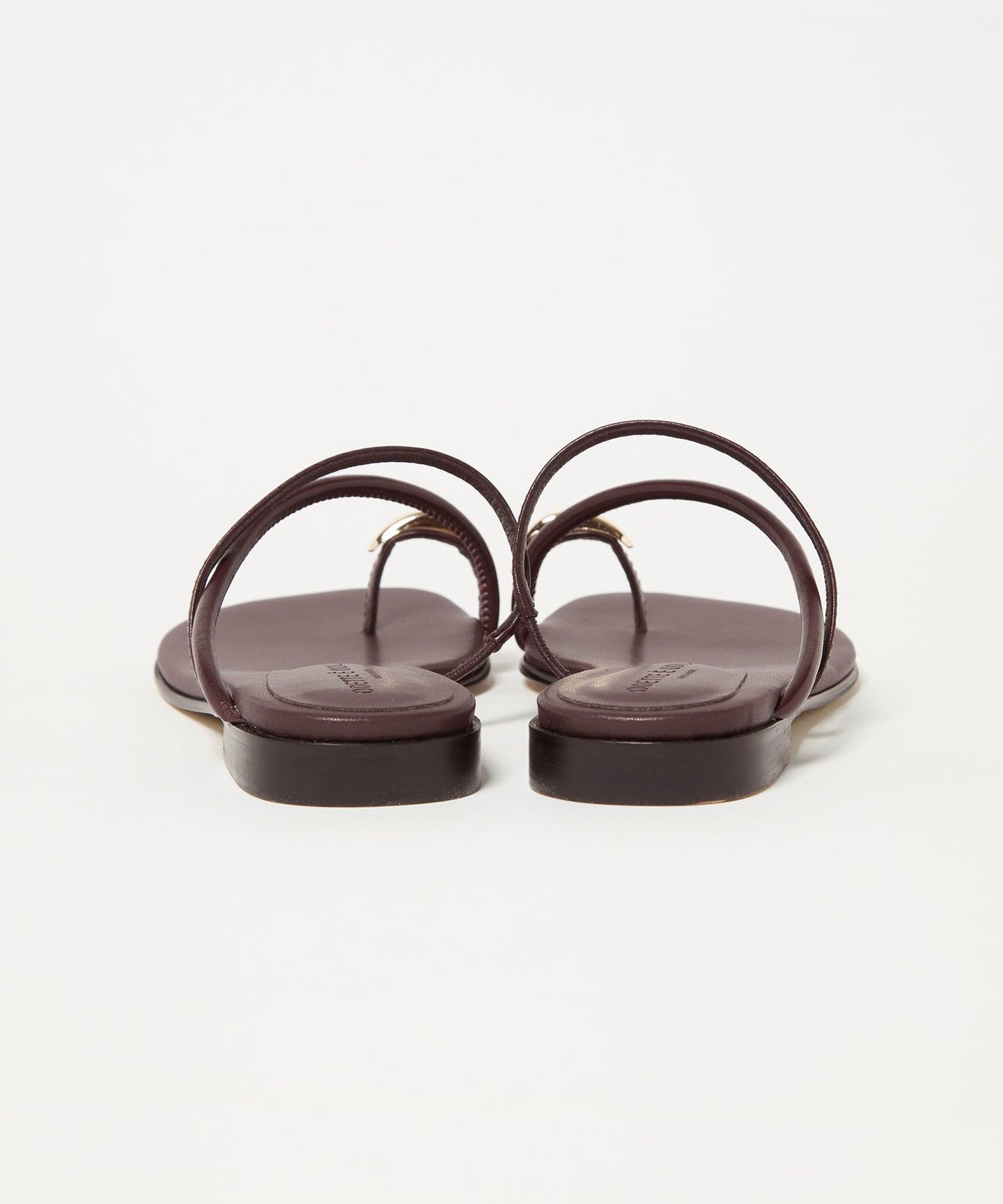 These sandals feature a metal decoration on the leather loop on the big toe.
