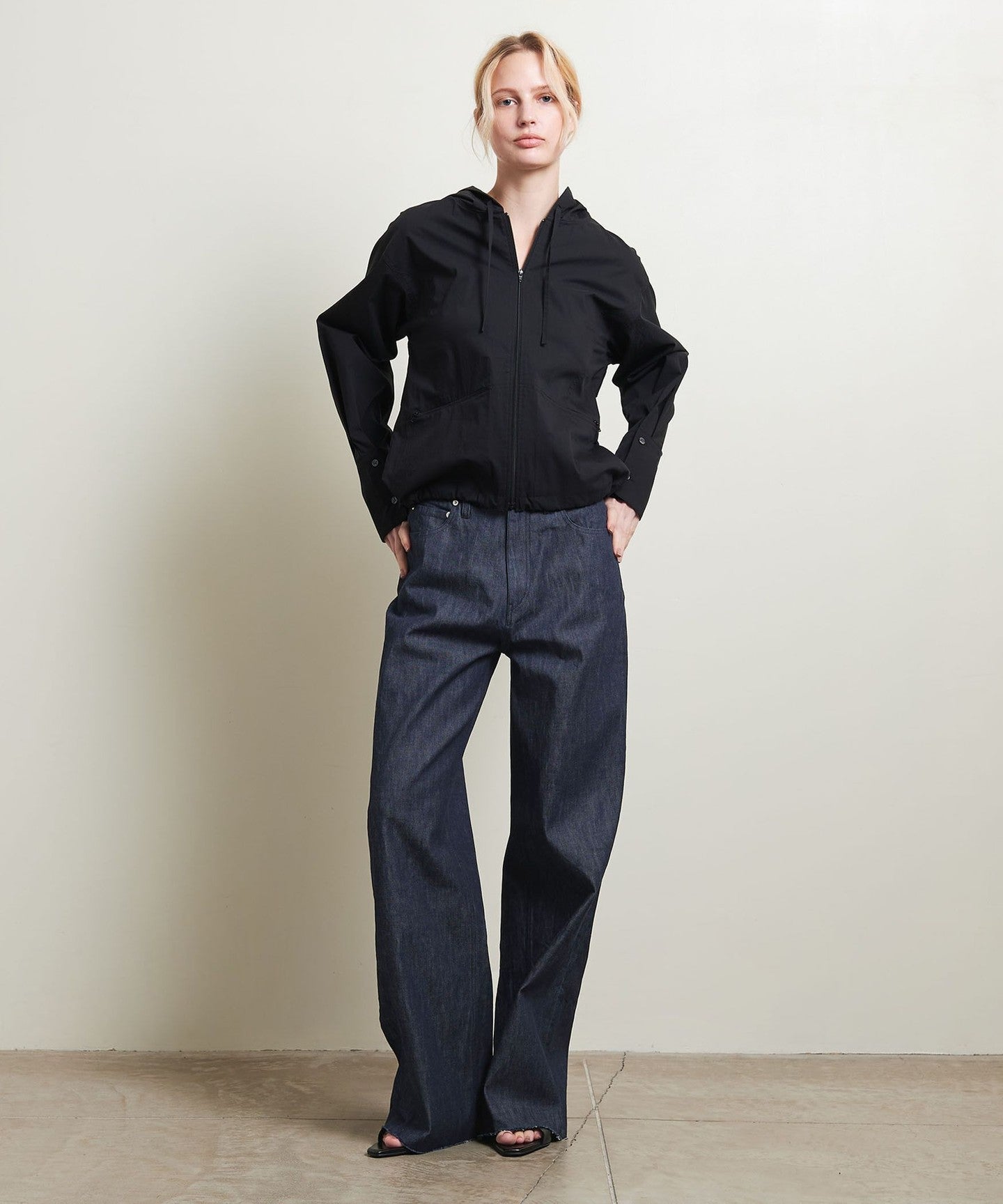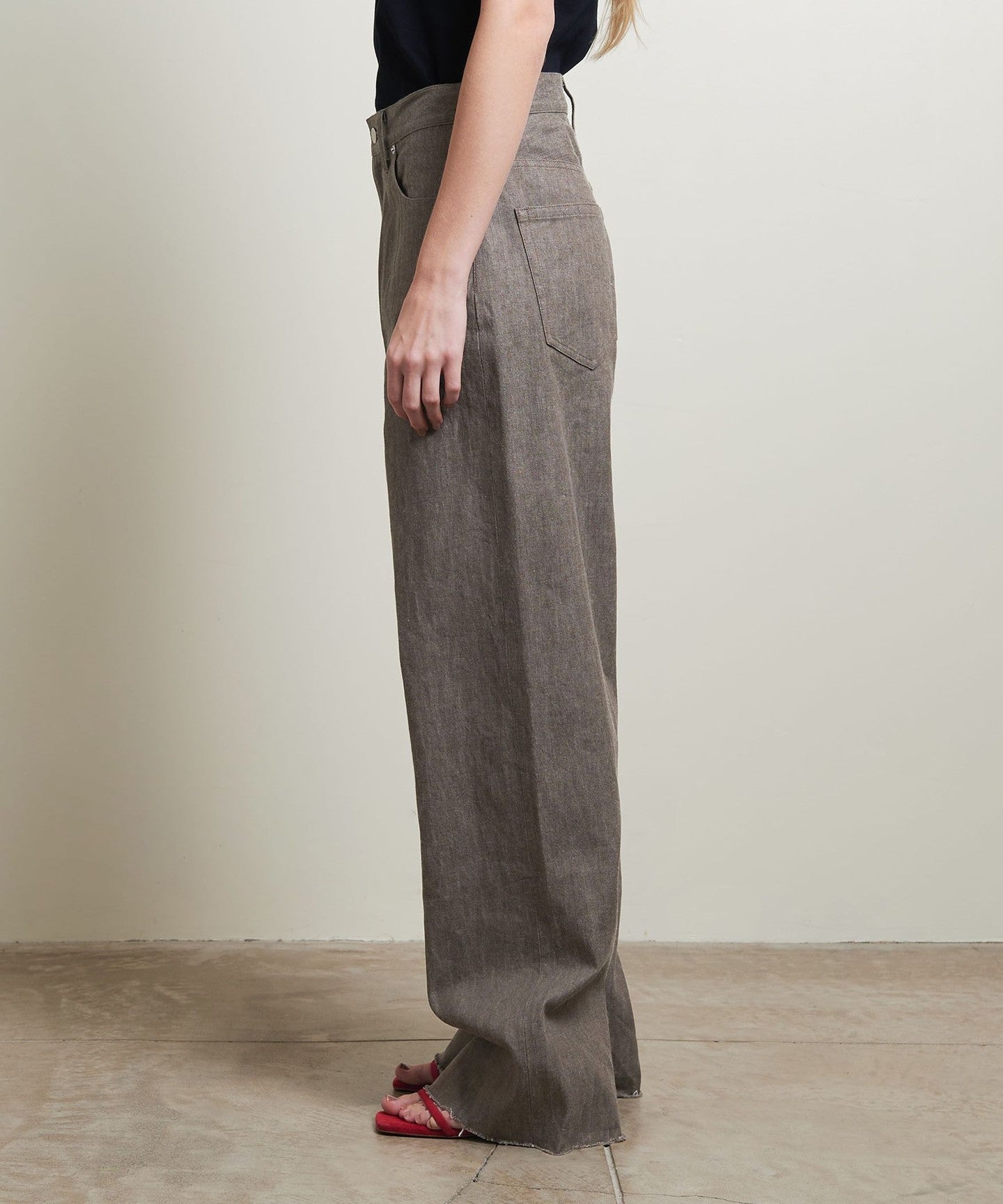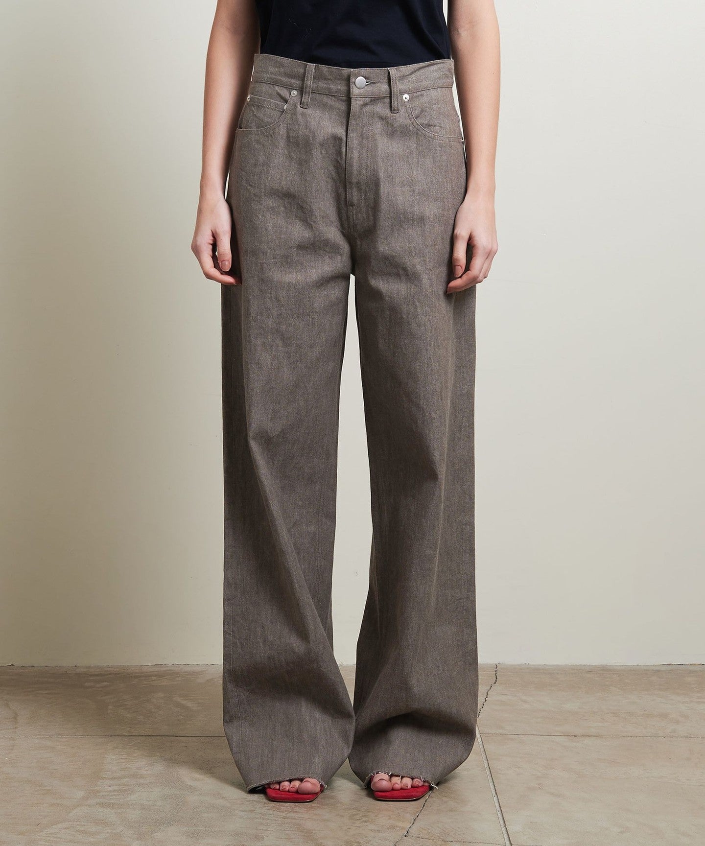 These straight-cut denim pants have a wide silhouette that makes the most of the firmness of the fabric, giving them a sophisticated look.