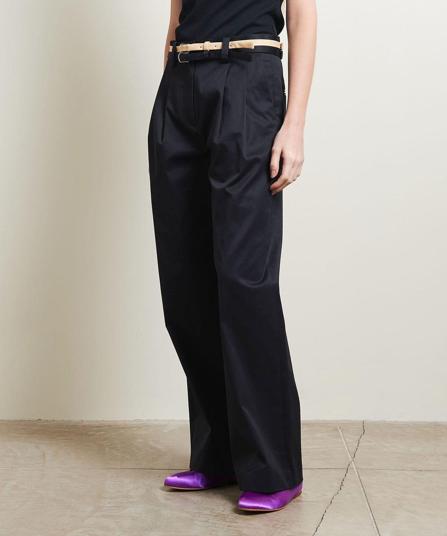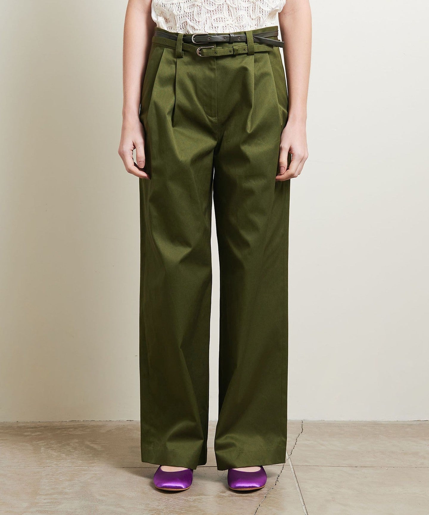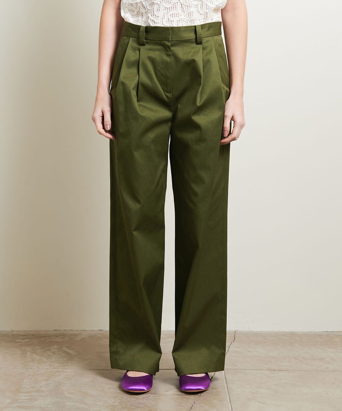 The pants have tucks to create a wide silhouette with room all the way to the hem.