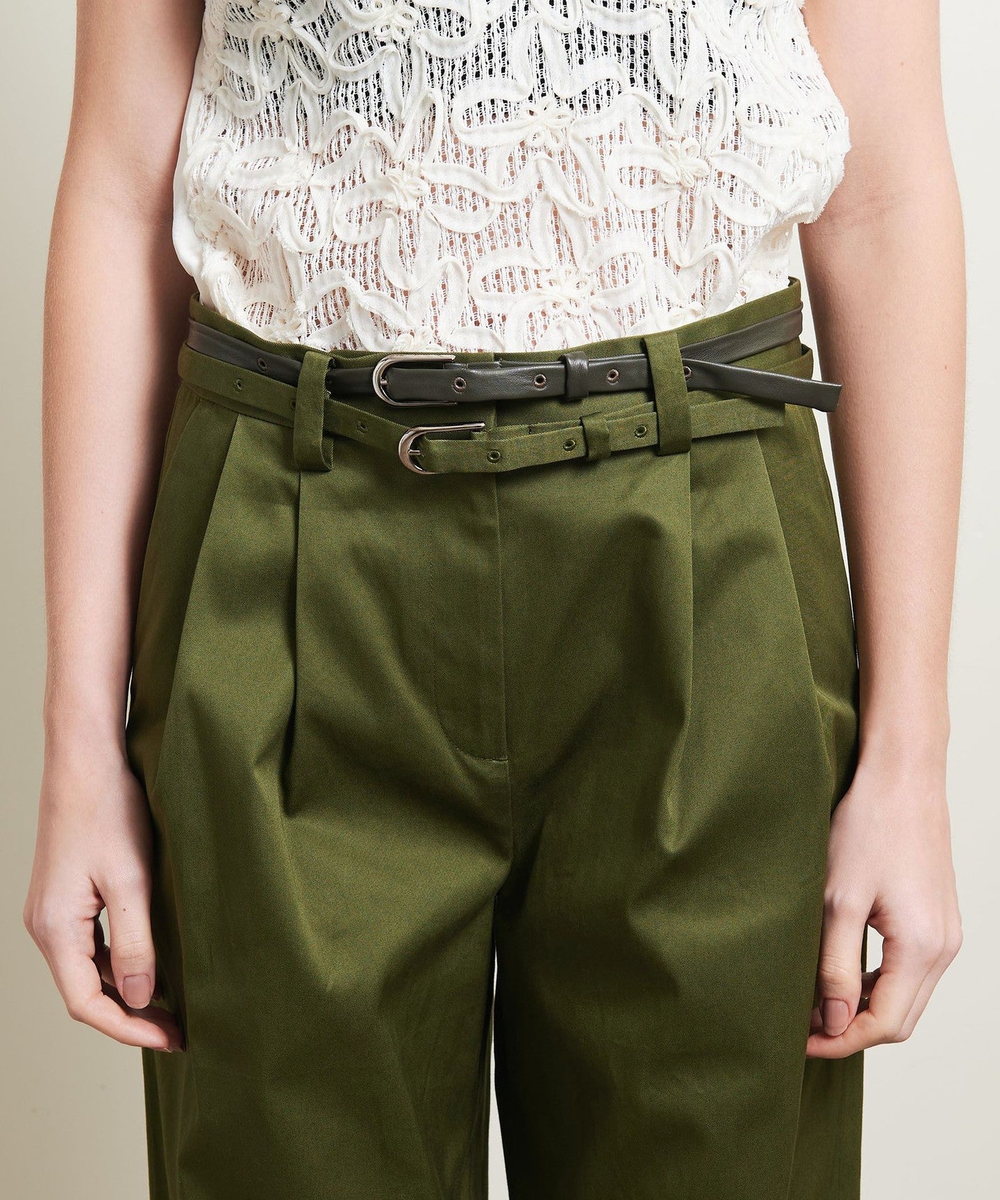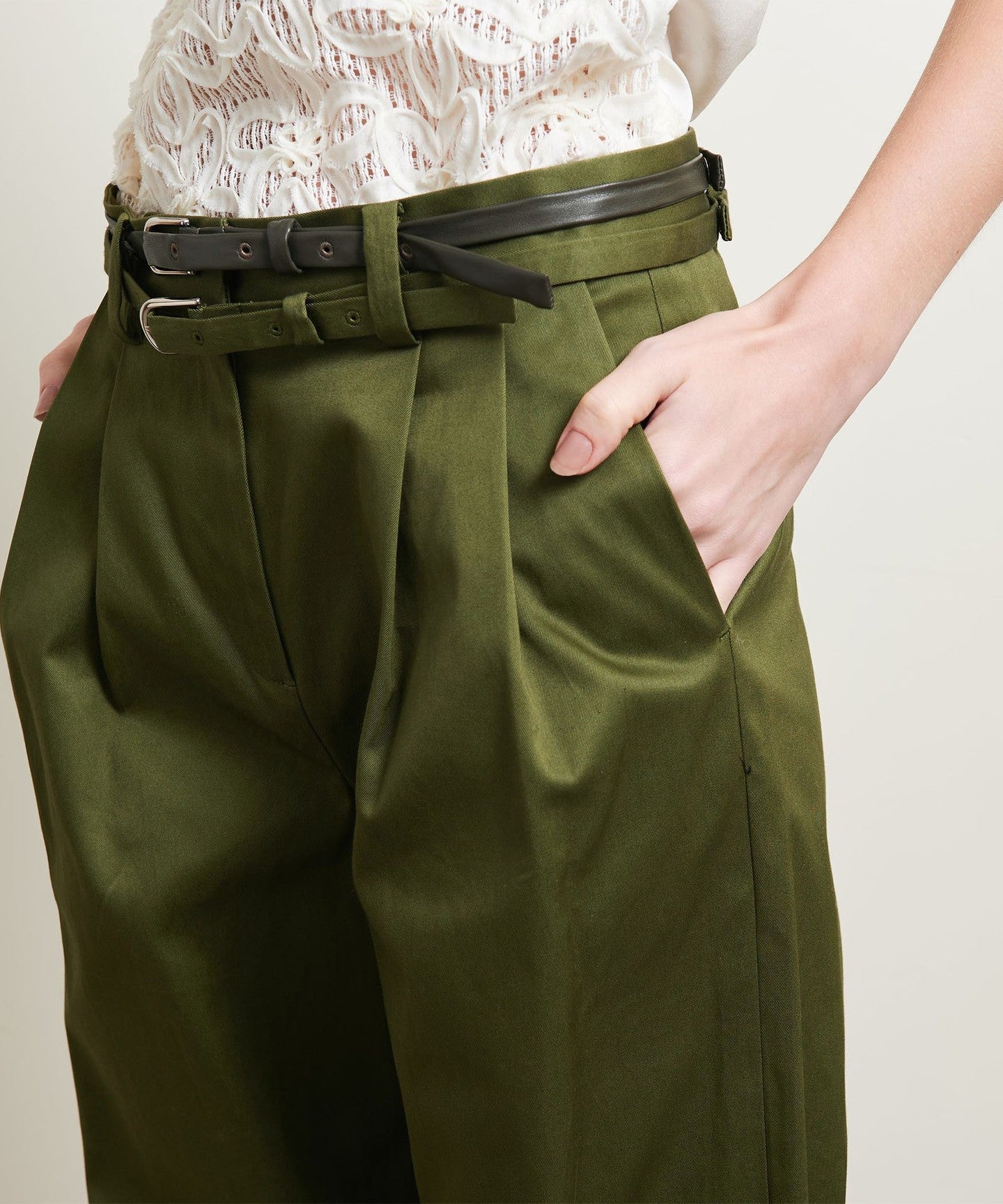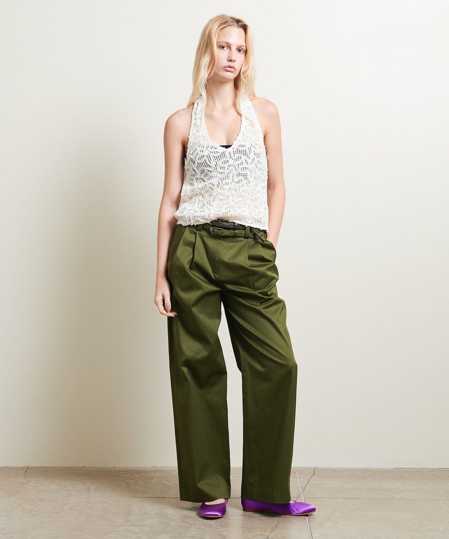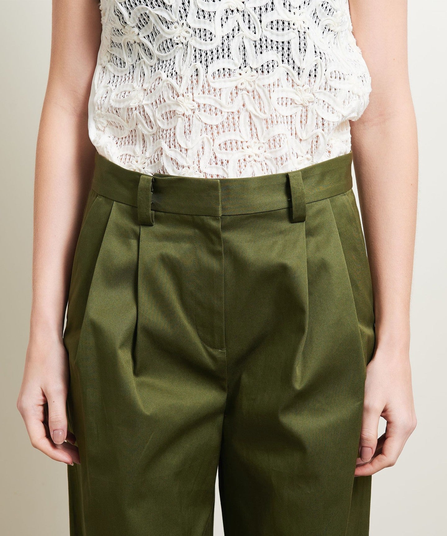 The pants have tucks to create a wide silhouette with room all the way to the hem.