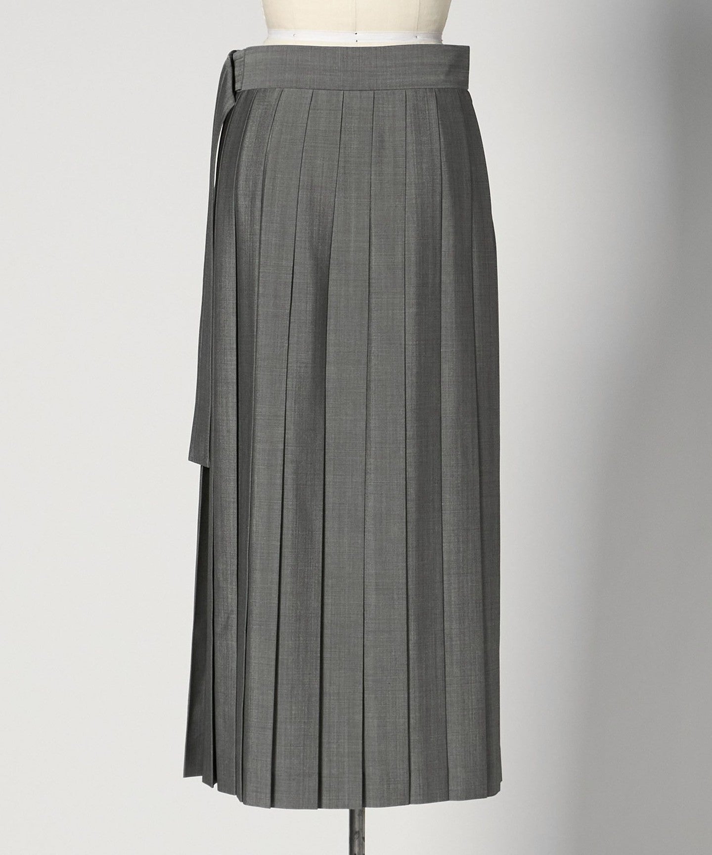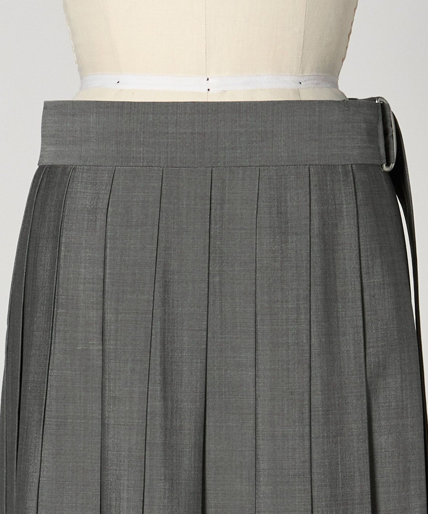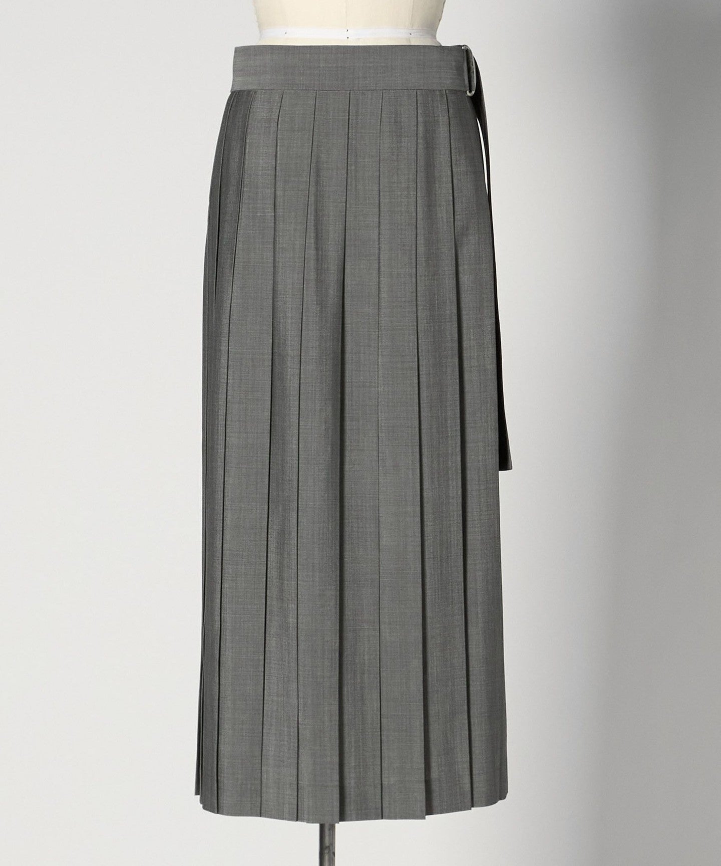 A long pleated skirt made from solid color wool mohair fabric that gives a gentle impression.