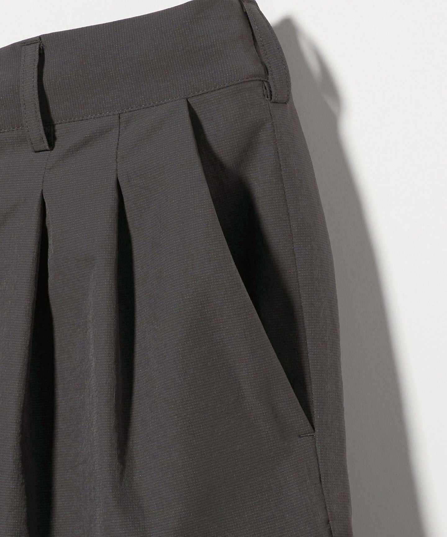 It has a slightly thick silhouette with two tucks and an elastic gathered waist at the back.