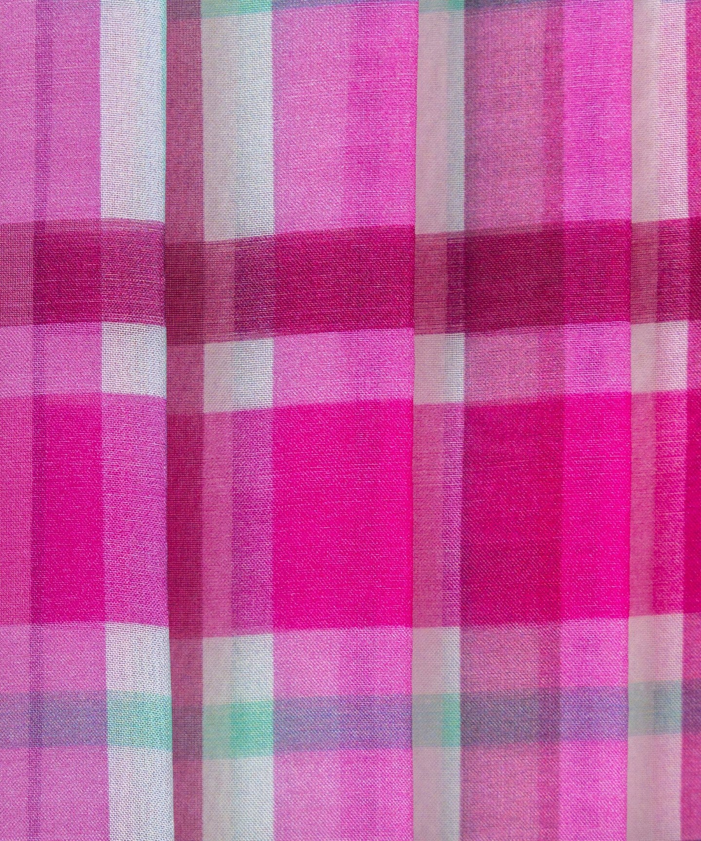 The fabric is made of sheer and firm silk organza with an original check pattern printed on it.