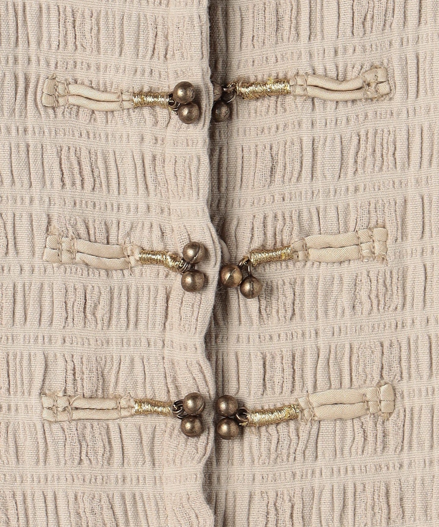 The front has snap buttons and is decorated with traditional Indian gold thread and charms called Zari.