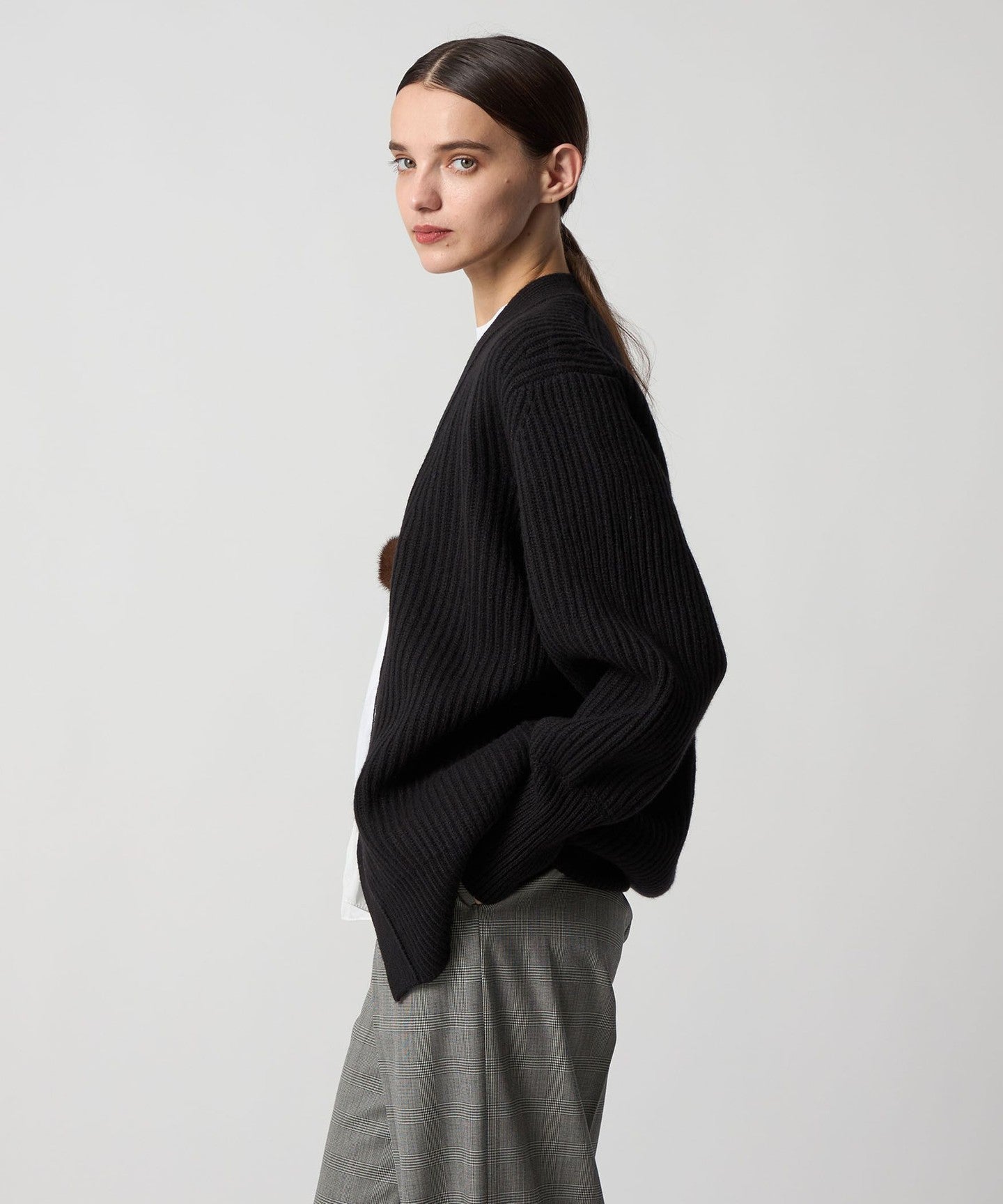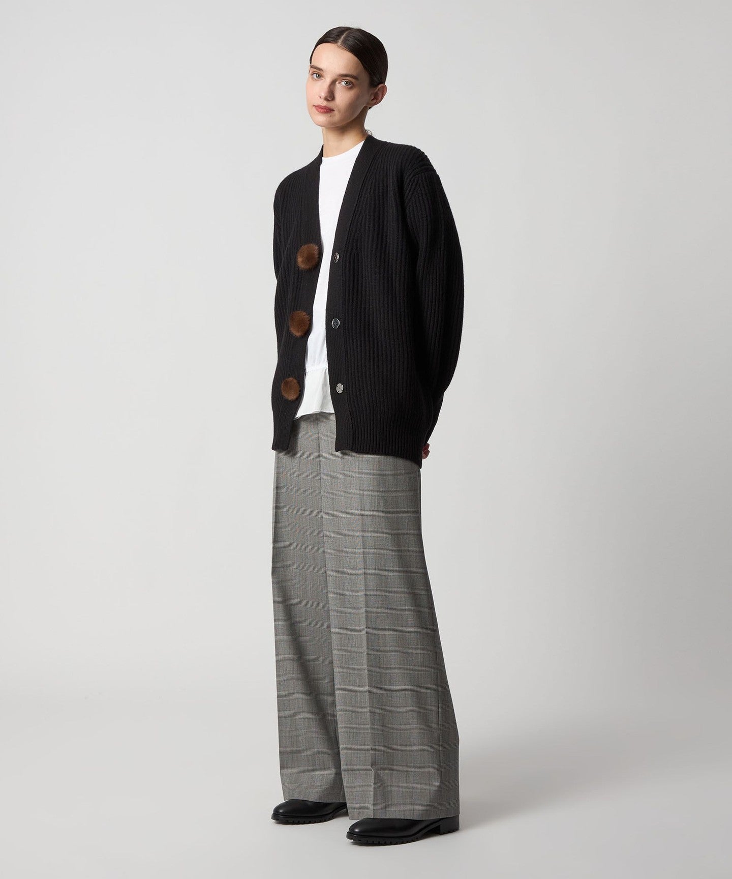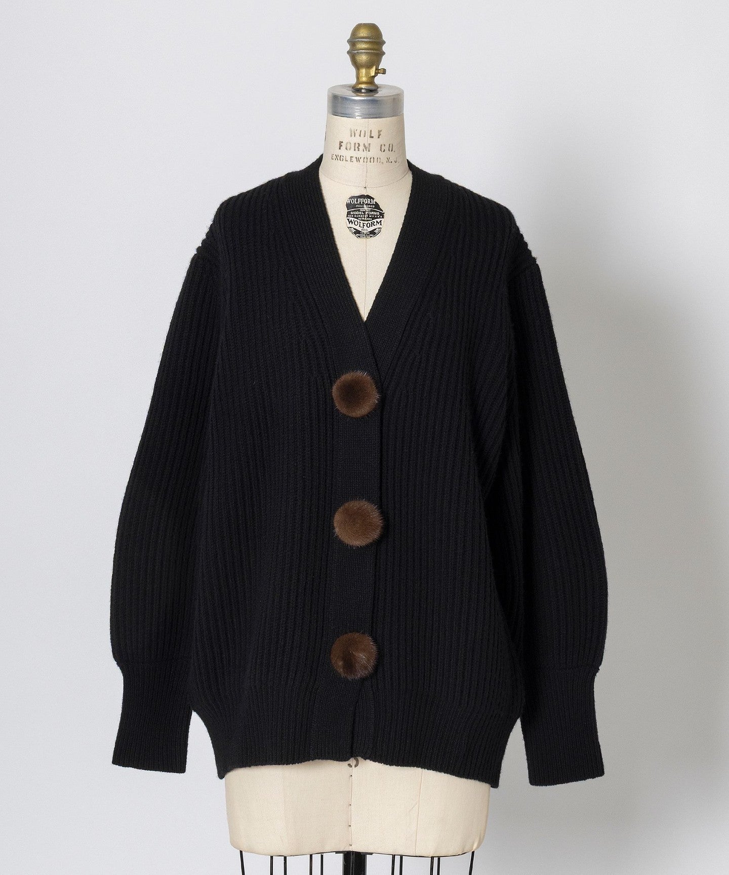 A low-gauge cardigan accented with round mink balls