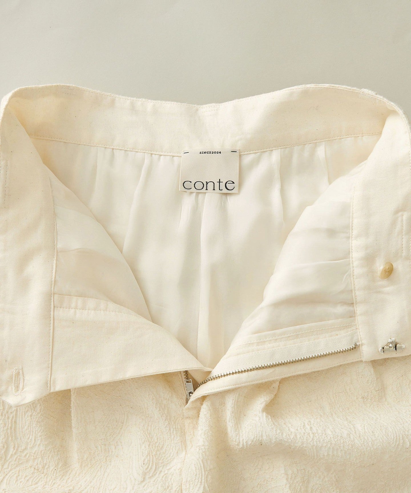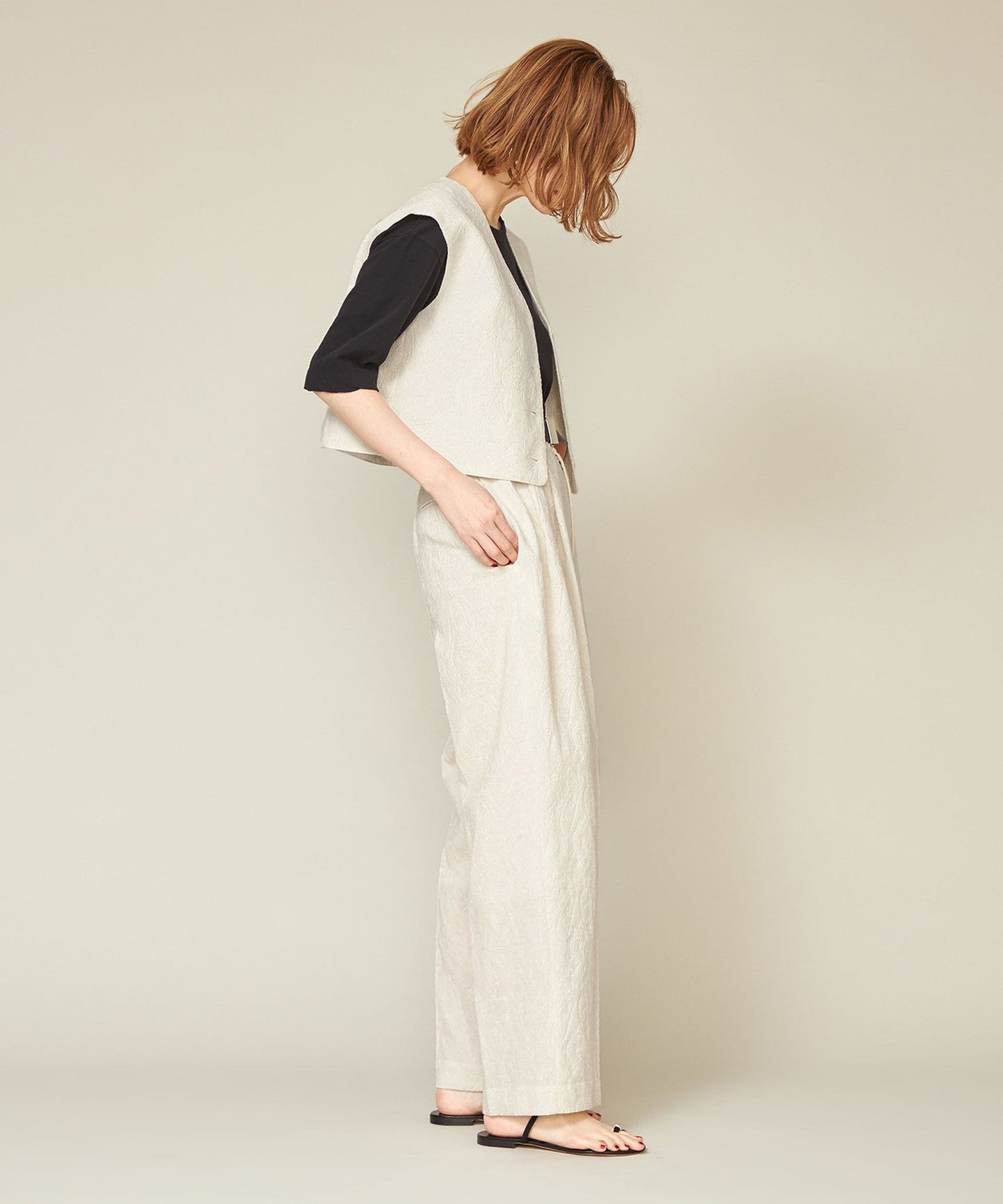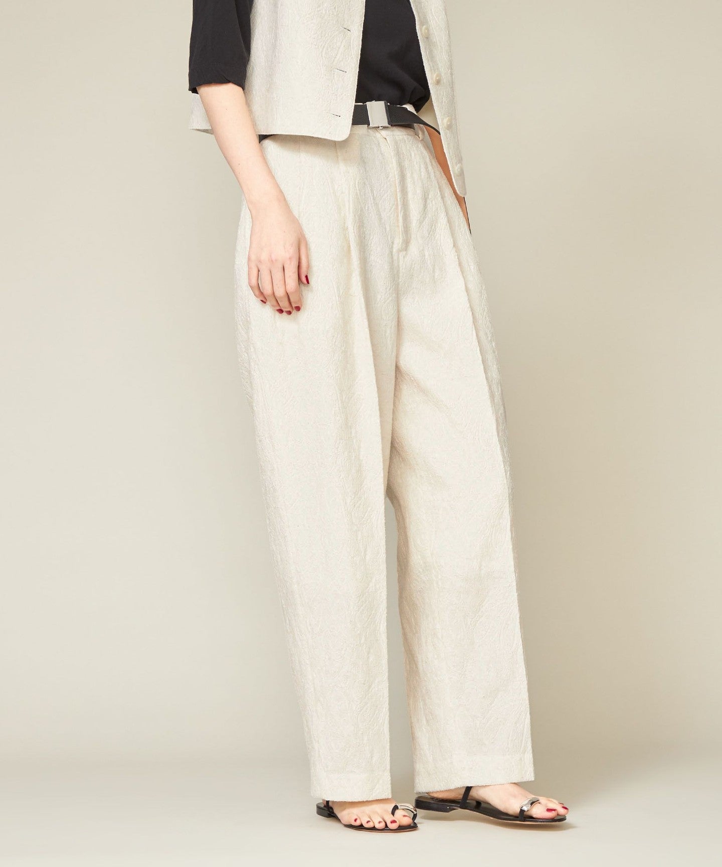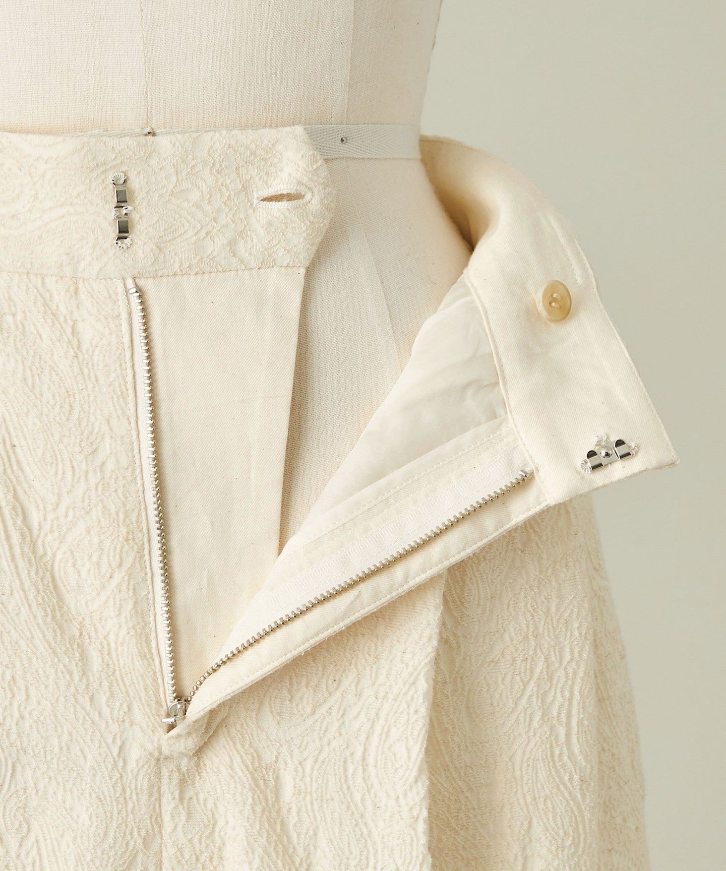These pleated pants feature delicate paisley jacquard that will catch your eye.
