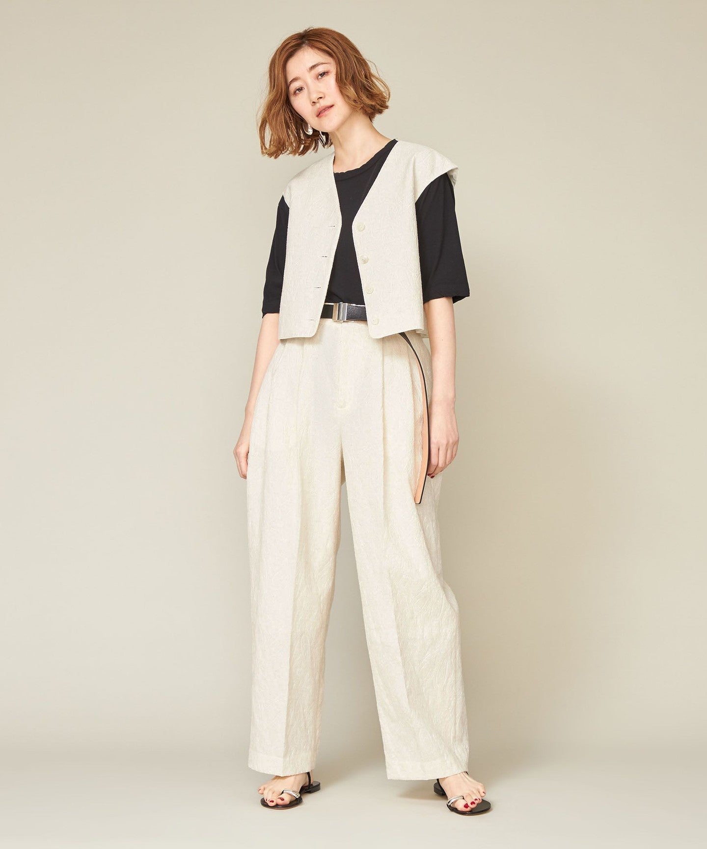 These two-pleat pants have a masculine silhouette with jacquard weave and thick belt loops that give them a striking look.