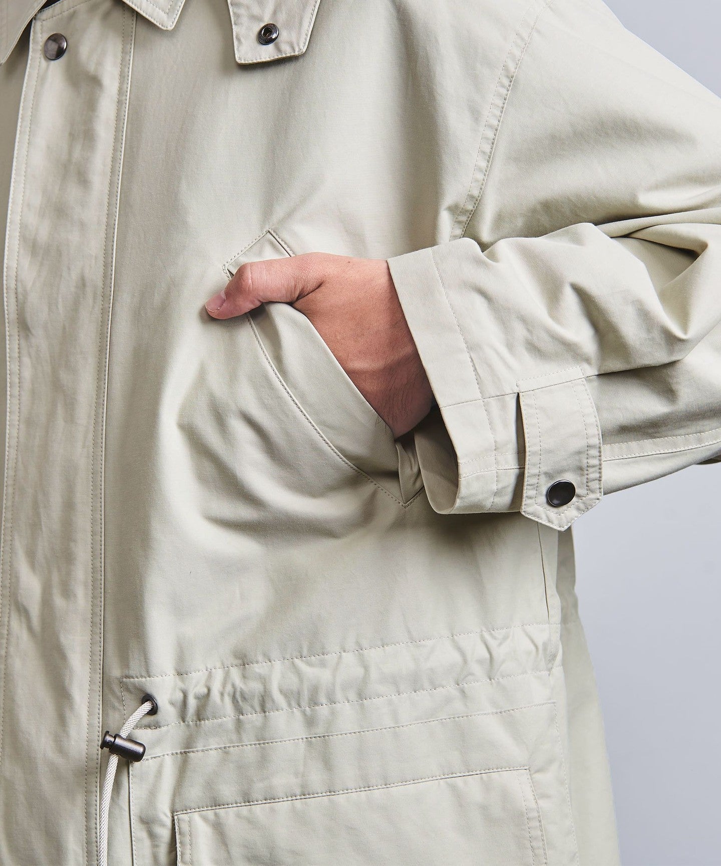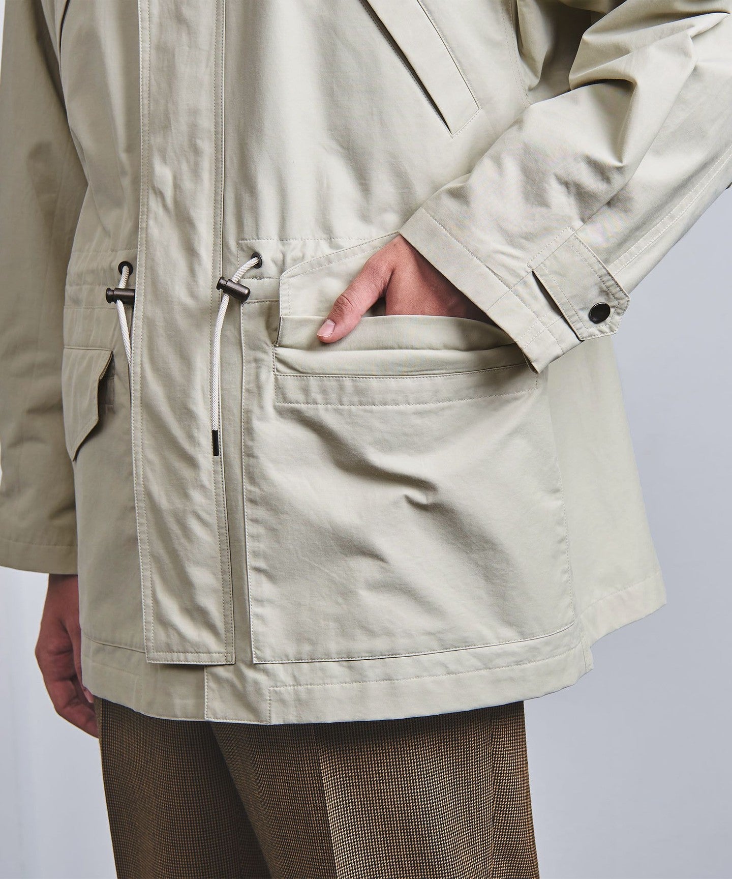 It features classic European details such as a drawstring waist, multiple pockets, and a large hood.