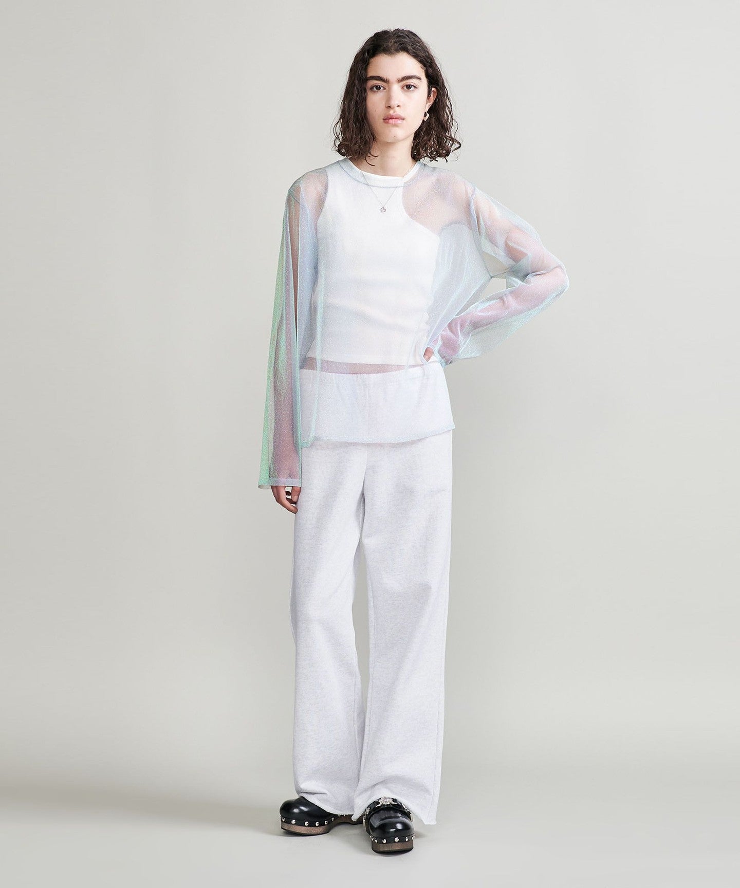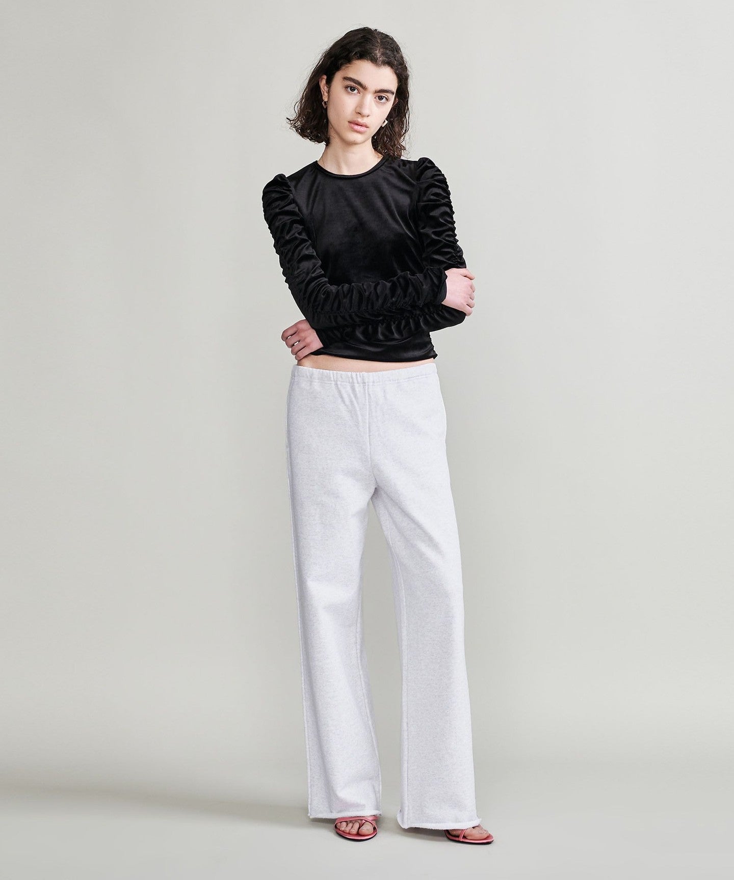 These sweatpants feature a vintage-inspired, dry-touch fleece lining. The wide silhouette is compact around the waist and slightly wider from the thighs down, creating a comfortable volume without being too slouchy. The adjustable waistband features an internal drawstring, and the slightly different hemlines in the front and back create a subtle yet striking casual style. We recommend pairing them with the pullover from the same series (item no. 16126995338) to create a stylish look.