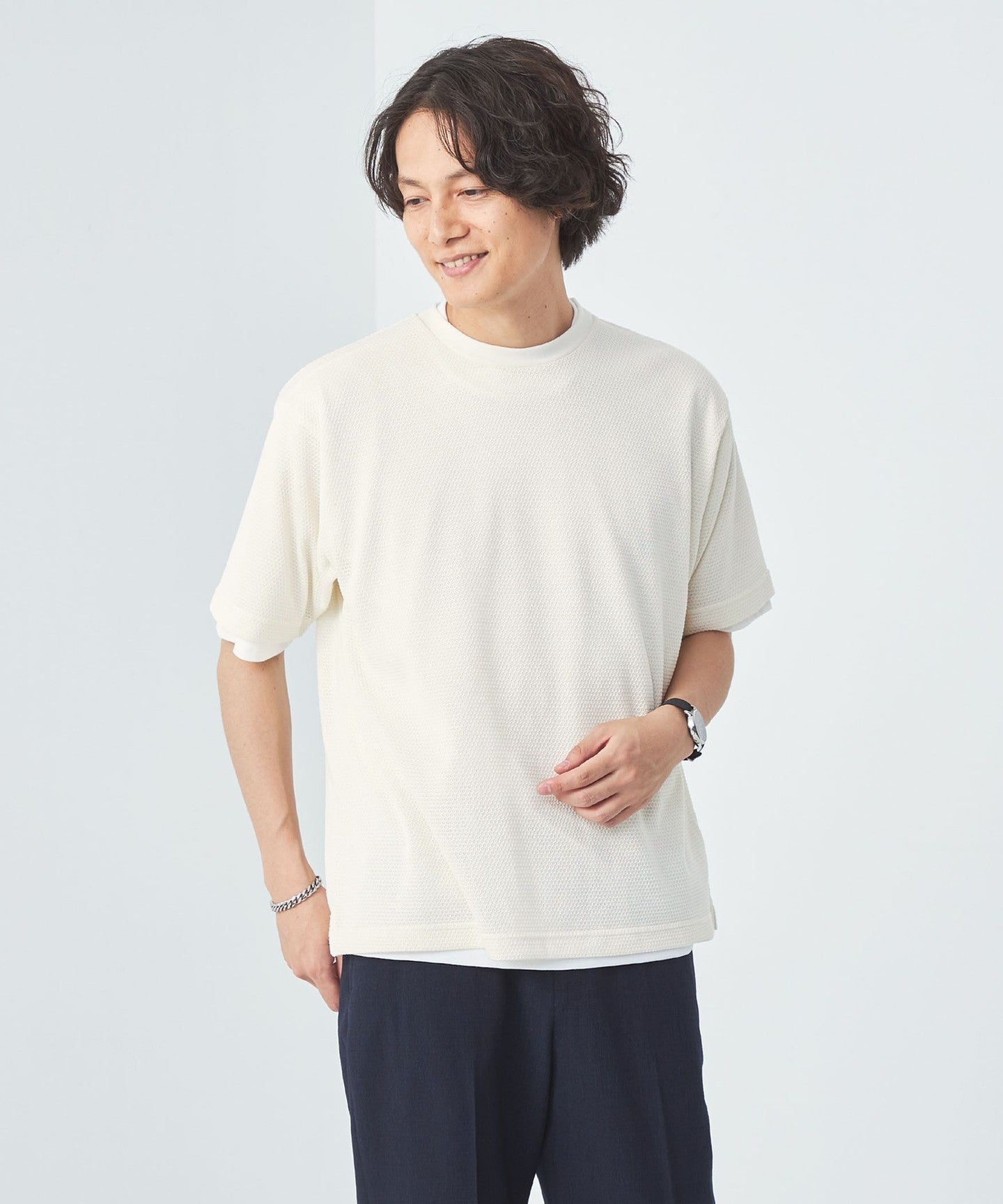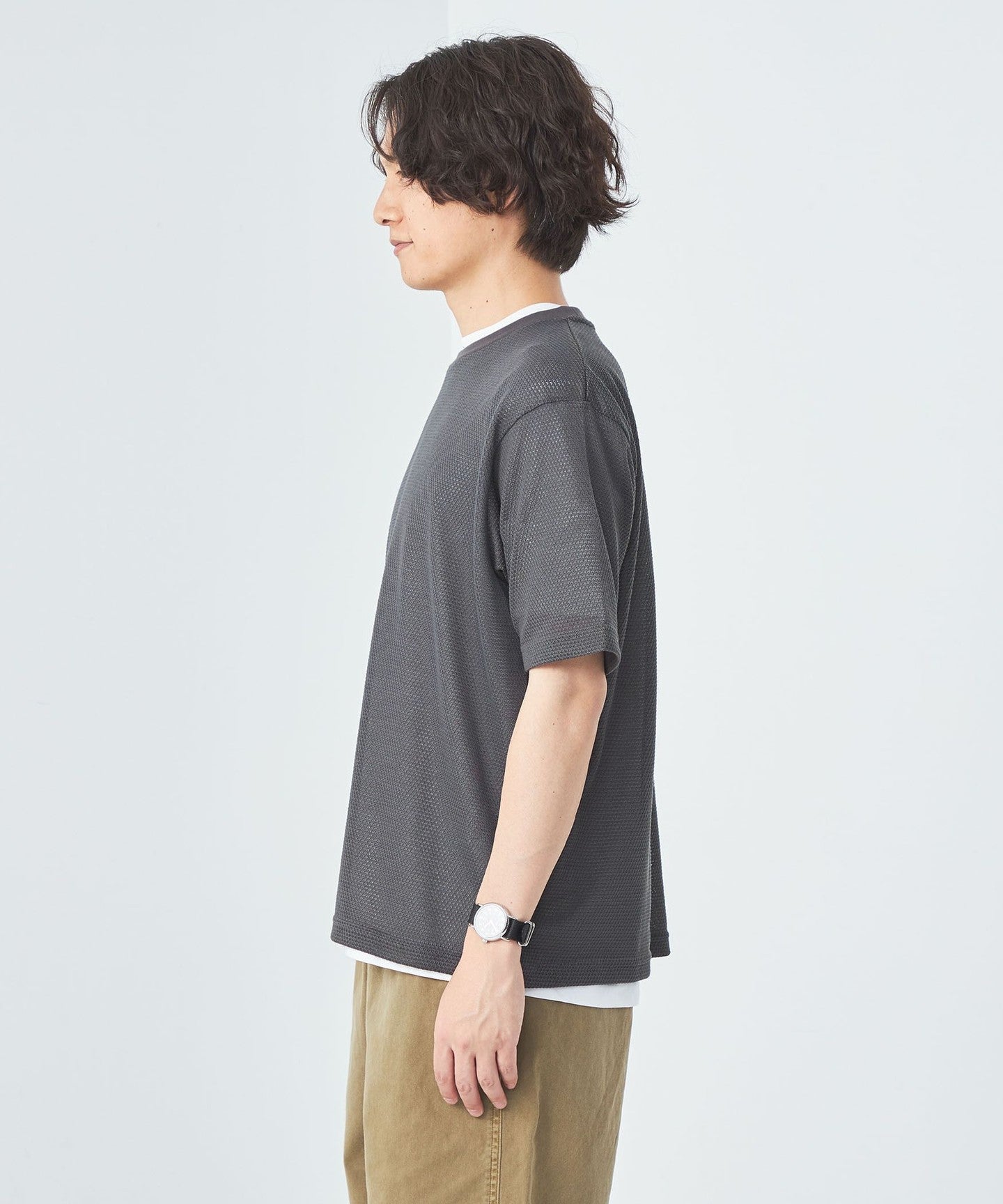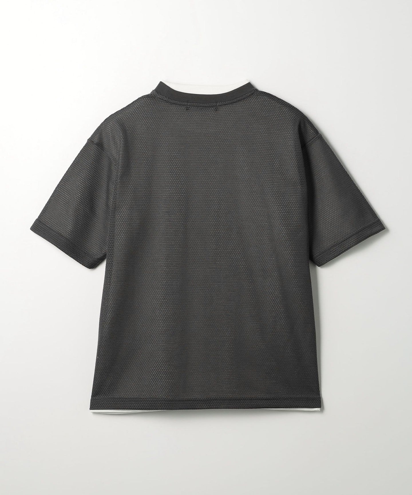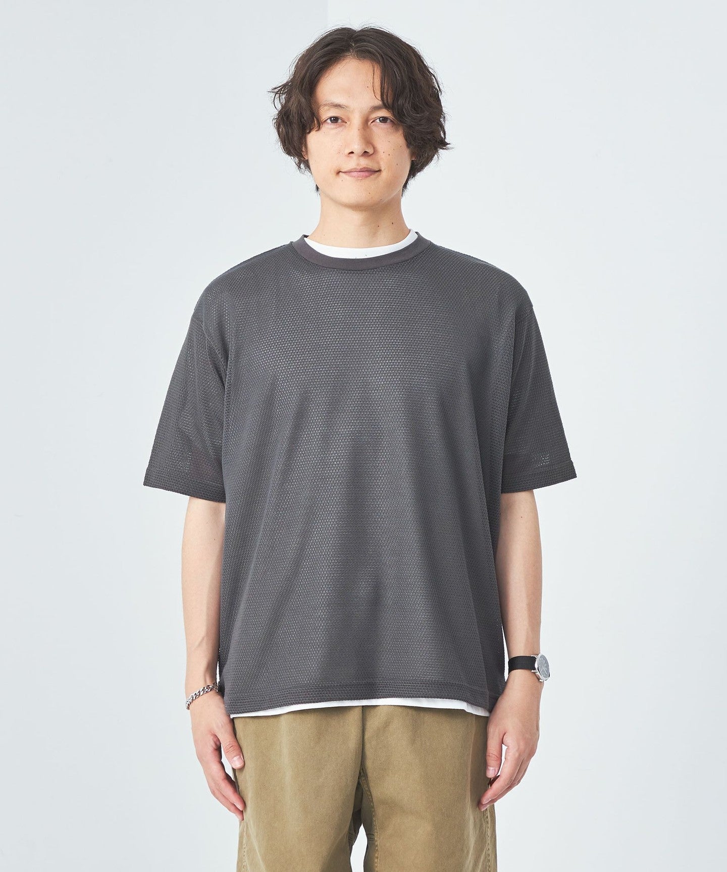 The balance between the loose silhouette mesh T-shirt and regular size jersey T-shirt is excellent.