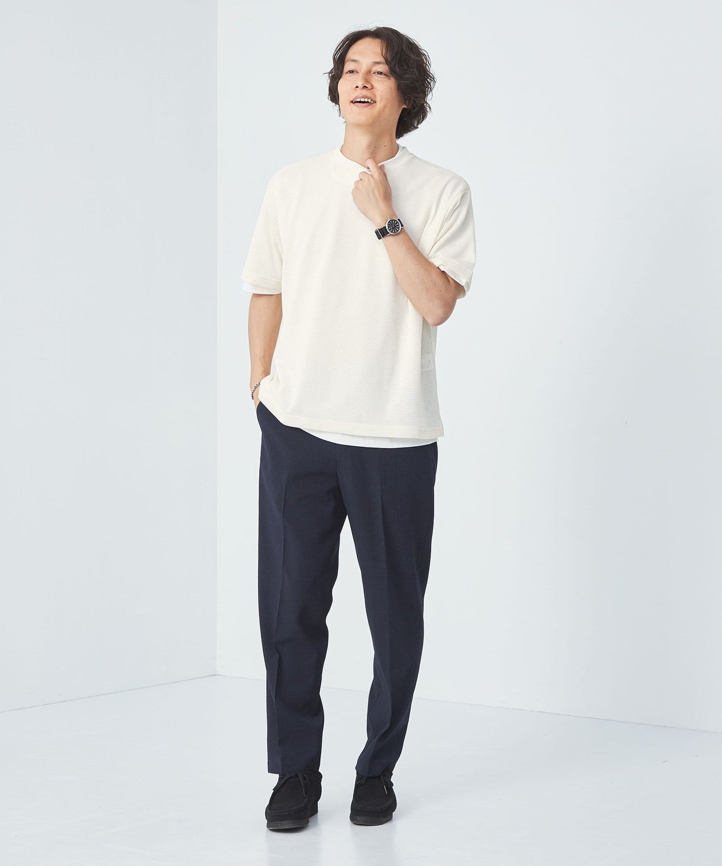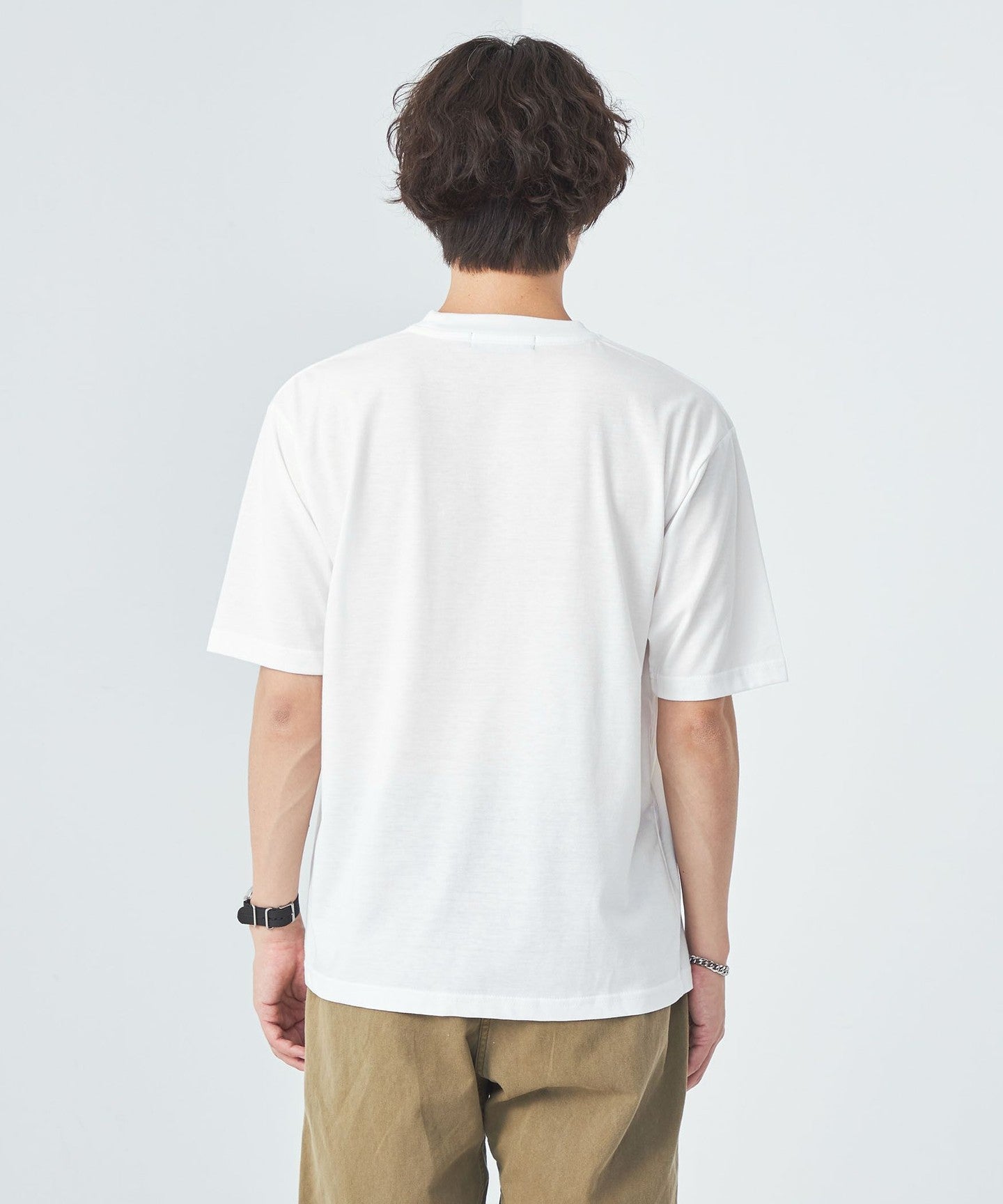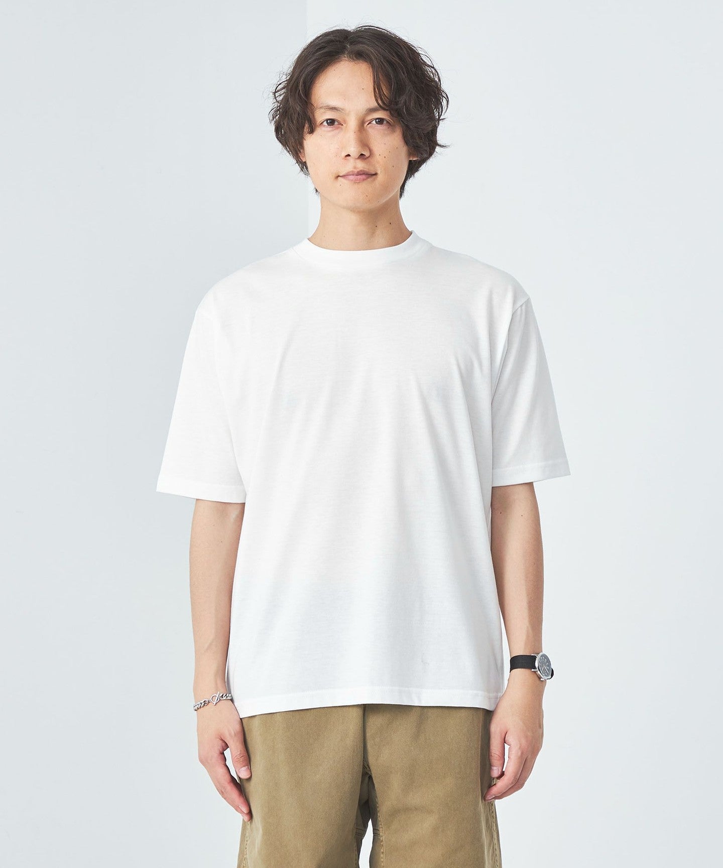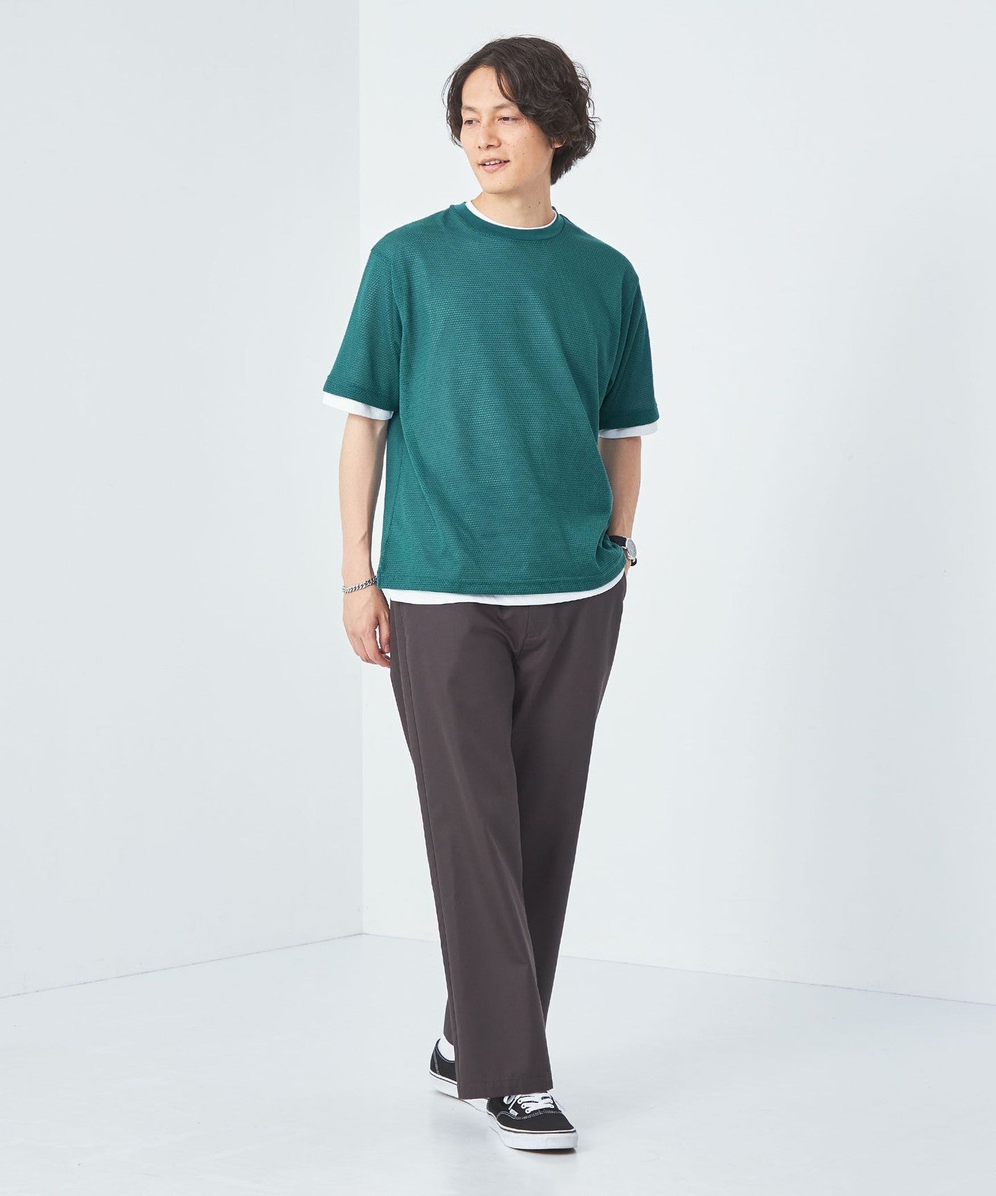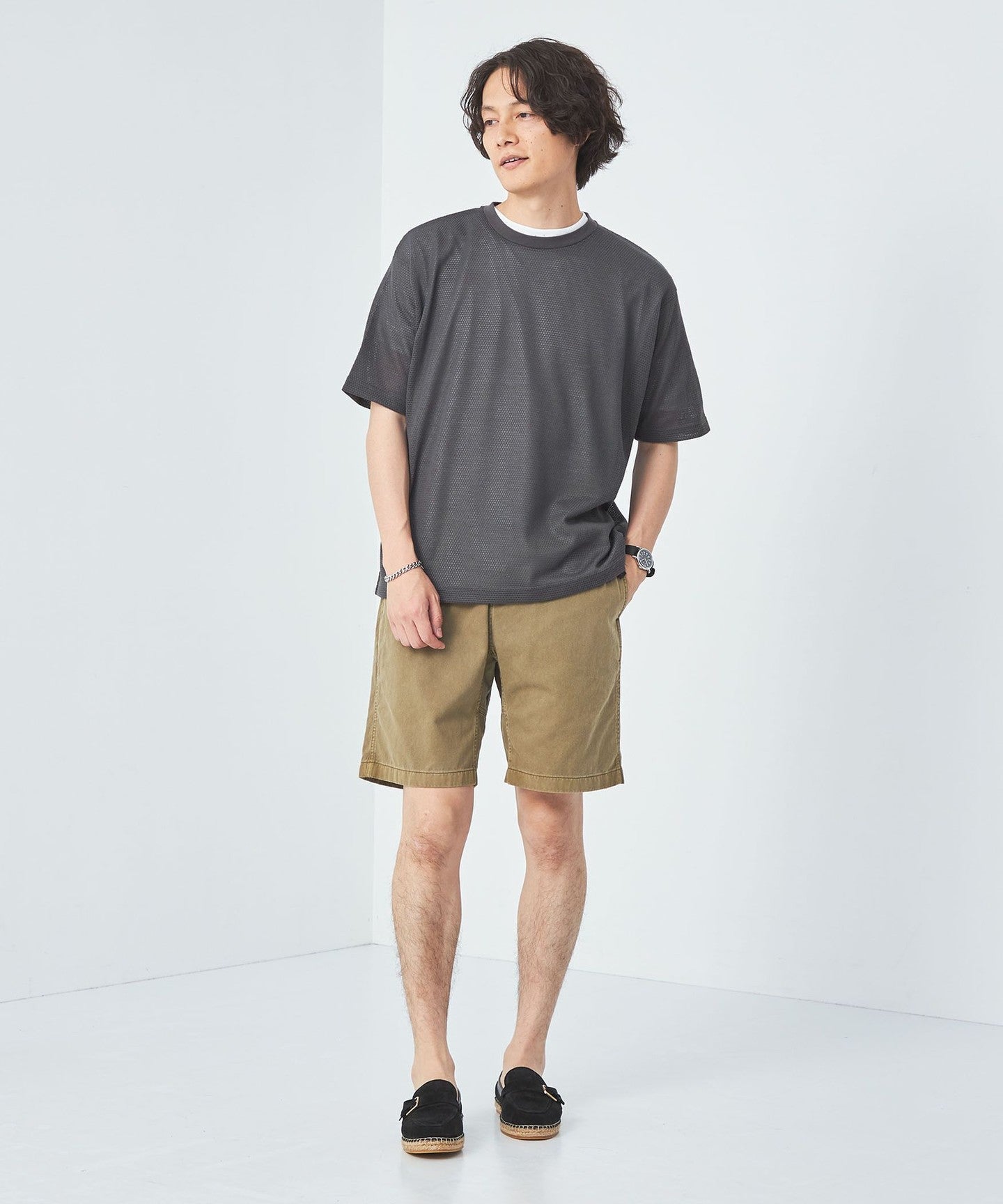The balance between the loose silhouette mesh T-shirt and regular size jersey T-shirt is excellent.