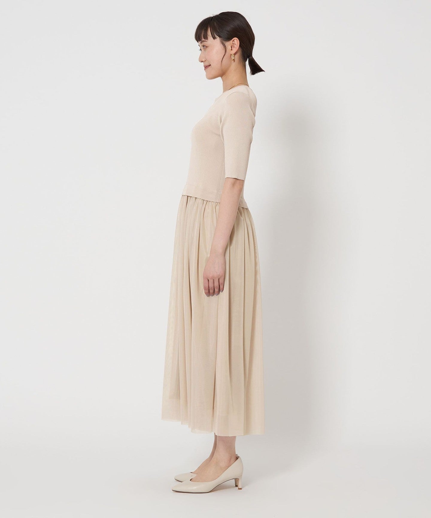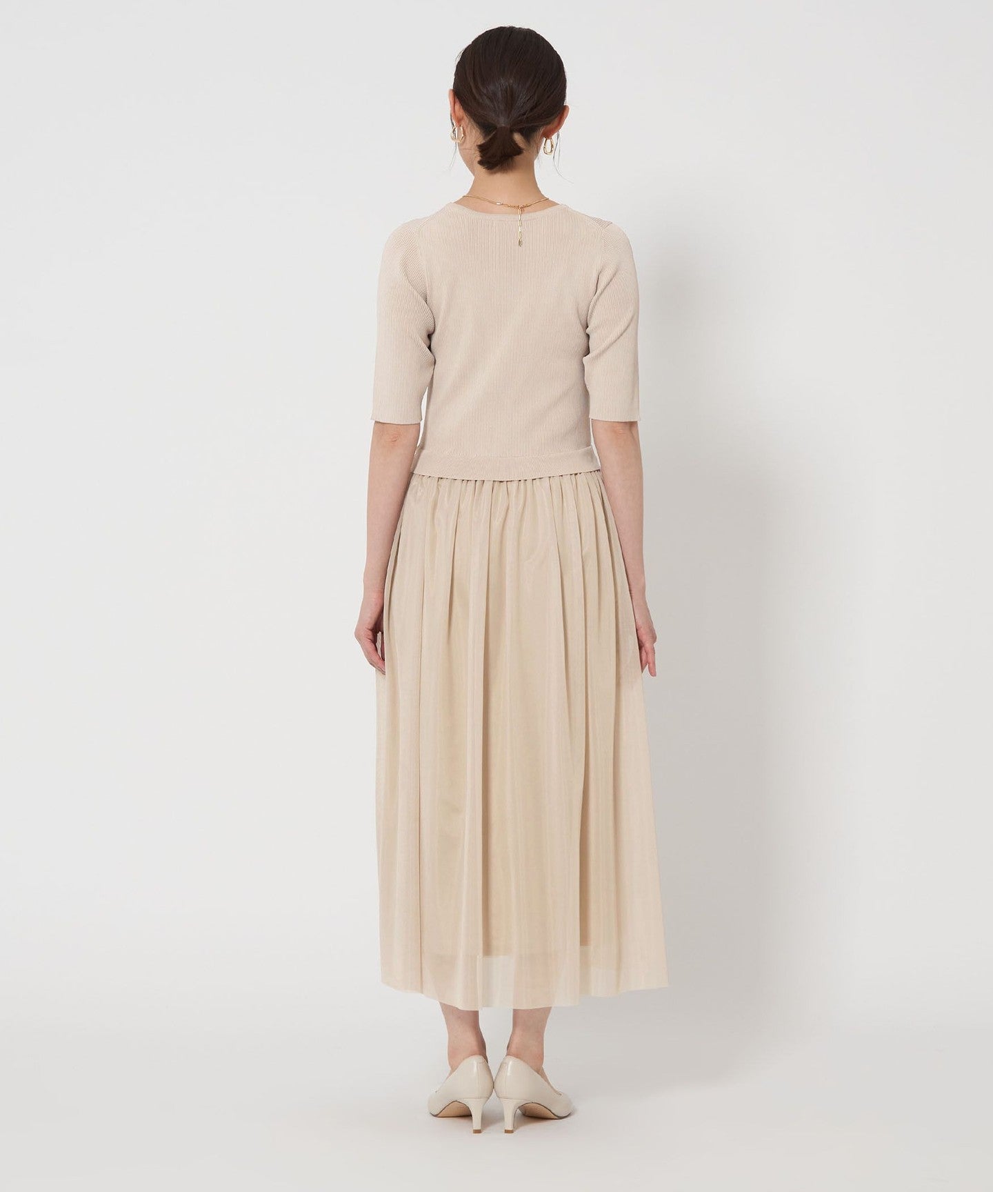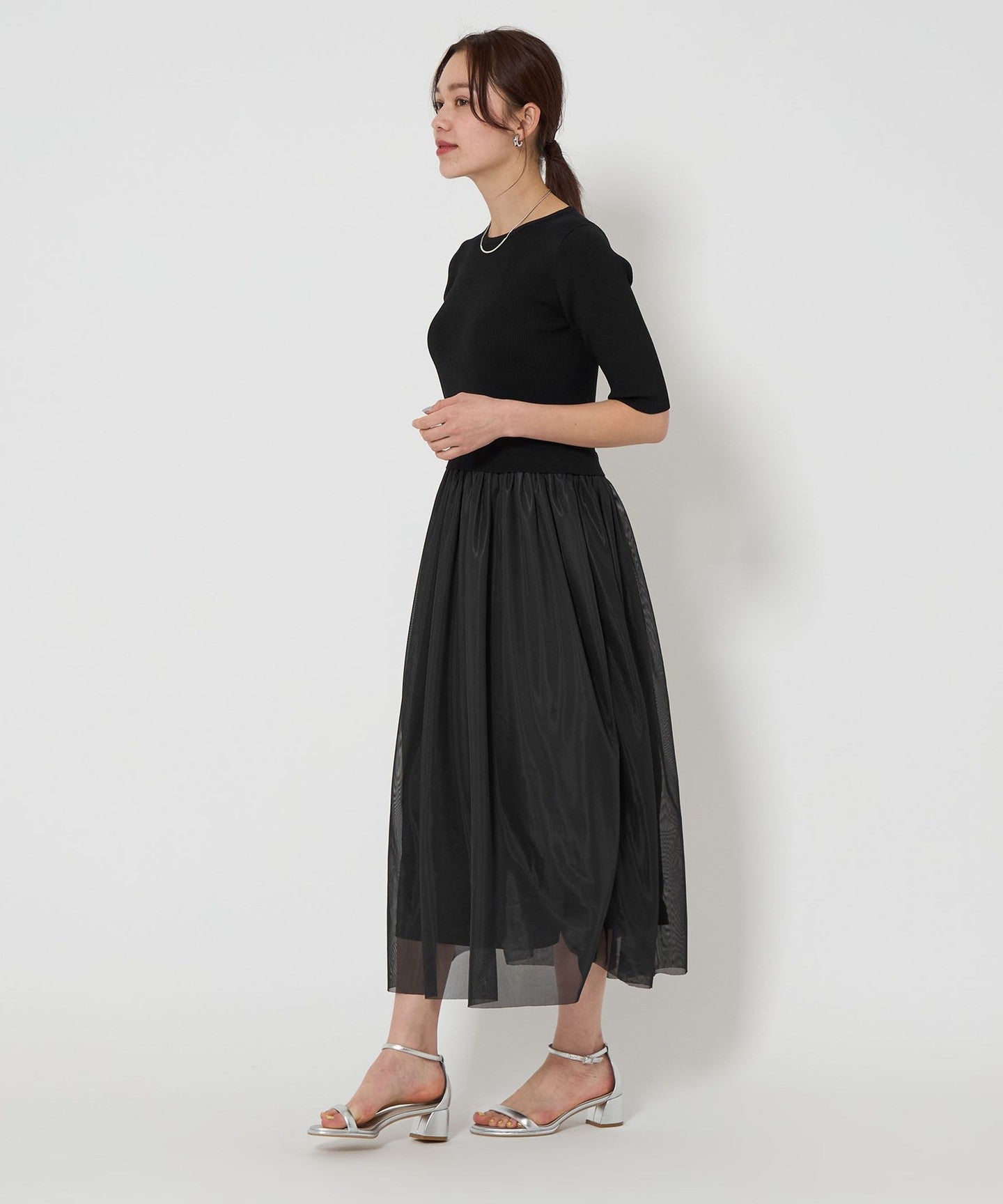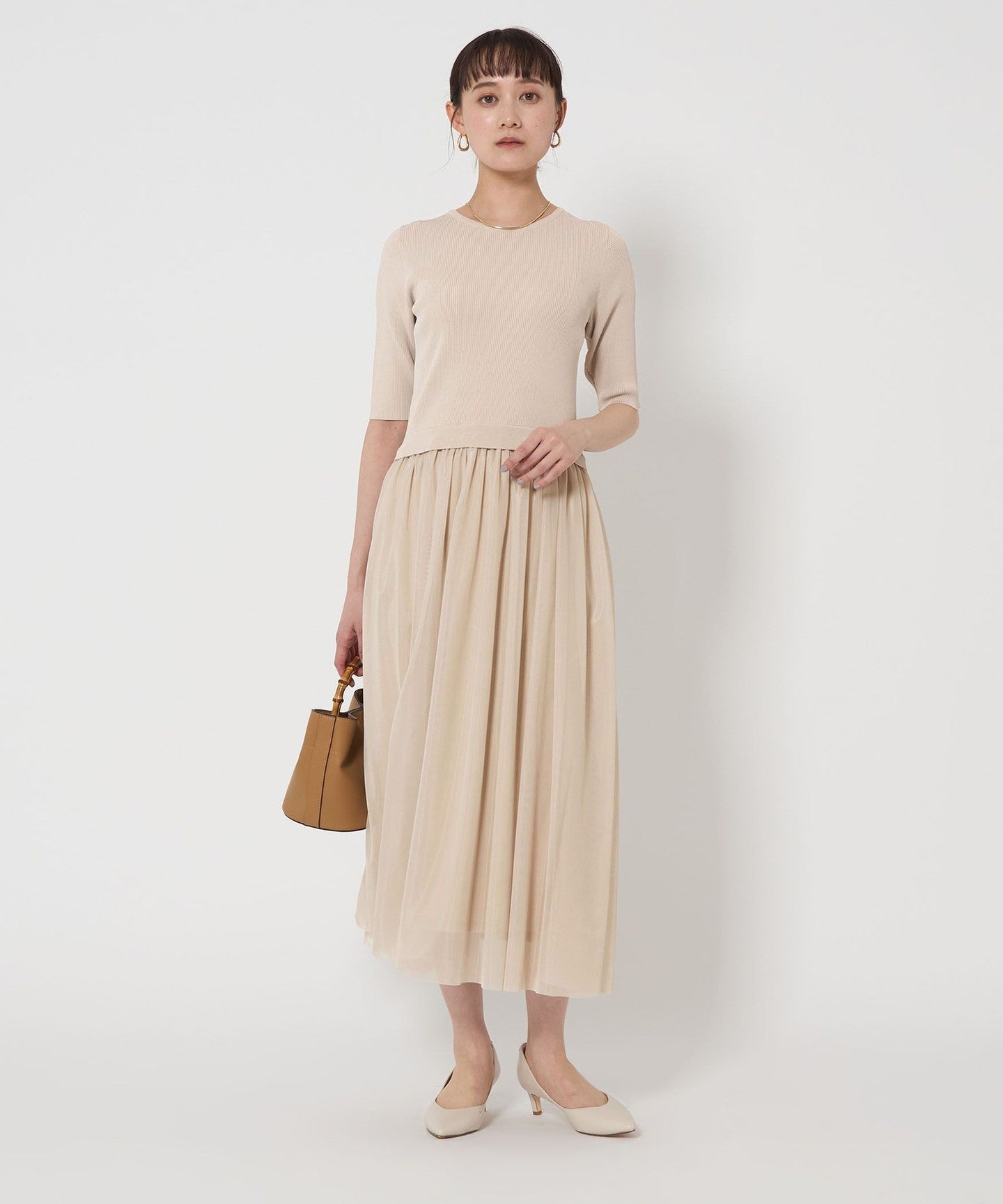 The upper body is made of knit material and the skirt is made of soft tulle material.
